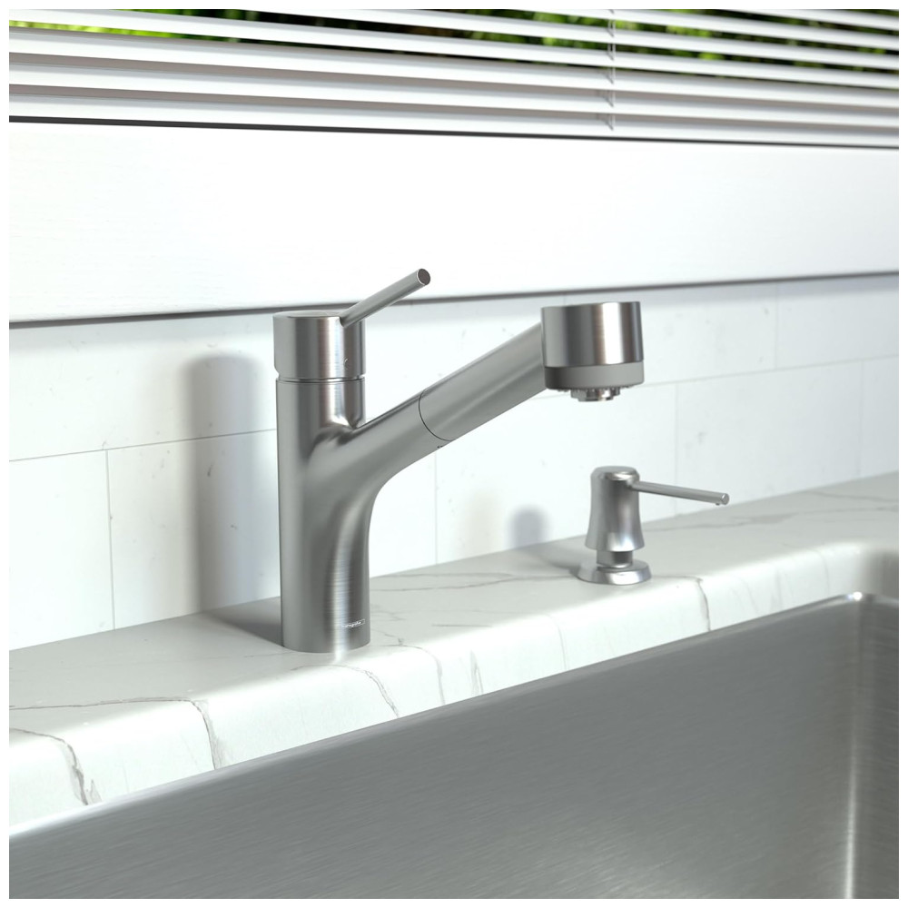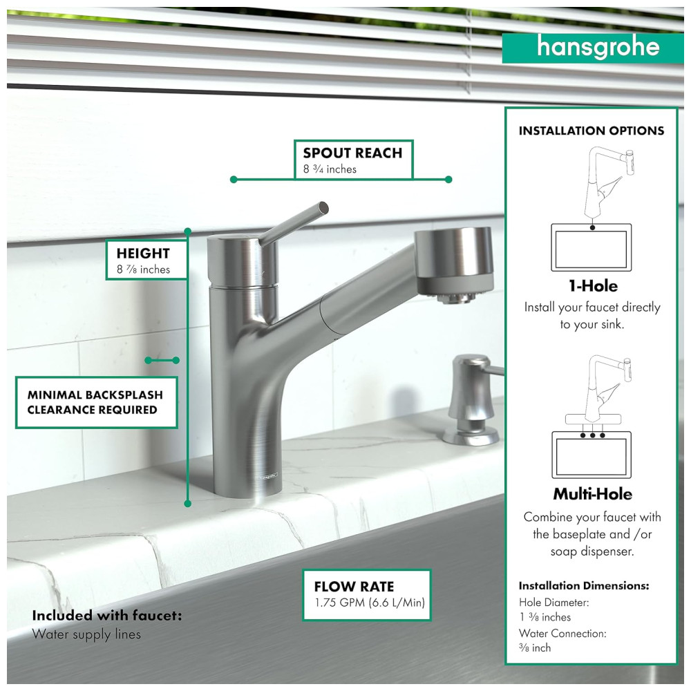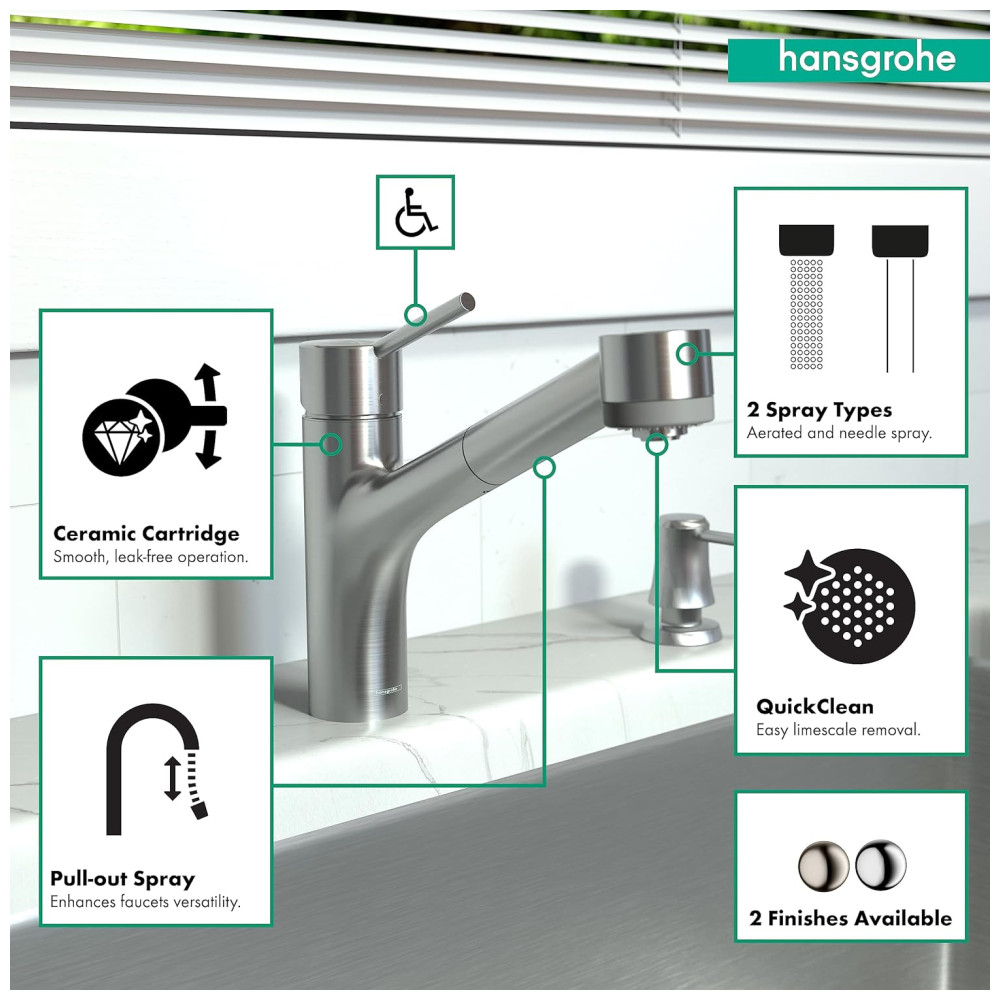 A torneira de cozinha Hansgrohe Talis S em aço Optik 06462860 é a escolha perfeita para quem busca qualidade, design e desempenho em uma torneira de cozinha. Com uma variedade de modelos e estilos, a Hansgrohe oferece torneiras com belo design, durabilidade superior e recursos exclusivos de uso intuitivo. A engenharia alemã garante uma vida útil de operação consistente e confiável, além de contar com materiais resistentes e fáceis de limpar. Com a bica extraível de alcance estendido, bica giratória de 150 graus e dois modos de pulverização, tarefas de cozinha nunca foram tão fáceis. A instalação pode ser feita sobre configurações de bancadas multifuros existentes e as mangueiras de conexão de tubo padrão de 38 polegadas 96 cm estão incluídas. A torneira possui fluxo de água compatível com baixaFlow de 1,75 GPM e sprays arejados e de agulha, causando menos respingos do que as torneiras tradicionais. A placa de base é vendida separadamente e a Hansgrohe recomenda que um encanador licenciado faça a instalação.
