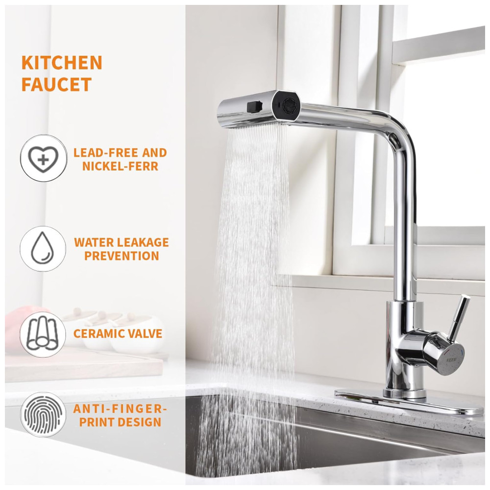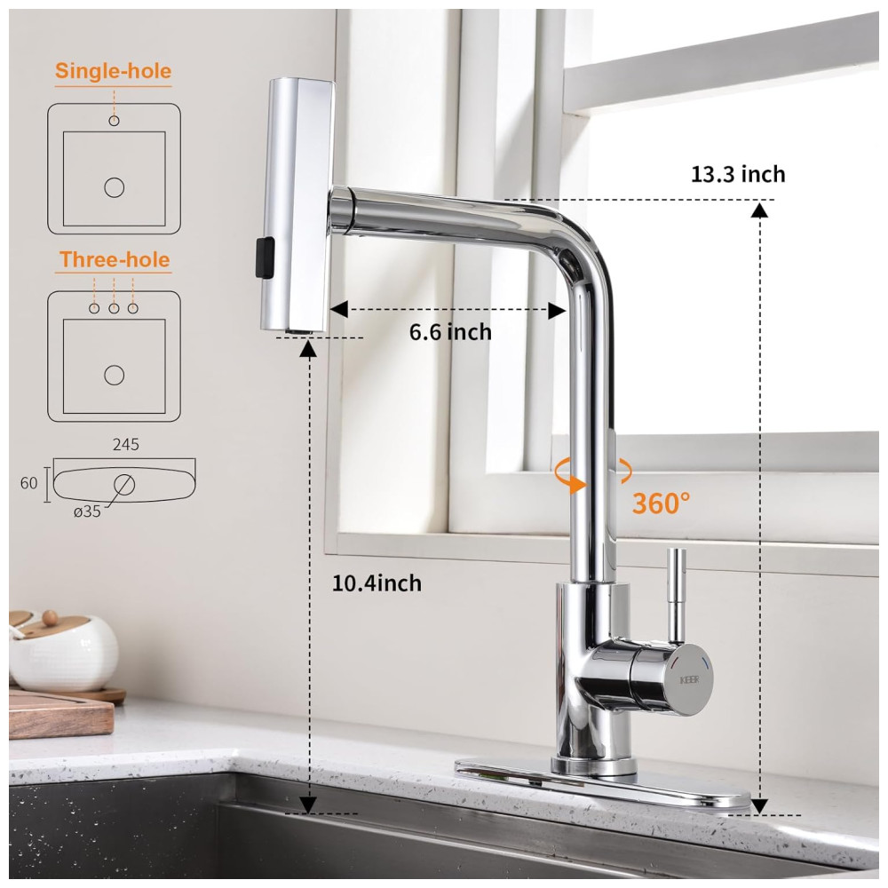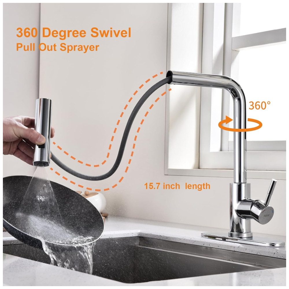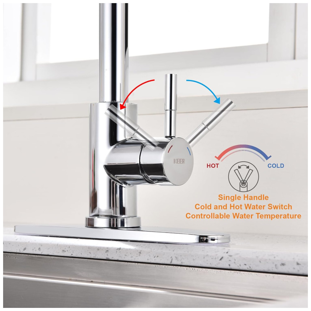 A torneira de cozinha KEER combina operação intuitiva com uma mão com construção robusta em aço inoxidável. Seu design elegante com alça única permite multitarefas, enquanto o aço inoxidável de qualidade comercial garante anos de serviço de cozinha confiável e estético.