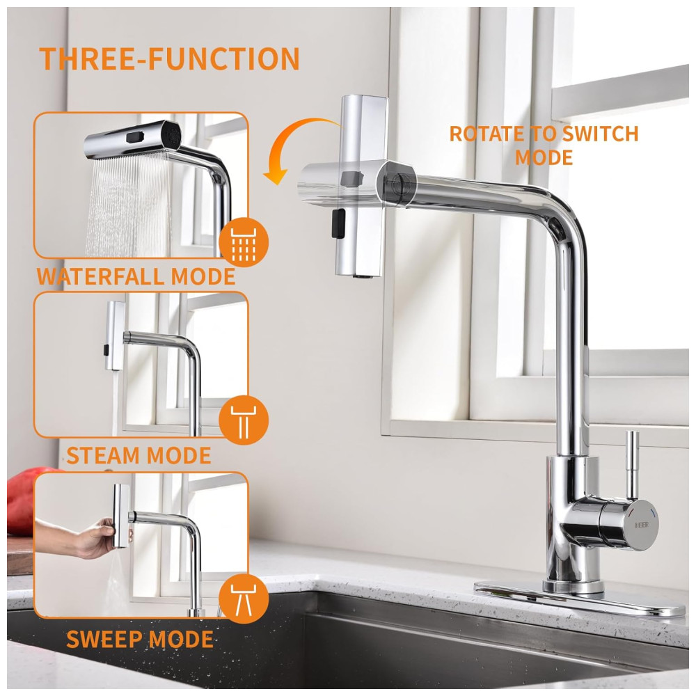 A torneira de cozinha KEER oferece três modos de pulverização avançados Fluxo para enchimento preciso, Varredura para lavagem eficiente de louça e Cascata para enxágue delicado. É fácil alternar entre os modos com uma rotação rápida do bico ou pressionando um botão, proporcionando uma experiência de cozinha conveniente e versátil.