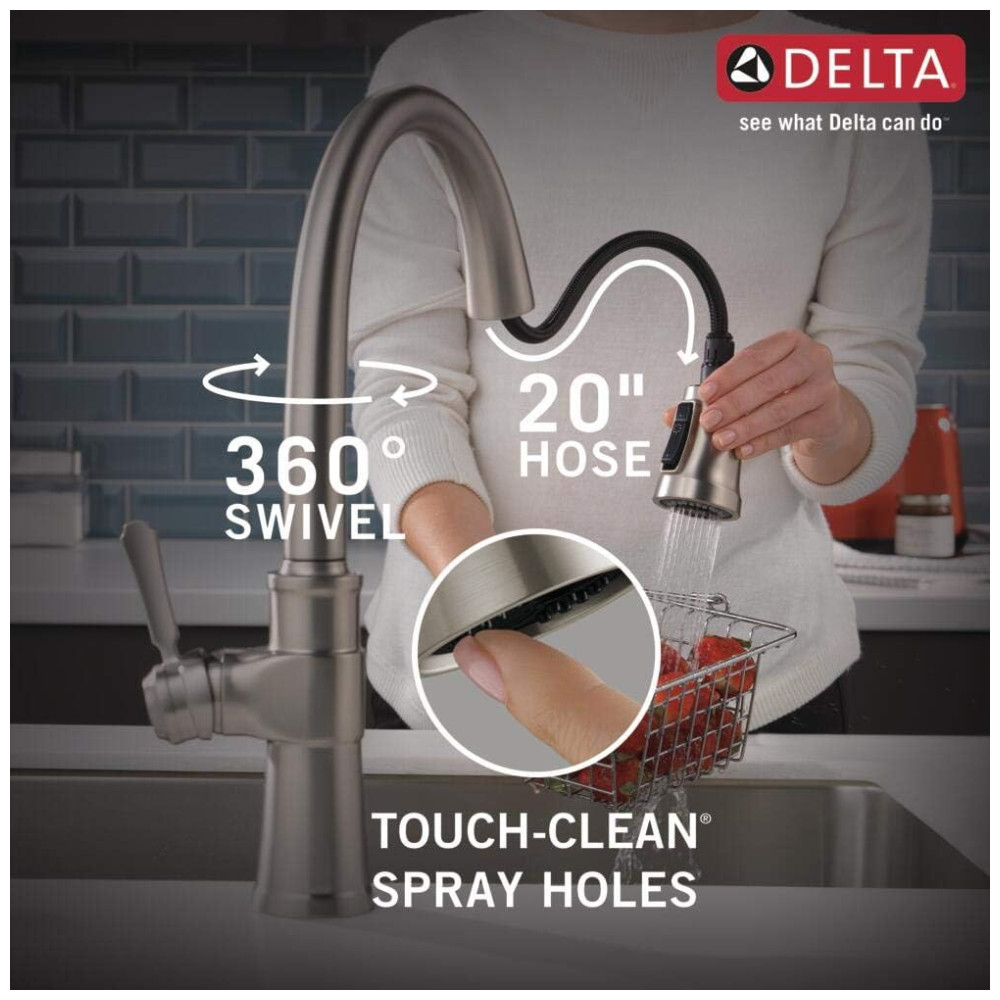 A torneira Delta possui tecnologia avançada para oferecer uma experiência de uso mais eficiente e prática na cozinha. Com o encaixe magnético MagnaTite Docking, o pulverizador é mantido no lugar por meio de um ímã poderoso, evitando quedas e garantindo precisão no uso. A tecnologia ShieldSpray oferece um jato concentrado que elimina sujeiras teimosas e um escudo de água que contém respingos, tornando a limpeza mais fácil e rápida. Além disso, a tecnologia SpotShield ajuda a manter a torneira limpa por mais tempo, resistindo a manchas de água e impressões digitais. A instalação é simples e pode ser feita em configurações de furo único, 2, 3 ou 4 furos, com tudo o que você precisa reunido em uma caixa, incluindo uma placa de deck opcional, dispensador de sabão e linhas de fornecimento InnoFlex PEX.