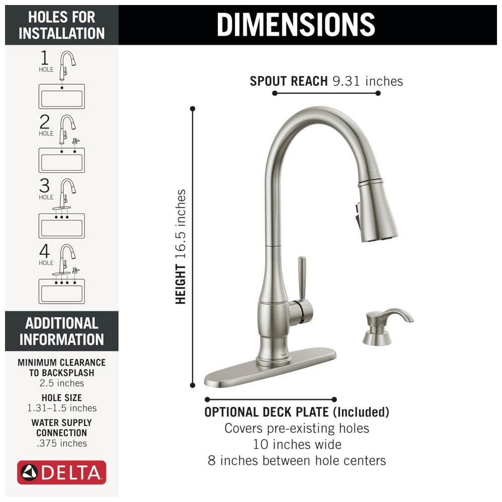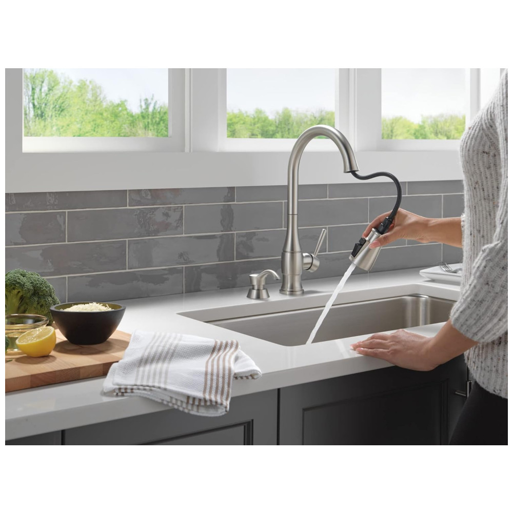 Torneira Cozinha com Dispensador de Sabão e Pulverizador Pull Down Magnético Acabamento Spotshield Delta Hazelwood 19831Z-SPSD-DST Níquel Escovado