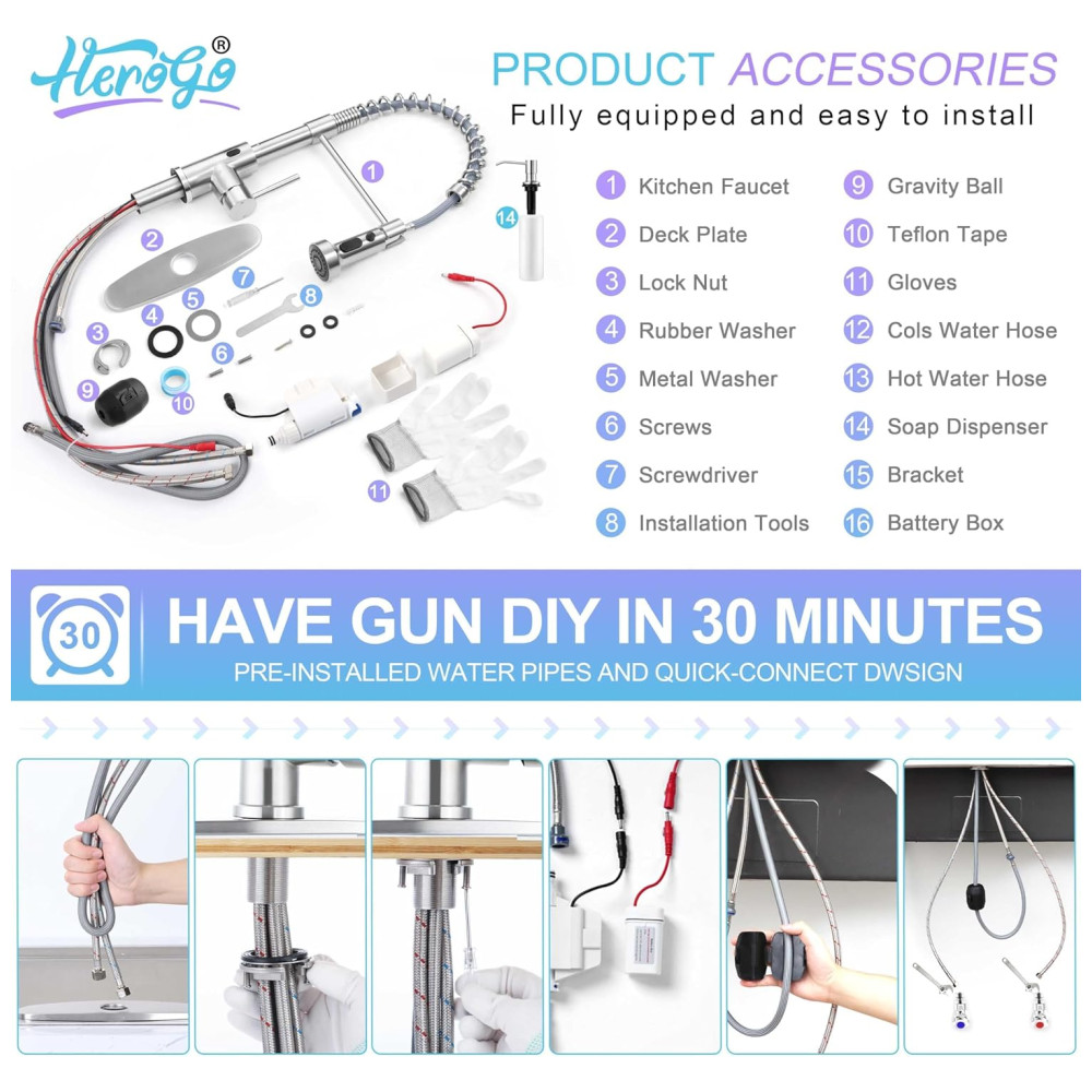 A torneira de pia de cozinha Herogo é feita de aço inoxidável SUS3041810 sólido, com mangueira interna PEX de qualidade alimentar, sem chumbo e saudável para o uso diário. O cartucho de cerâmica premium passou em testes de 500.000 ciclos, o que garante um desempenho profissional de durabilidade sem gotejamento. O design da torneira é conveniente e se integra ao sensor de movimento, permitindo o controle através do modo de ativação dupla, que pode atender às diversas necessidades dos usuários. O sensor infravermelho pode ser removido quando não é necessário ou quando a energia acaba. A torneira possui um design simples e moderno, que combina facilmente com várias decorações de casa e pias de cozinha, sendo ideal para cozinhas abertas, cozinhas de restaurantes, trailers, quintais ou fazendas. A torneira possui um sensor rápido e economiza água, adotando a indução infravermelha de alta velocidade, tornando a mais estável, precisa, com uma distância de detecção e resposta rápida. O pulverizador de três modos bico flexível oferece uma escolha de fluxo aerado para limpeza e enchimento sem respingos, um spray poderoso para enxágue, atendendo a vários requisitos de uso. O bico giratório de 360 graus fornece uma gama completa de lavagens para sua pia de cozinha, permitindo limpar cantos mais profundos da pia com mais eficiência. A instalação é fácil e pode ser realizada pelo próprio usuário, seguindo o guia de instalação incluído no pacote, sem a necessidade de contratar um encanador, o que pode levar 30 minutos. O pacote inclui uma torneira de cozinha pré montada, placa de deck, dispensador de sabonete de 500 ml e ferramentas de instalação, altura total 41 cm, altura do bico 11 cm, comprimento das mangueiras de água 80 cm 38 H C, mangueiras longas combinam com a maioria dos gabinetes, placa de 25 cm para instalação de 1 ou 3 furos.