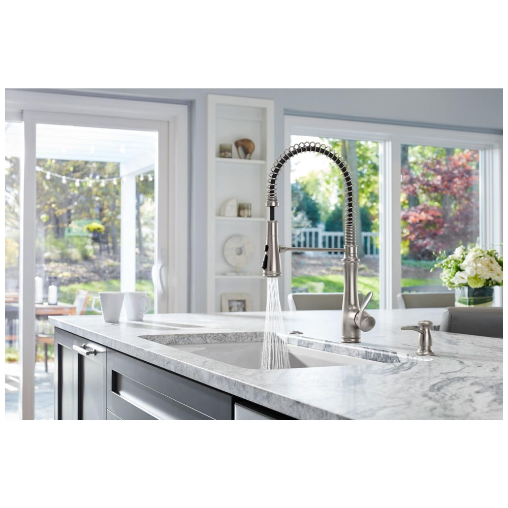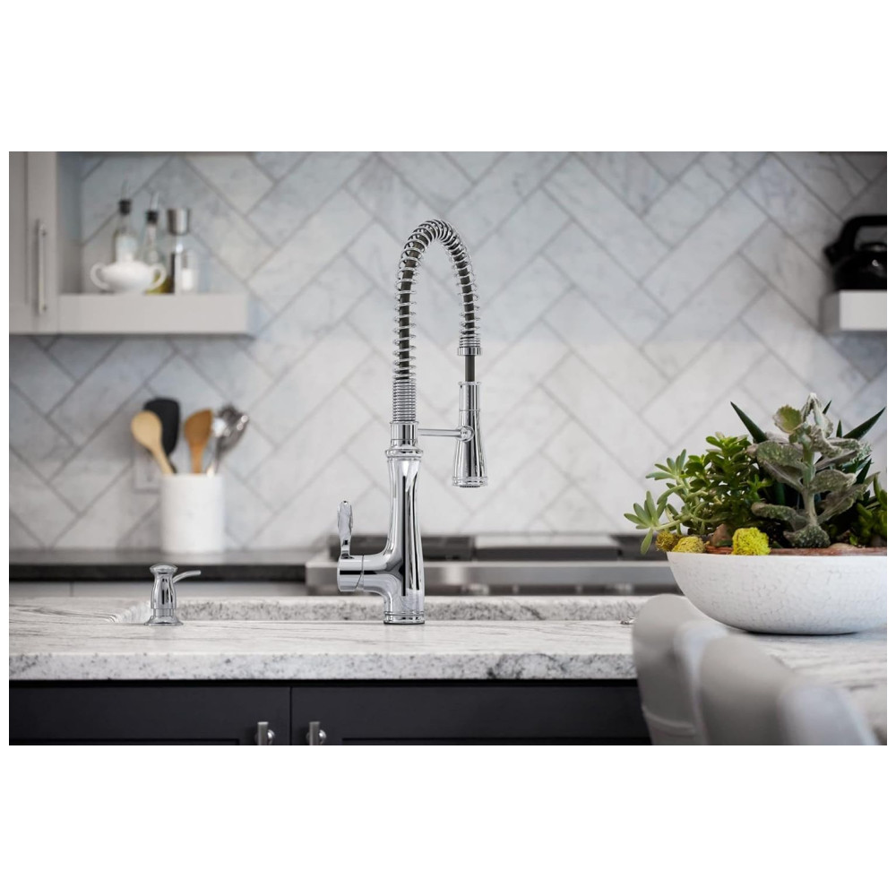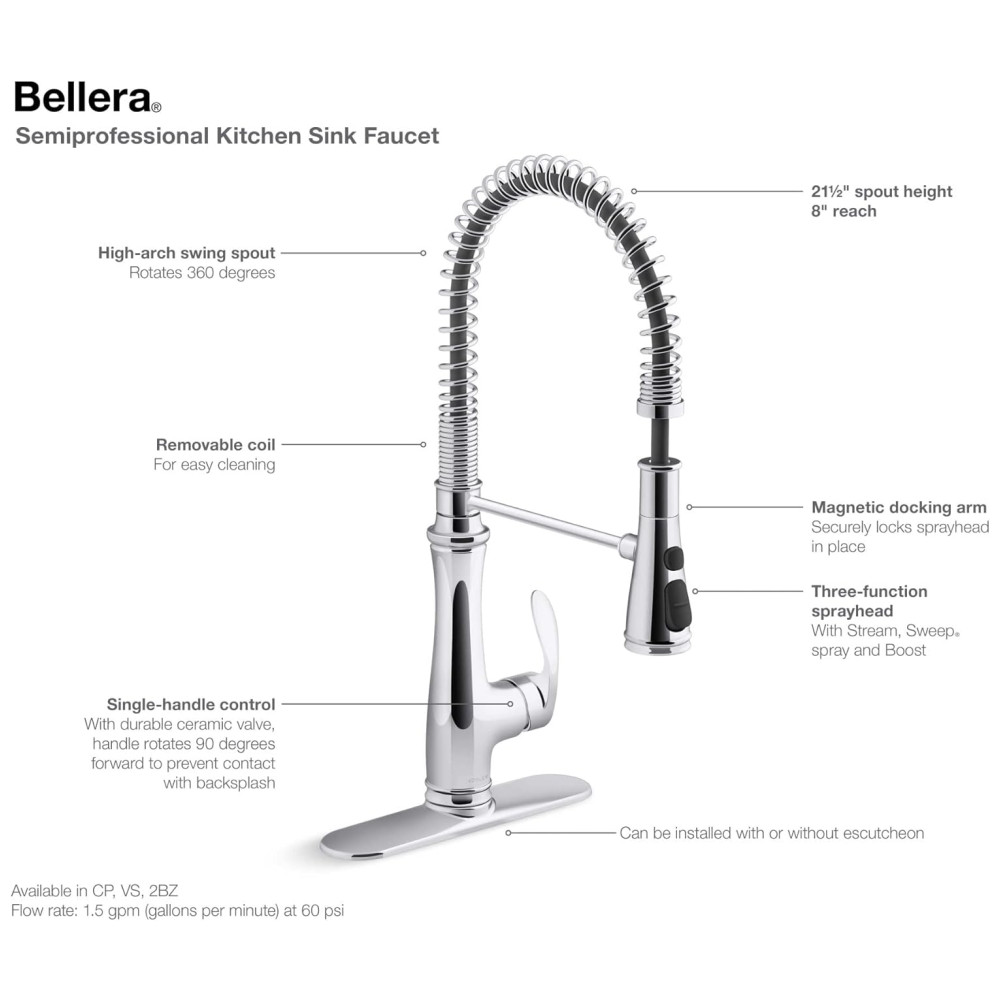 Descubra a torneira semi-profissional KOHLER Bellera, projetada para trazer estilo e funcionalidade profissional à sua cozinha. Com uma mangueira fácil de limpar e bobina removível, além de uma rotação de alça de 90 graus que evita o contato com o backsplash, esta torneira é a solução perfeita para uma cozinha prática e moderna. O spray de varredura cria uma poderosa lâmina de água, ideal para limpeza eficiente, com uma taxa de fluxo máxima de 1,5 gpm (5,7 lpm) a 60 psi (4,14 bar).