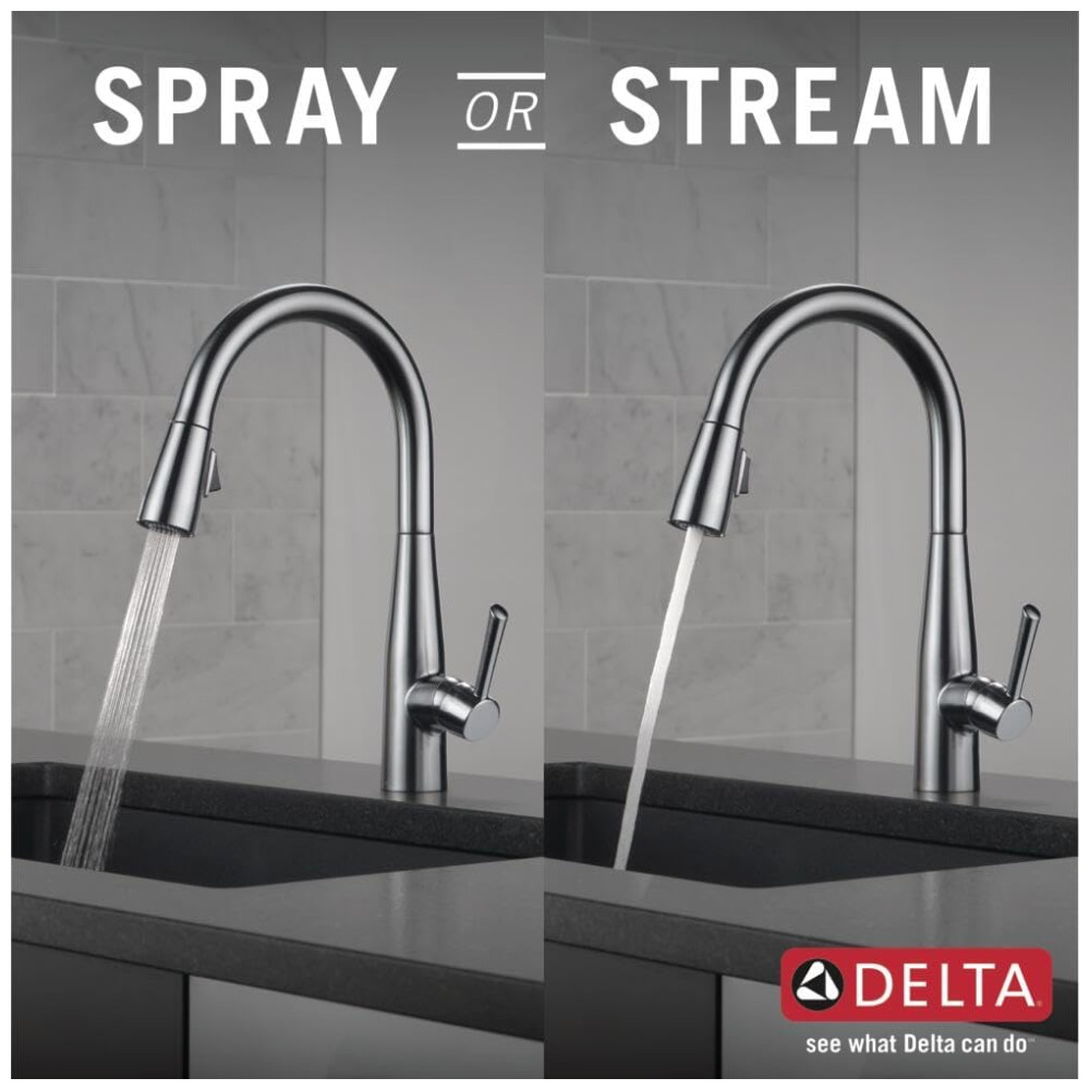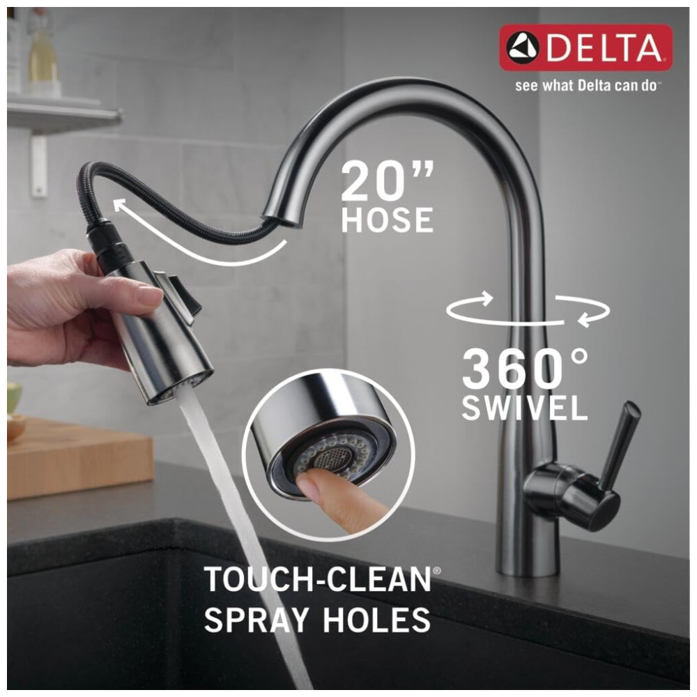 A torneira Delta MagnaTite Docking possui um encaixe magnético que mantém o bastão de pulverização da torneira no lugar com precisão, evitando que ele caia quando não estiver em uso. Além disso, a tecnologia DIAMOND Seal patenteada reduz os pontos de vazamento e aumenta a vida útil da torneira, sendo duas vezes mais durável do que o padrão da indústria. A torneira também possui orifícios de spray TouchClean, que facilitam a limpeza do acúmulo de cálcio e calcário com um simples toque. É fácil de instalar, podendo ser adaptada para configurações de furo único ou 3 furos, incluindo uma placa de convés opcional para instalação de 3 furos e linhas de suprimento InnoFlex PEX integradas à torneira. O design de pescoço de ganso de arco alto gira 360 graus com uma mangueira retrátil de 50 cm para maior conveniência durante as tarefas diárias da cozinha. A torneira é eficiente em relação ao consumo de água, economizando até 20 em comparação com outras torneiras, sem comprometer o desempenho. Além disso, a torneira Delta está em conformidade com a legislação sem chumbo e atende ou excede os requisitos de desempenho e segurança da indústria.