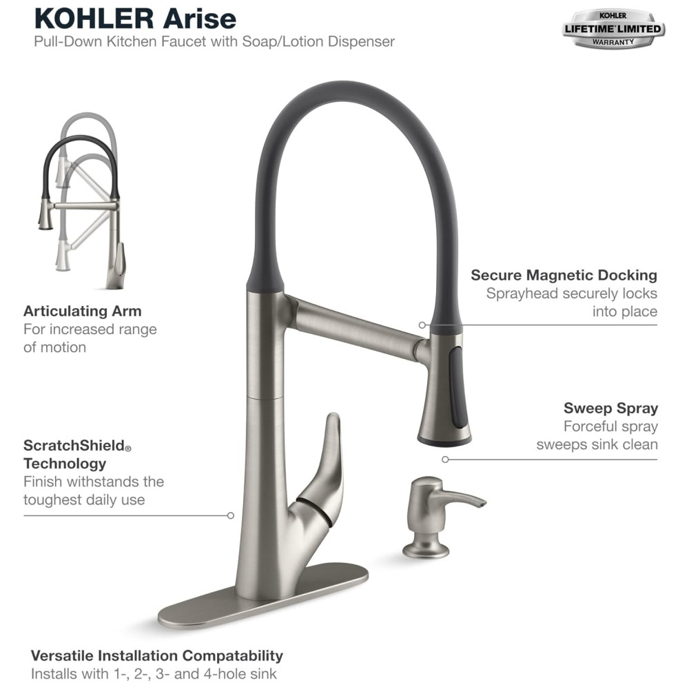 Torneira Cozinha com Pulverizador Pull Down Sprai Dispensador de Sabão e Braço Articulado KOHLER R77764-SD-VS Arise Inoxidável Vibrante