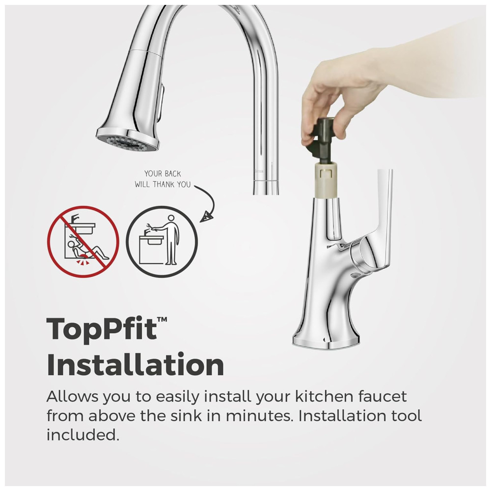 Instalação Rápida com TopPfit: Instale sua torneira em minutos com a Ferramenta de Instalação TopPfit. O sistema Pfast Connect conecta as linhas de abastecimento de água com um simples clique.