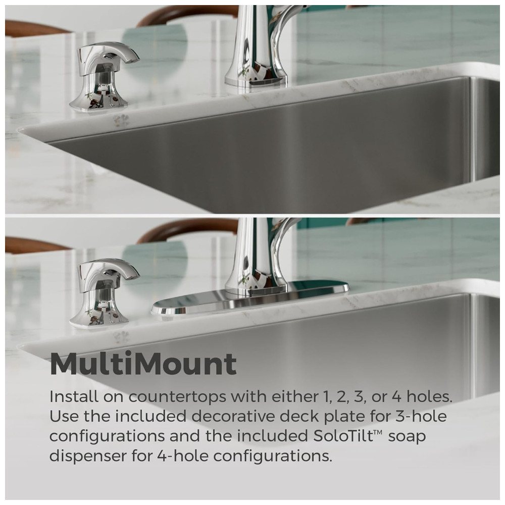 Dispensador de Sabão SoloTilt: A cabeça de bomba basculante permite dispensar sabão com um simples movimento do polegar, mesmo com as mãos ocupadas.