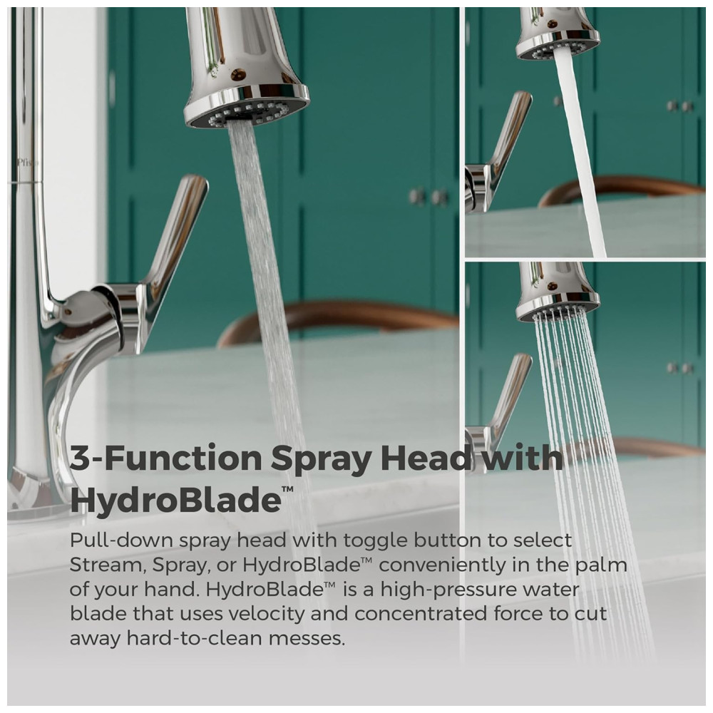 Pulverizador Retrátil HydroBlade: Com alta pressão e três configurações de água, limpe até as bagunças mais difíceis com facilidade. Os bicos de fácil limpeza permitem a remoção rápida de depósitos minerais.