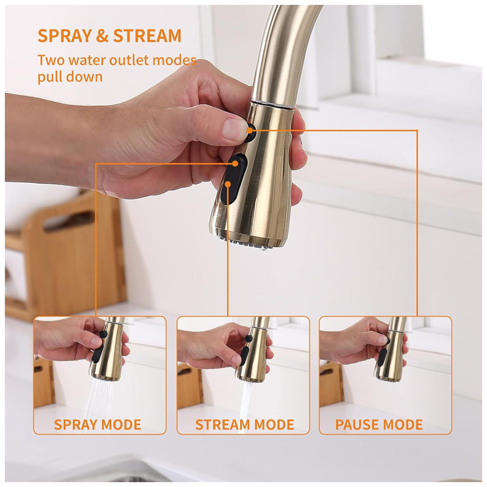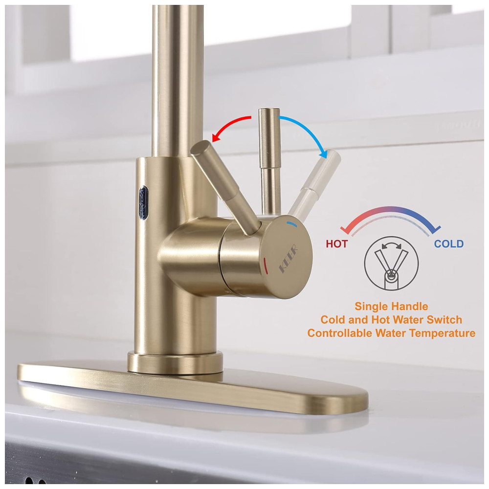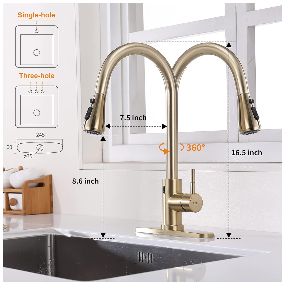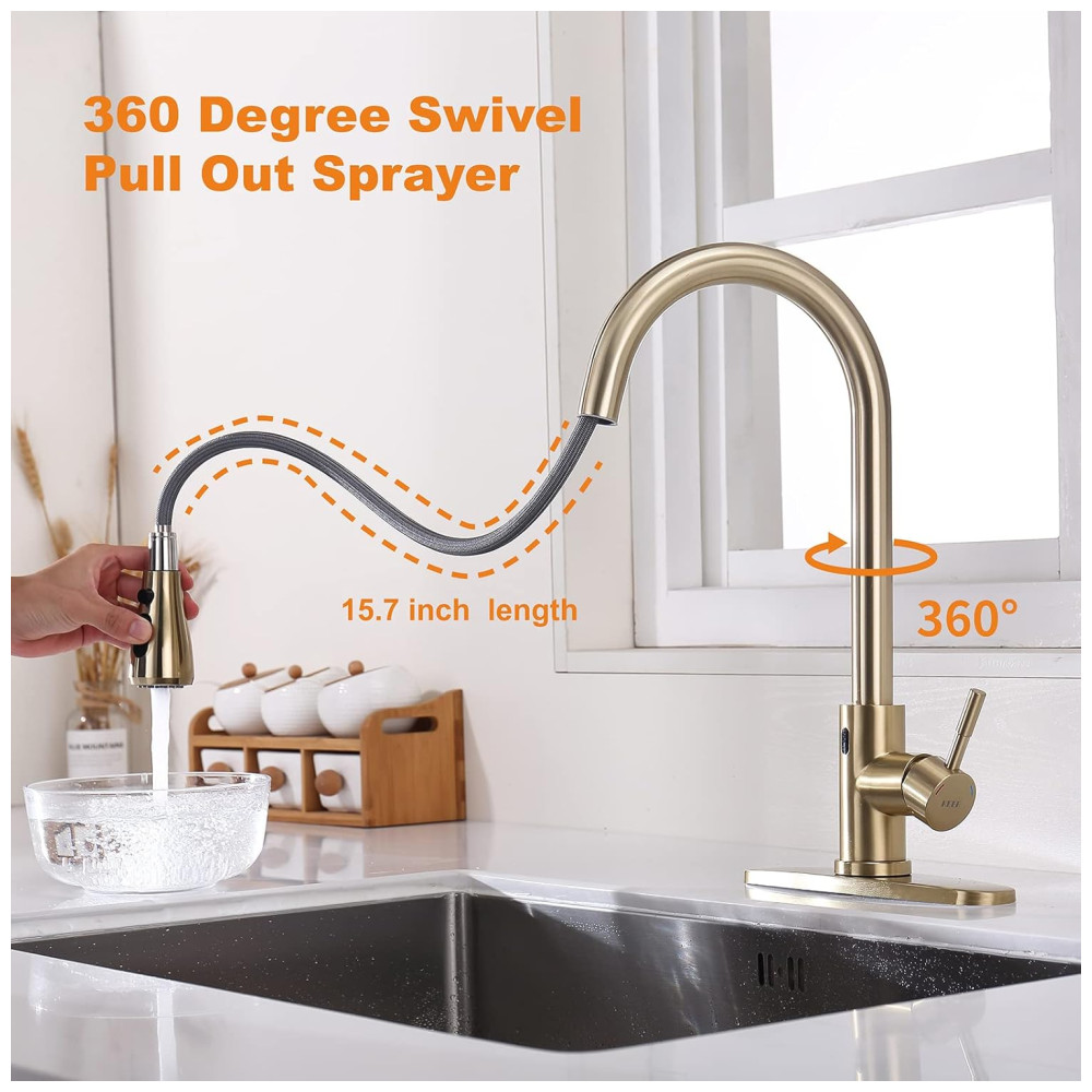 A torneira de pia de cozinha com sensor infravermelho de movimento oferece praticidade sem toque, permitindo que você ligue e desligue a torneira dentro da faixa de 8 cm sem precisar usar as mãos. Isso torna a tarefa mais higiênica e conveniente para você. Além disso, a torneira de pia de cozinha é versátil e adequada para quase todas as pias de cozinha, incluindo pias de armário, pias suspensas, pias de RV ou pias de fazenda. A torneira também vem com um chuveiro retrátil e uma placa de deck para 1 ou 3 furos, além de um dispensador de sabão.