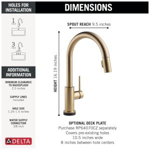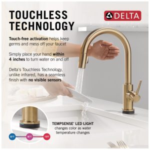 A coleção Trinsic Kitchen apresenta um design moderno e elegante, combinando tecnologia sem toque para uma experiência mais higiênica na cozinha. Com a tecnologia Touch2O, é possível controlar a água de três maneiras por aproximação da torneira, batendo na superfície ou usando a alça padrão. A luz LED TempSense muda de cor para indicar a temperatura da água. O MagnaTite Docking usa um ímã integrado para manter o bastão de pulverização da torneira no lugar. As torneiras Delta com tecnologia Diamond Seal possuem um design patenteado que reduz os pontos de vazamento, são fáceis de instalar e duram o dobro do padrão da indústria. Escolha entre Touch2O com Touchless ou Touch2O apenas. A ativação Touchfree ajuda a manter a torneira limpa, reduzindo a necessidade de limpeza. A ativação sem toque é feita colocando a mão a 10 cm da superfície da torneira. O corte automático do fluxo de água após quatro minutos ajuda a economizar água. A instalação é fácil e pode ser feita como um projeto DIY, com vídeos de instalação passo a passo disponíveis no YouTube da Delta Faucets.