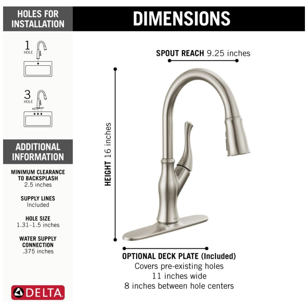 A coleção Ophelia Kitchen apresenta um estilo tradicional com detalhes curvos e tecnologia Delta Touch2O, que permite ligar e desligar a torneira com um simples toque em qualquer lugar da bica ou alça com o pulso ou antebraço. A luz LED Delta TempSense muda de cor para alertar sobre a temperatura da água e a tecnologia Delta MagnaTite Docking usa um ímã poderoso para encaixar o pulverizador pull down no lugar e mantê lo ali quando não estiver em uso. A tecnologia Delta ShieldSpray limpa com precisão semelhante à do laser, ao mesmo tempo que contém sujeira e respingos, enquanto a tecnologia Delta SpotShield ajuda a manter a torneira mais limpa por mais tempo, resistindo a manchas de água e impressões digitais. As torneiras de cozinha Delta com tecnologia DIAMOND Seal dura 2X mais tempo do que o padrão da indústria e as torneiras para pia de cozinha com orifícios de spray TouchClean permitem que você limpe facilmente o acúmulo de cálcio e cal com o toque de um dedo. A instalação é fácil e pode ser feita em configurações de pia de cozinha de furo único ou de 3 furos, com tudo o que você precisa reunido em uma caixa, incluindo placa de deck opcional para instalação de 3 furos e linhas de abastecimento InnoFlex PEX integradas para um ponto de vazamento a menos.