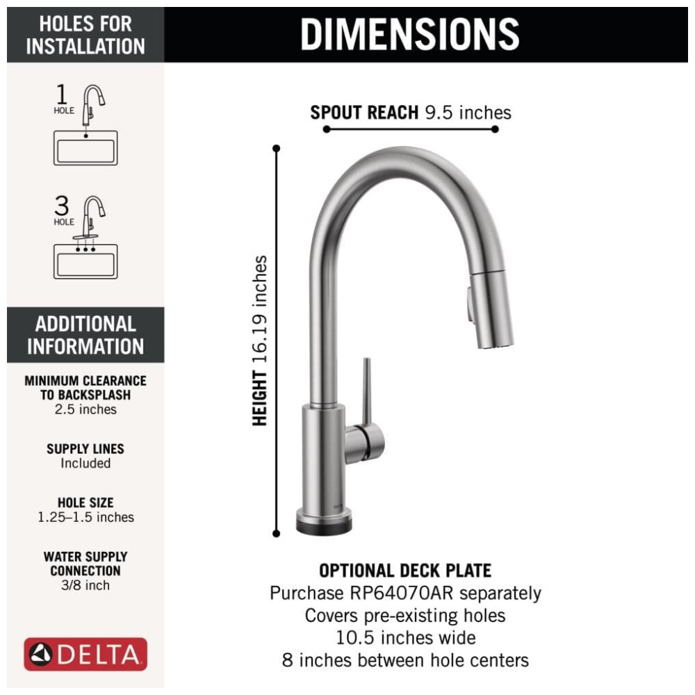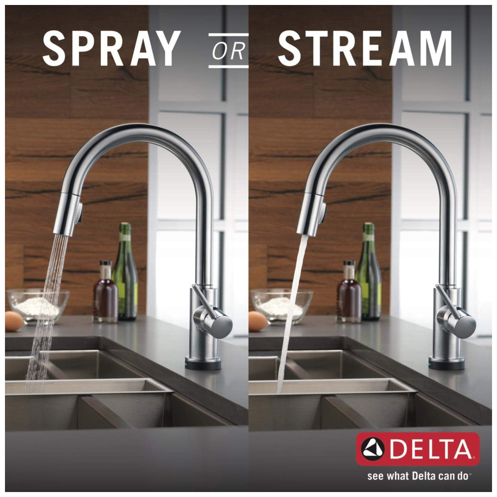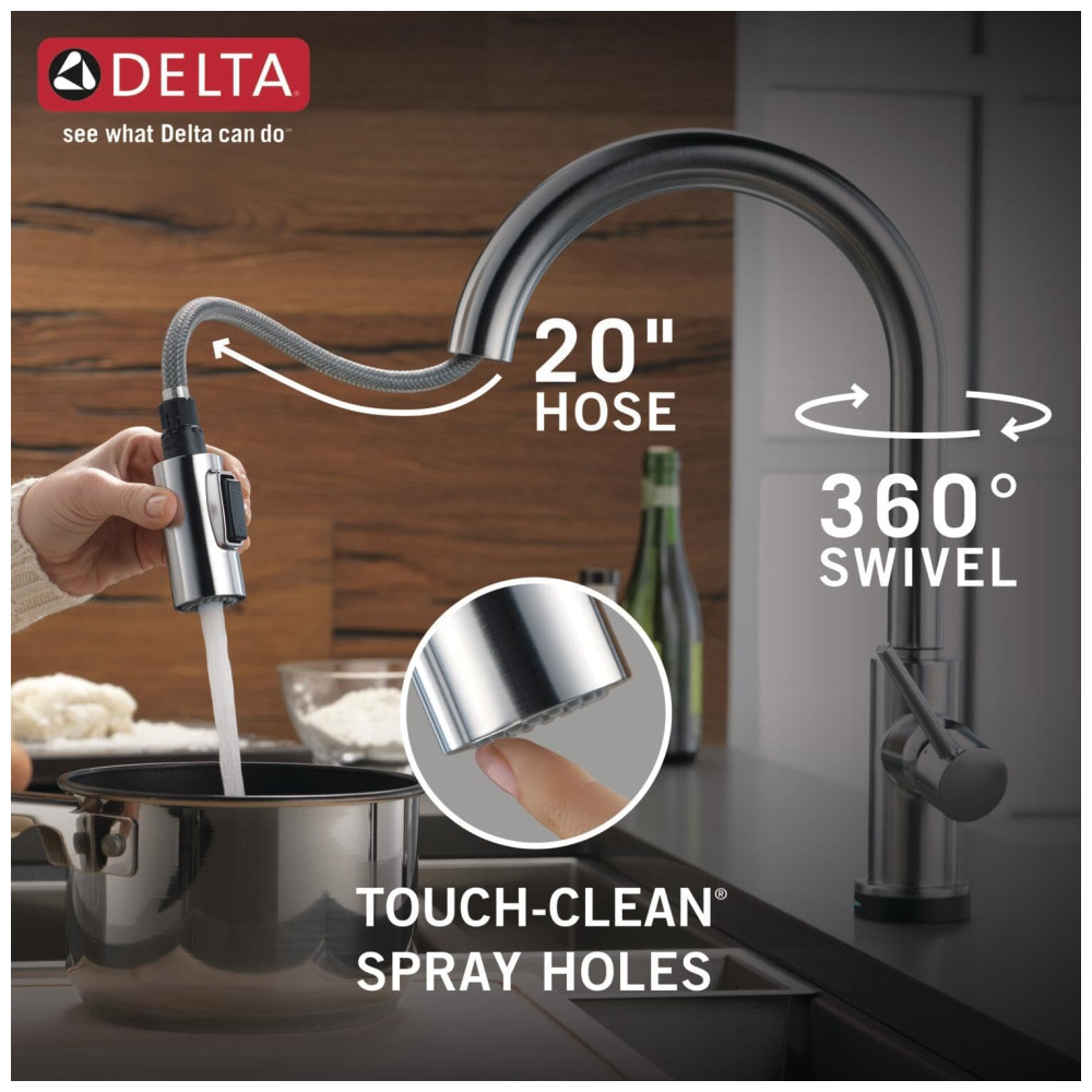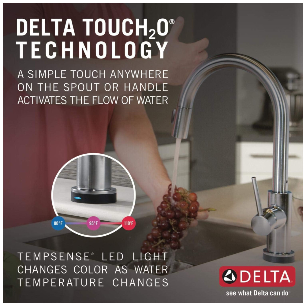 A torneira Delta é projetada para facilitar sua vida na cozinha. Com a tecnologia Delta Touch2O, você pode ativar o fluxo de água com um simples toque em qualquer lugar da bica ou alça, usando o pulso ou antebraço. A luz LED Delta TempSense muda de cor para alertar sobre a temperatura da água e evitar surpresas. O Delta MagnaTite Docking usa um ímã poderoso para encaixar o pulverizador de cozinha no lugar, evitando quedas. As torneiras Delta com tecnologia DIAMOND Seal reduzem os pontos de vazamento e duram duas vezes mais que o padrão da indústria. As torneiras de cozinha com orifícios de spray TouchClean permitem que você limpe facilmente o acúmulo de cálcio e cal com o toque de um dedo. A instalação é fácil, podendo ser feita em furo único ou 3 furos, com a possibilidade de adquirir a placa de deck RP64070AR separadamente. As linhas de abastecimento InnoFlex PEX são integradas à torneira para um ponto de vazamento a menos e estão convenientemente incluídas na caixa. A torneira Delta é fácil de limpar e não requer produtos químicos.