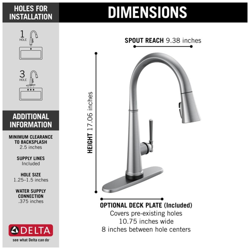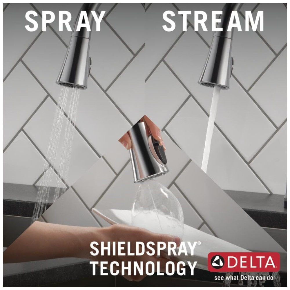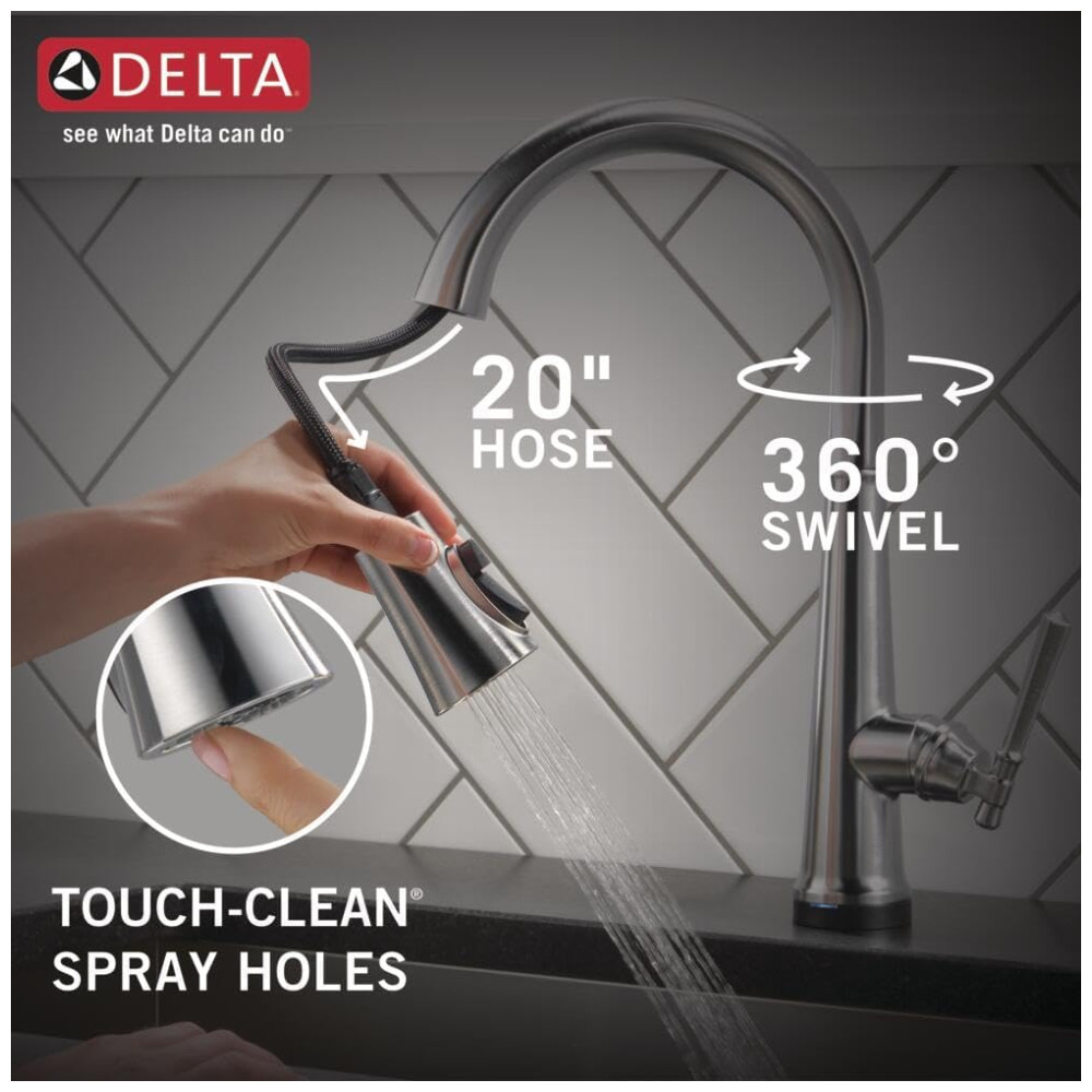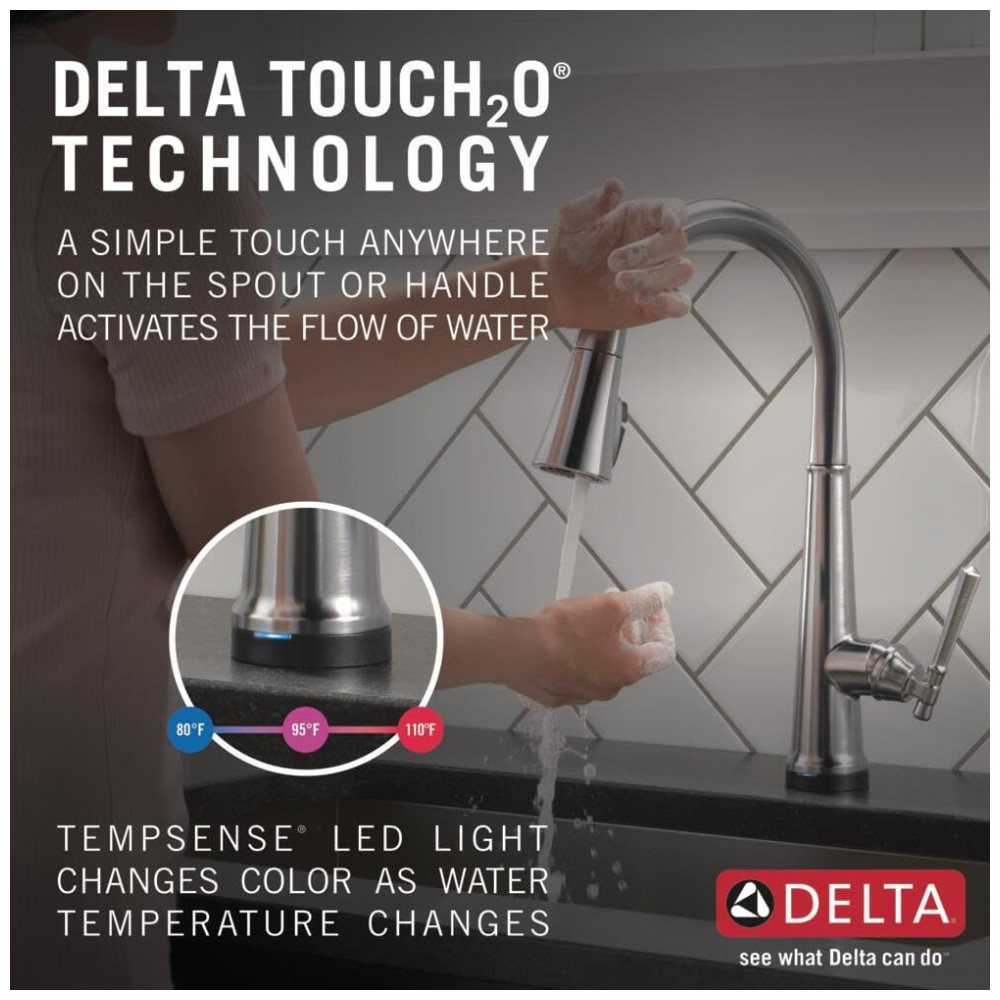 A torneira da Emmeline Kitchen Collections possui um design elegante com saliências em forma de diamante que proporcionam uma sensação de estilo do velho mundo. A tecnologia Delta Touch2O permite que você ligue e desligue a torneira com um simples toque em qualquer lugar da bica ou alça, mesmo com as mãos sujas. A luz LED Delta TempSense muda de cor para alertar sobre a temperatura da água, evitando surpresas desagradáveis. As torneiras para pia de cozinha com orifícios de spray TouchClean permitem que você limpe facilmente o acúmulo de cálcio e cal com o toque de um dedo. A tecnologia Delta ShieldSpray limpa com precisão, contendo sujeira e respingos. O acabamento Delta Lumicoat é resistente a manchas de água e acúmulo de minerais, sendo facilmente limpo sem a necessidade de produtos químicos. As torneiras de cozinha Delta com tecnologia DIAMOND Seal reduzem os pontos de vazamento e duram o dobro do tempo que o padrão da indústria. A instalação é fácil e pode ser feita em furo único ou 3 furos, 20 cm, com tudo o que você precisa incluso na caixa. A tecnologia intuitiva Touch2O detecta a diferença entre um toque e um agarrar, reduzindo as chances de ativação falsa. O MagnaTite Docking usa um poderoso ímã integrado para encaixar o bastão de pulverização da torneira com precisão no lugar e segurá lo ali quando não estiver em uso.