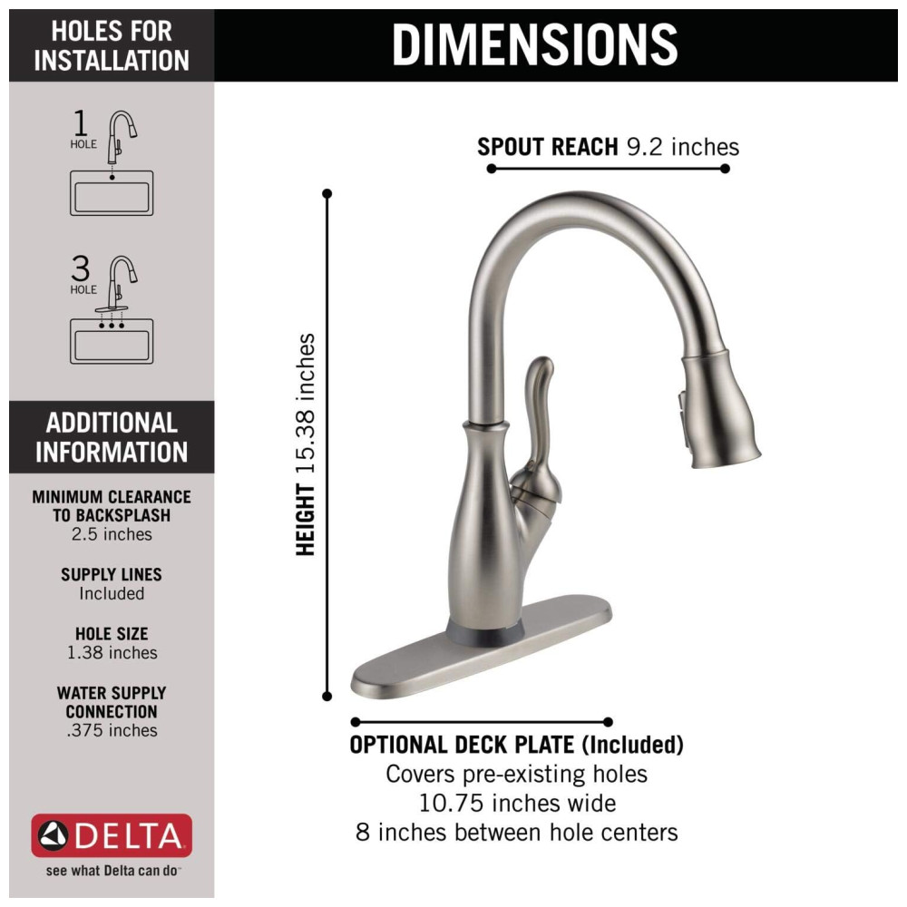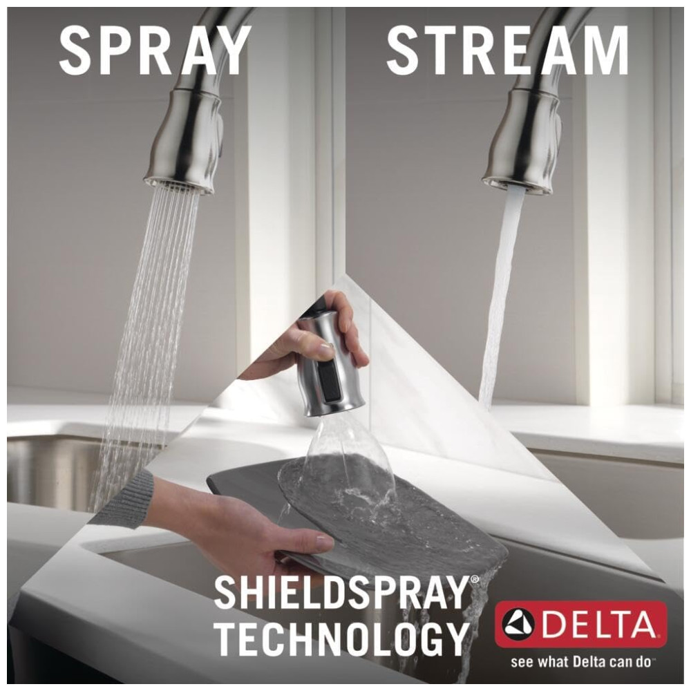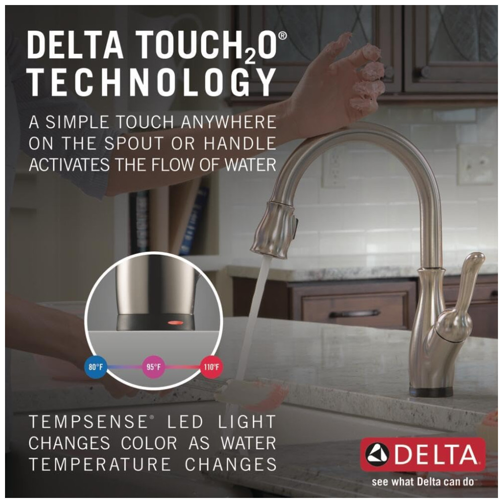 Com a tecnologia Delta Touch2O, a torneira pode ser ativada com um simples toque em qualquer lugar da bica ou alça com o pulso ou antebraço, permitindo que você mantenha suas mãos limpas. A luz LED Delta TempSense muda de cor para alertar sobre a temperatura da água e evitar surpresas ou desconfortos. O Delta MagnaTite Docking usa um ímã poderoso para encaixar o pulverizador de cozinha no lugar e mantê lo lá para que ele não caia com o tempo. A tecnologia Delta ShieldSpray limpa com precisão semelhante à do laser, enquanto contém sujeira e respingos. Um jato concentrado elimina sujeiras teimosas, enquanto um inovador escudo de água contém respingos e limpa a sujeira. A tecnologia Delta SpotShield ajuda a manter sua torneira mais limpa por mais tempo, resistindo a manchas de água e impressões digitais. As torneiras Delta com tecnologia DIAMOND Seal reduzem os pontos de vazamento, são menos complicadas de instalar e duram o dobro do tempo que o padrão da indústria. As torneiras de cozinha com orifícios de spray TouchClean permitem que você limpe facilmente o acúmulo de cálcio e cal com o toque de um dedo. A torneira é fácil de instalar em furo único ou 3 furos, 20 cm. Tudo o que você precisa está reunido em uma caixa, incluindo uma placa de deck opcional para instalação de 3 furos e linhas de alimentação InnoFlex PEX integradas à torneira para um ponto de vazamento a menos. A torneira funciona com bateria 6 AA incluída para até 2 anos de vida útil da bateria ou 6 C não incluída para até 5 anos de duração da bateria. A tecnologia intuitiva Touch2O pode detectar a diferença entre um toque e um agarrar, reduzindo as chances de ativação. O adaptador AC opcional EP73954 pode ser encomendado separadamente. A tecnologia ShieldSpray desliga a bagunça sem fazer bagunça.
