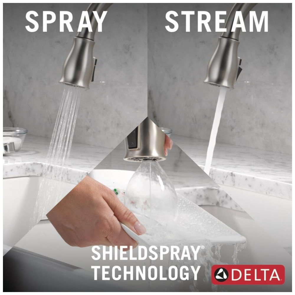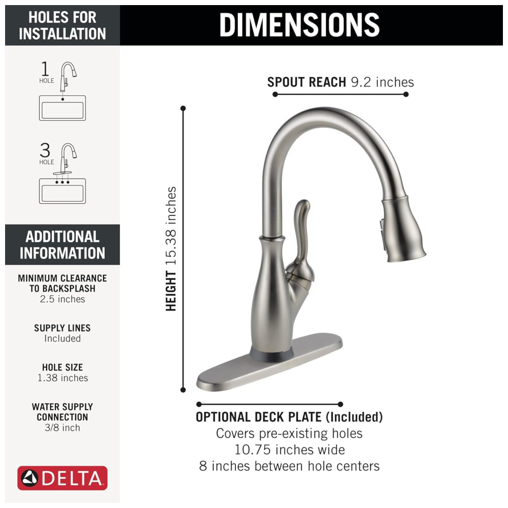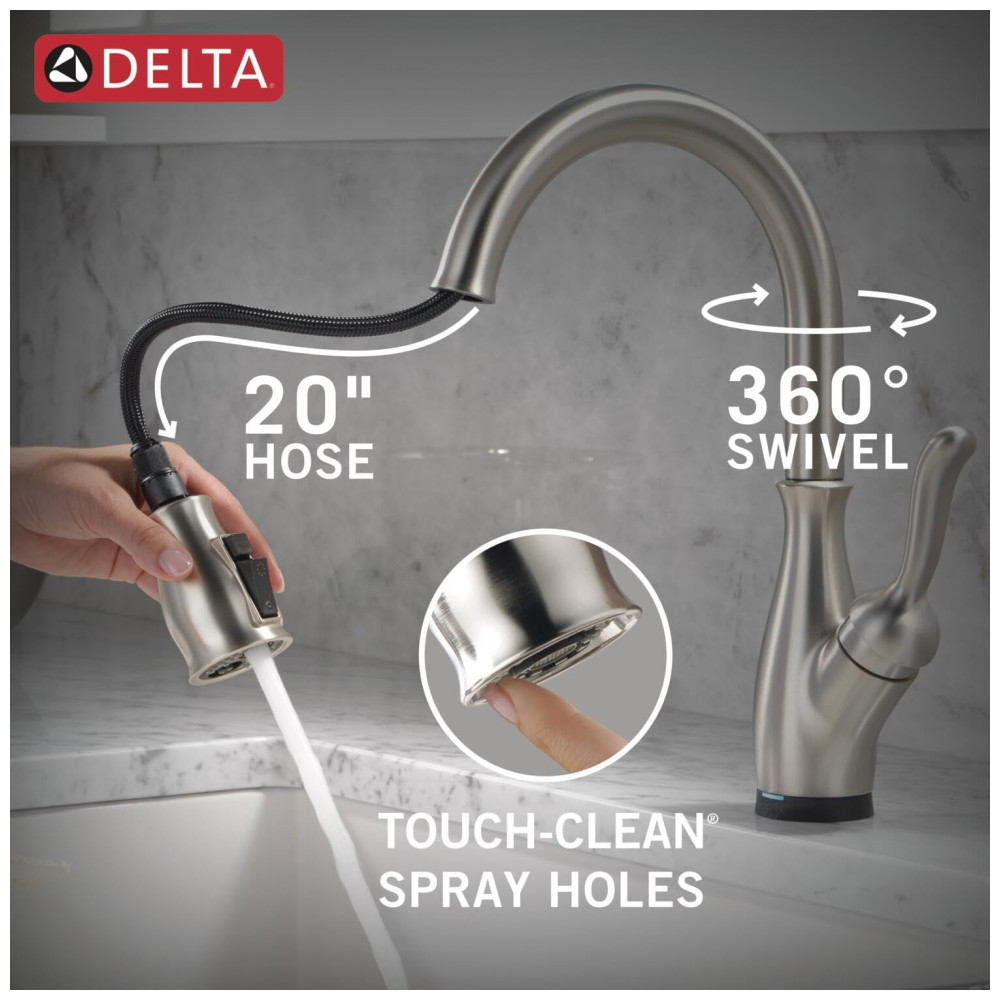 A coleção de cozinha Leland combina estilo tradicional com funcionalidade moderna. As torneiras Delta Touch2O possuem tecnologia Touchless que ajuda a manter a torneira livre de germes e sujeira, permitindo fácil controle da água de três maneiras aproximando a mão da torneira, batendo na superfície ou usando a alça padrão. A luz LED TempSense muda de cor para alertar sobre a temperatura da água. O MagnaTite Docking usa um ímã integrado para manter o bastão de pulverização no lugar. A tecnologia SpotShield ajuda a manter a torneira limpa por mais tempo. A tecnologia ShieldSpray limpa com precisão e contém respingos. As torneiras Delta com tecnologia Diamond Seal reduzem pontos de vazamento e duram o dobro do padrão da indústria. É possível escolher entre os modos Touch2O com Touchless ou Touch2O apenas. A ativação Touchfree ajuda a manter a torneira limpa. A instalação é fácil e pode ser feita pelo próprio usuário, com vídeos de instalação passo a passo disponíveis no YouTube da Delta Faucets.