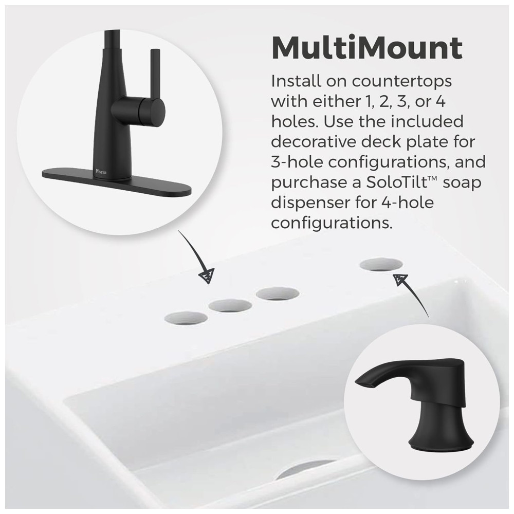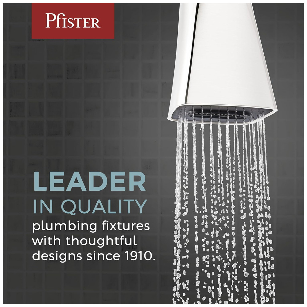 A torneira de cozinha da Pfister é um produto de alta qualidade com mais de 100 anos de experiência em encanamento. O design elegante da alça frontal ressalta a função ergonômica e ajuda onde o espaço atrás da torneira é limitado. A tecnologia de encaixe AccuDock usa braços poderosos com mola dentro da bica projetados para segurar a cabeça de pulverização e mantê la no lugar para um desempenho confiável em cada uso. A bica de arco alto permite maior folga e o bico giratório de alcance permite maior versatilidade, como lavar à mão itens delicados e limpar pias. Selecione entre três configurações de água convenientemente na palma da mão. Possui tecnologia avançada de válvula de disco de cerâmica Pforever Seal que nunca vazará. O Pfast Connect reduz o tempo de instalação e garante uma conexão segura às linhas de abastecimento de água. A tecnologia de montagem TiteSeal simplifica a instalação e elimina a necessidade de massa ou torneira de silicone. É classificada para atender ou exceder os critérios CALGreen, que ajuda a conservar a água em uma residência média em pelo menos 20 por cento.