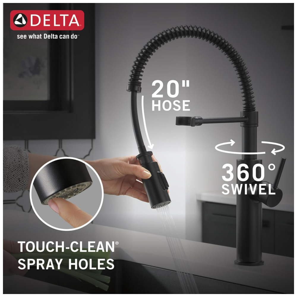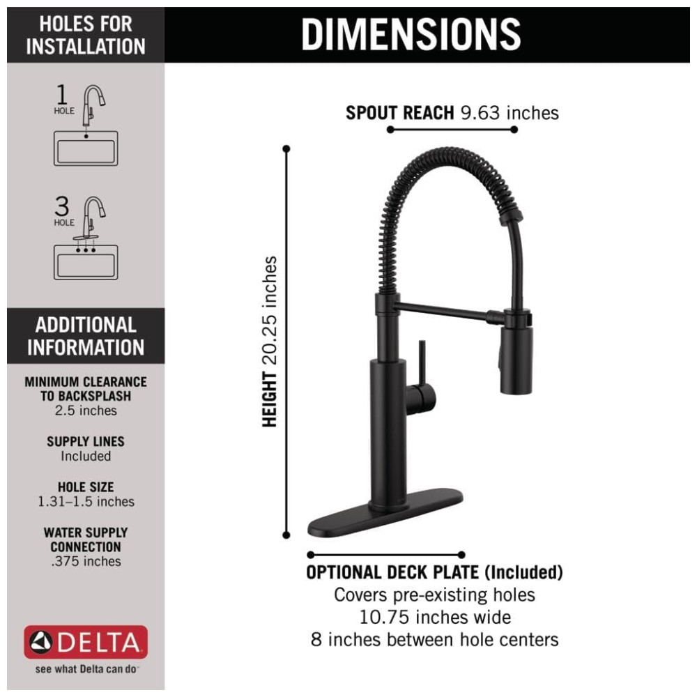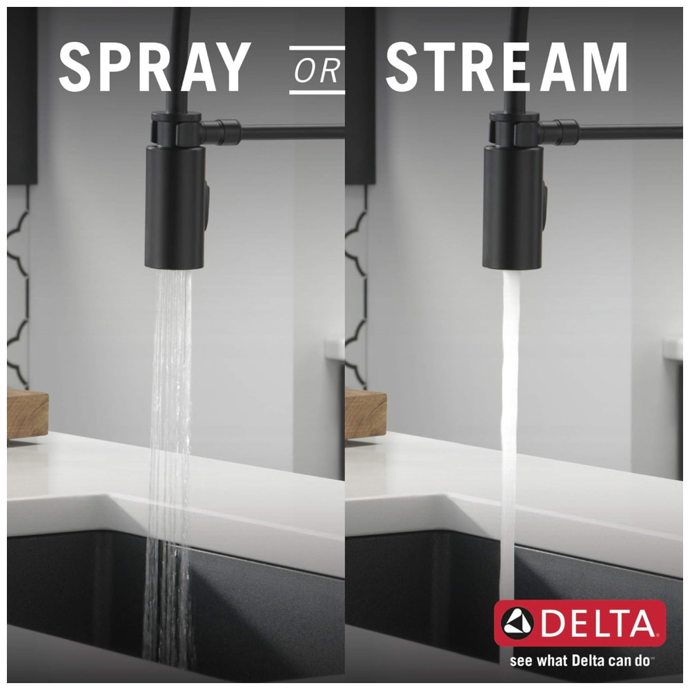 A torneira de cozinha Delta MagnaTite Docking possui um sistema de encaixe magnético que mantém o pulverizador pull down no lugar com precisão. A tecnologia DIAMOND Seal reduz os pontos de vazamento e aumenta a durabilidade da torneira, que dura duas vezes mais que o padrão da indústria. O encaixe é fácil de instalar em furos únicos ou de 7 cm, com linhas de fornecimento InnoFlex PEX integradas para reduzir os pontos de vazamento. O design moderno em preto fosco oferece um estilo comercial casual. A torneira possui um pescoço de ganso de alto arco que gira 360 graus e uma mangueira retrátil de 50 cm para maior conveniência na cozinha. A varinha de duas funções possui jato aerado ou spray. Não há menção à garantia ou suporte.
