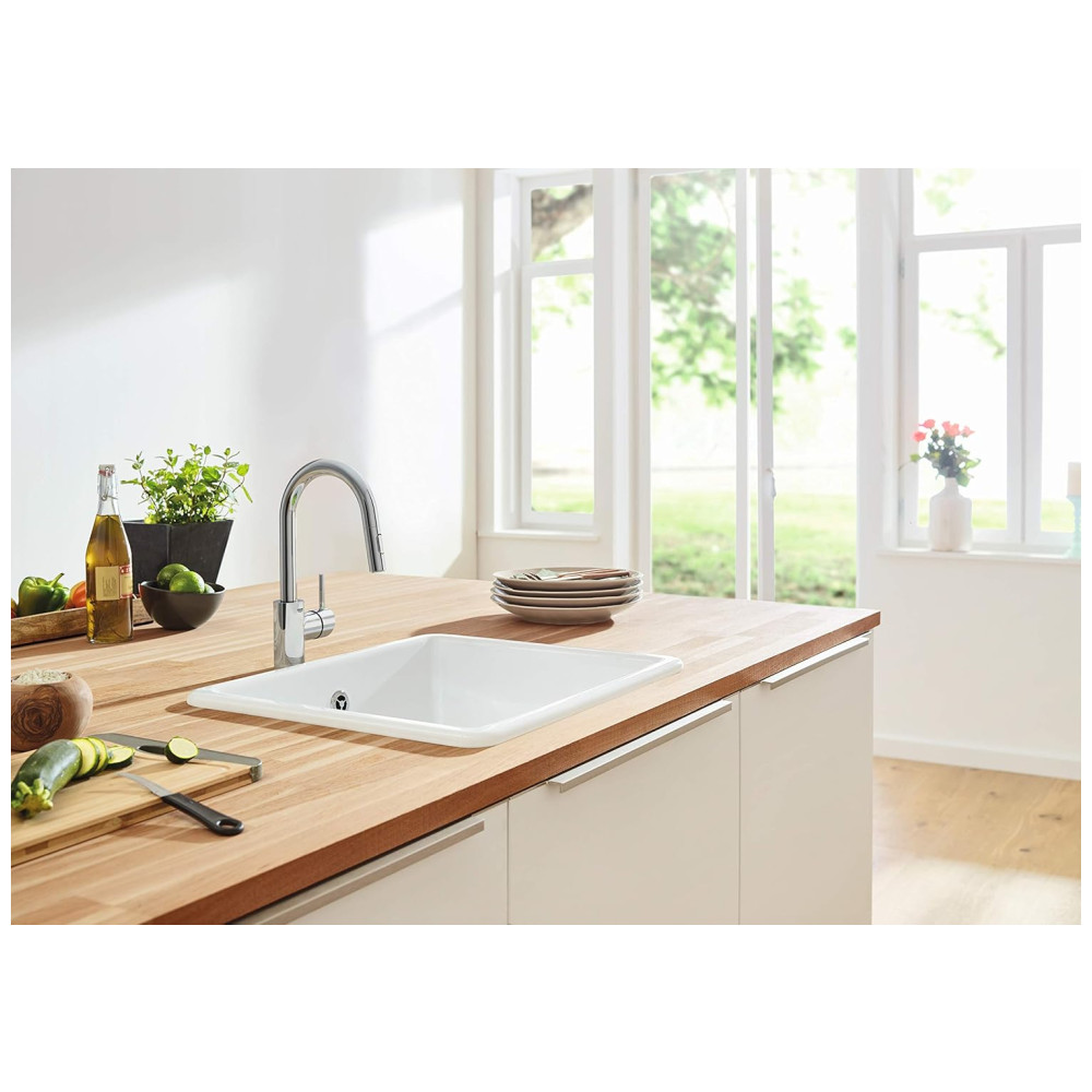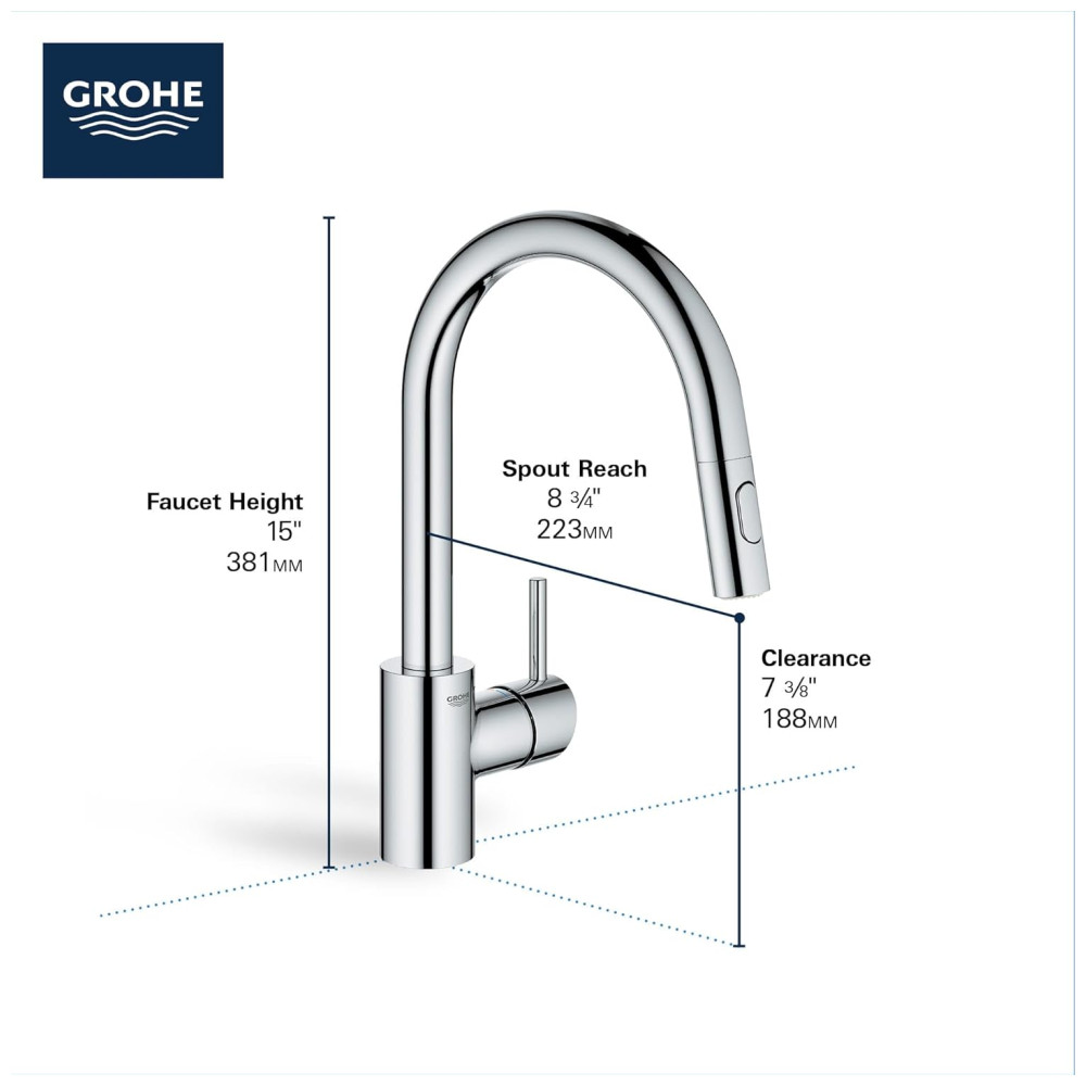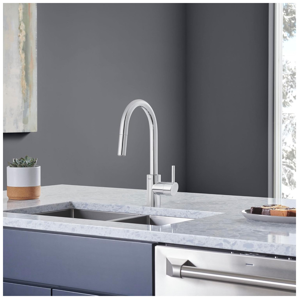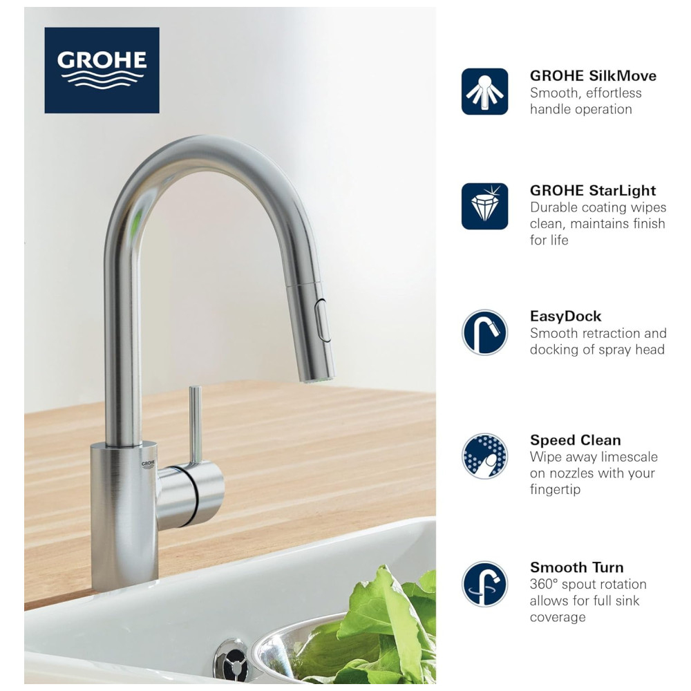 A torneira de cozinha pullDown de spray duplo GROHE Concetto é uma excelente opção para quem busca uma torneira de alta performance. Com uma alça única, esta torneira é prática e fácil de usar. O pulverizador suspenso permite alternar facilmente entre o fluxo de água normal e a pulverização, tornando a extremamente versátil. A bica alta e giratória facilita o acesso a toda a pia e torna mais fácil encher panelas grandes. A alavanca elegante oferece controle preciso da pressão e temperatura da água. A cabeça de pulverização de dupla função com fluxo regular e spray DripFree garante um desempenho à prova de vazamentos. Fácil de instalar em pias e bancadas de furo único, esta torneira também é fácil de limpar, graças aos bicos de borracha GROHE SpeedClean que removem rapidamente o calcário. O design GROHE Zero LeadFree evita que a água entre em contato com o material metálico interno, tornando a segura para uso. Com a tecnologia GROHE EcoJoy, é possível economizar água sem sacrificar o desempenho. A torneira gira 360 , permitindo fácil acesso a todos os cantos da pia da cozinha. O revestimento GROHE StarLight mantém o brilho em acabamentos escovados e polidos, garantindo durabilidade.