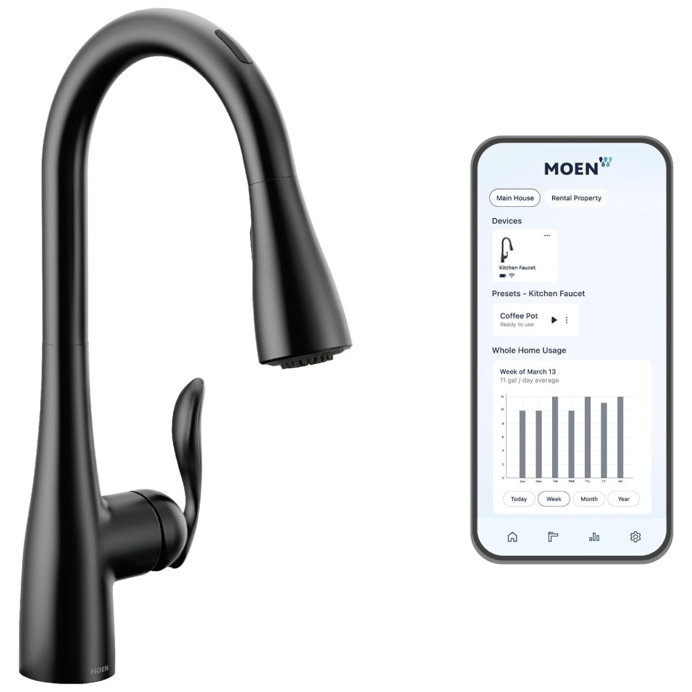 A Moen Smart Faucet é uma torneira de cozinha que utiliza tecnologia avançada para tornar as atividades diárias mais convenientes. Com um único comando de voz ou toque no aplicativo, é possível controlar a temperatura e quantidade de água. O sensor de movimento na frente da torneira permite iniciar e interromper o fluxo de água com um simples gesto. A torneira Arbor Smart Touchless Pulldown Sprayer se conecta a WiFi e é compatível com Google Assistant e Amazon Alexa, permitindo controle por aplicativo ou comando de voz. Possui quatro métodos de controle voz, aplicativo, viva voz ou manual, além de predefinições personalizáveis para medições exatas e temperaturas precisas. O acabamento em preto fosco adiciona sofisticação à cozinha. A torneira possui um sensor de onda automático para início e interrupção do fluxo de água, tornando a conveniente para uso sem as mãos. É necessário um smartphone, alto falante Alexa ou Google Smart e internet sem fio para controle de voz.