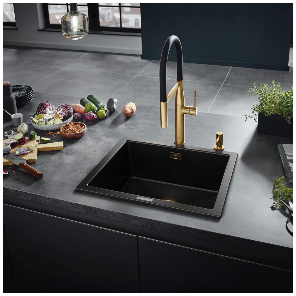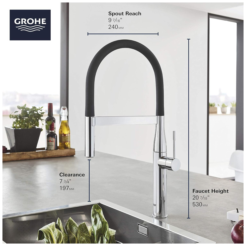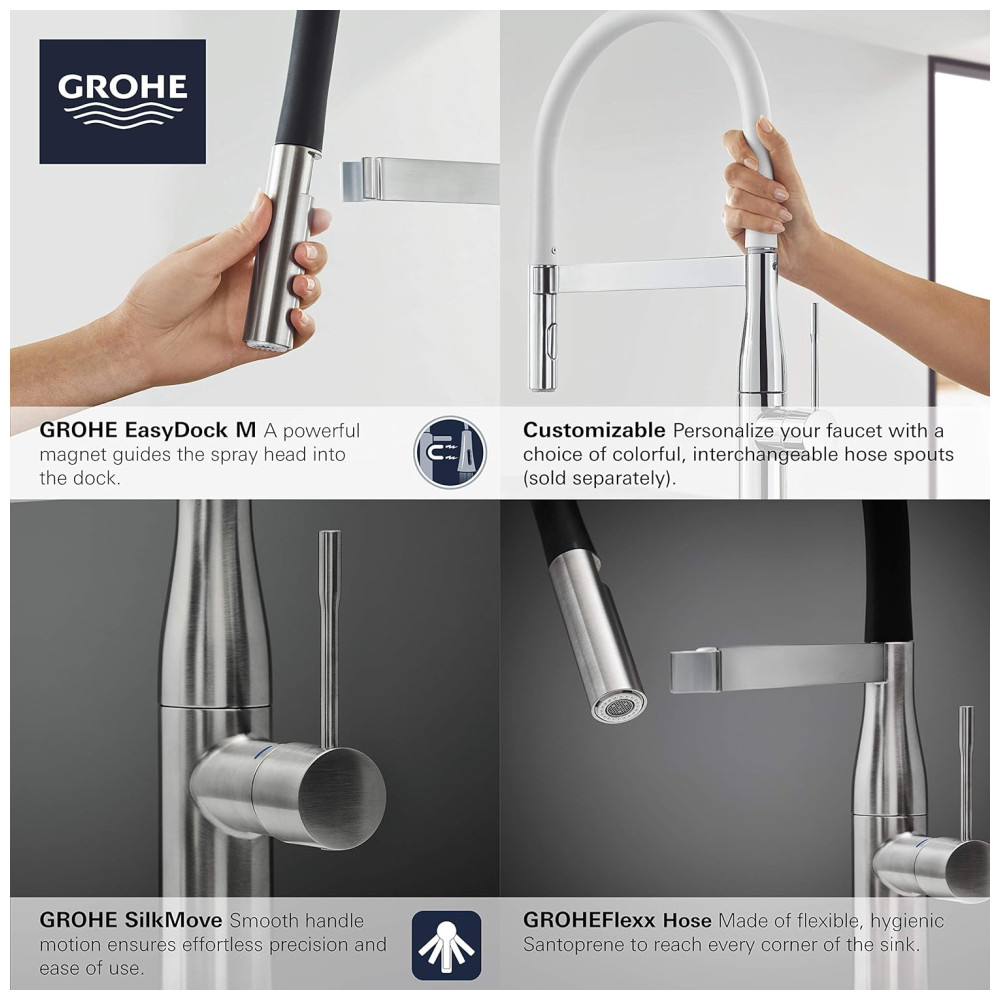 A torneira de cozinha GROHE Essence New SemiPro SingleHandle Dual Spray é uma escolha elegante e minimalista para a cozinha moderna. Com um design de furo único, apresenta uma bica de mangueira preta flexível e arqueada com mola integrada, permitindo alcançar todos os cantos da pia. A cabeça de pulverização de dupla função com função de alternância oferece a opção de alterar entre pulverização e fluxo de água regular. A alavanca giratória para frente permite fácil colocação em qualquer projeto de cozinha e elimina a interferência de backsplash. O bico de mangueira flexível está disponível em várias cores, vendido separadamente e se encaixa facilmente para um visual totalmente novo. A torneira de cozinha semiprofissional possui uma cabeça de pulverização de metal de dupla função com botão de alternância para alternar entre fluxo constante e spray. A mangueira flexível está disponível em uma variedade de cores para uma atualização rápida e fácil da cozinha. Quando não estiver em uso, a cabeça de pulverização é mantida no lugar pelo braço de acoplamento integrado. Equipada com válvula de disco de cerâmica de qualidade, a torneira possui desempenho sem gotejamento. Possui bicos de borracha GROHE SpeedClean para limpar rapidamente o calcário. A torneira de cozinha possui um manípulo único com GROHE SilkMove para controle e operação suave e preciso. O braço de mola SmoothTurn gira 360 graus para uso fácil na ilha e fácil acesso a todos os cantos da pia da cozinha. O revestimento GROHE StarLight mantém o brilho em acabamentos escovados e polidos, proporcionando durabilidade.