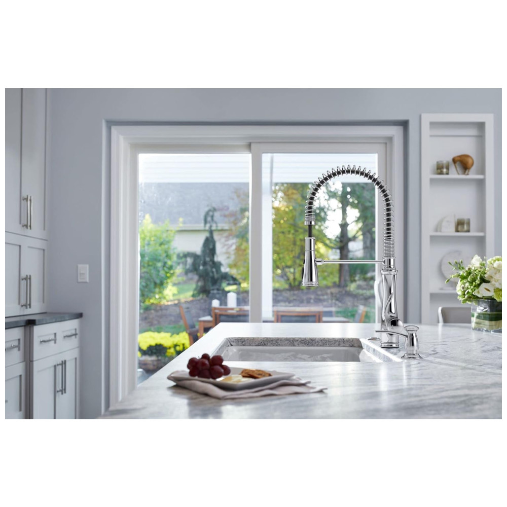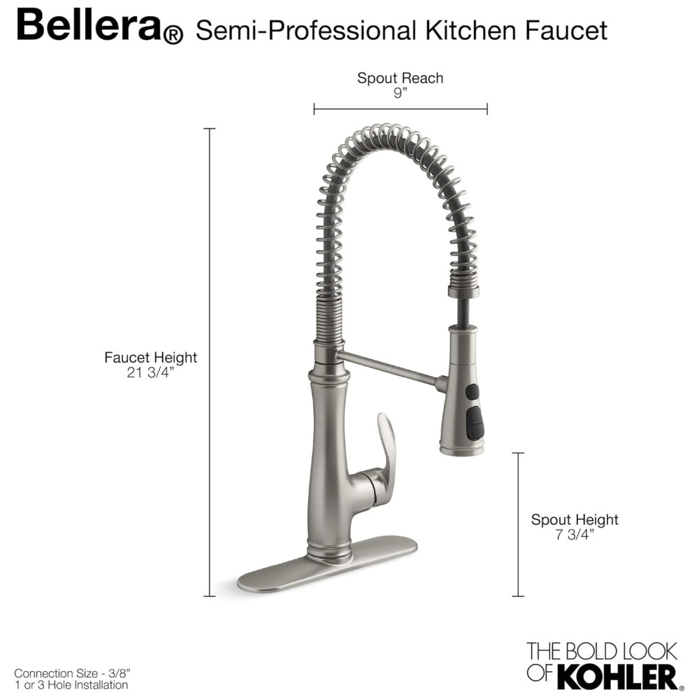 Esta torneira suspensa Bellera possui uma silhueta elegante e traz estilo e desempenho de nível profissional para cozinhas domésticas. O bico de arco alto com um design de bobina de mola de inspiração industrial gira 360 graus para um campo de alcance completo. Além disso, possui um pulverizador de três funções com controle de toque que é puxado para baixo na pia para uma limpeza poderosa com o spray Sweep, ou para fora da pia para encher potes e jarras rapidamente com a função Boost. A torneira é semiprofissional e possui uma mangueira fácil de limpar que possui uma bobina removível, inclui rotação da alça de 90 graus para evitar contato com varredura backsplash. A torneira em spray cria uma lâmina de água larga e forte para limpeza superior, vazão máxima de 1,5 gpm 5,7 lpm a 60 psi 4,14 bar. Com controle de toque que permite alternar entre fluxo, varredura de pulverização e aumento, proporcionando aumento de 3 taxas de fluxo, a torneira de cabeça de pulverização de três funções tem memória de temperatura que permite que a torneira permaneça na temperatura definida durante o uso anterior. A bica alta da Bellera Kohler oferece melhor espaço para encher potes e limpar, enquanto a mangueira trançada leve e silenciosa da tecnologia ProMotion e a junta esférica giratória tornam nossa torneira extraível mais confortável e fácil de usar e está equipada com nosso sistema de encaixe seguro DockNetik que trava o pulverizador em lugar, também projetado com face de pulverização MasterClean que é fácil de limpar e resiste ao acúmulo de minerais. As válvulas de disco de cerâmica excedem os padrões da indústria de longevidade e desempenho que são feitos para durar a vida toda em sua cozinha, feitas com nosso premium acabamento duradouro resistente à corrosão e manchas. As torneiras Kohler atendem aos critérios da EPA e são registradas na Comissão de Energia da Califórnia CEC9. As linhas de fornecimento flexíveis estão incluídas para tornar a instalação mais rápida e fácil, projetada para instalação em furo único. As torneiras projetadas Kohler trazem uma elegância elevada para sua cozinha ou lavanderia, nossos vários estilos são feitos para caber em diferentes pias de cozinha, RV ou qualquer reforma de cozinha.