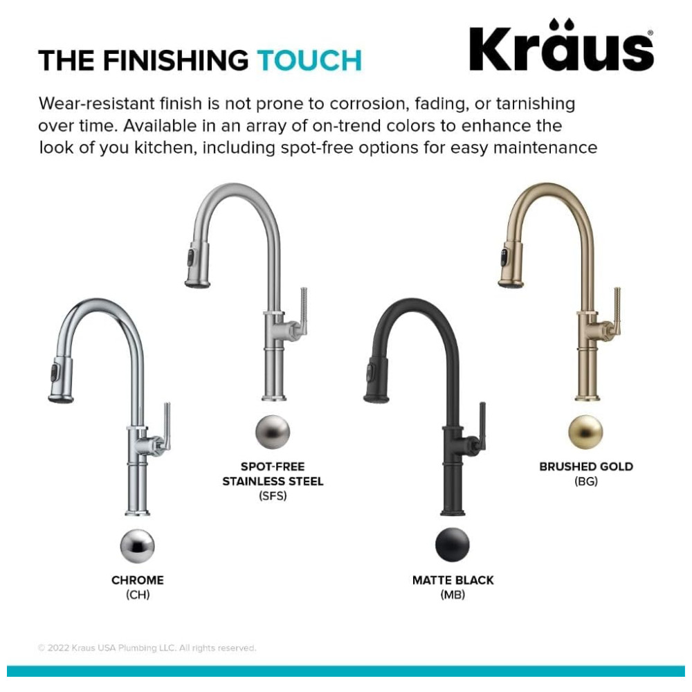 O acabamento resistente ao desgaste mantém a torneira livre de corrosão, desbotamento e manchas ao longo do tempo. Também disponível em aço inoxidável sem manchas, este acabamento facilita a manutenção, evitando marcas de água e impressões digitais.