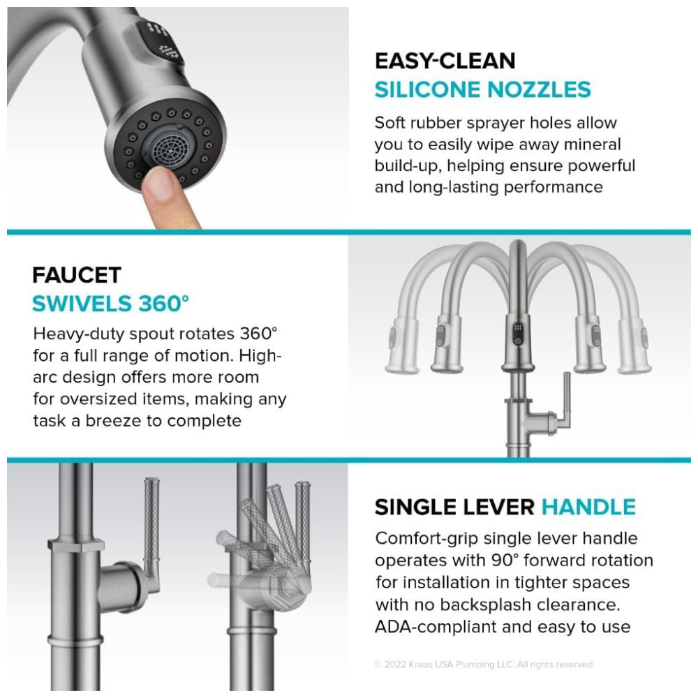 O sprayhead de dupla função alterna entre um fluxo aerado para limpeza diária e um spray potente para enxaguamento pesado. Os bicos de pulverizador easy-clean previnem o acúmulo de minerais, garantindo um desempenho prolongado. O bico alto-arco oferece amplo espaço para itens grandes, como jarros altos.