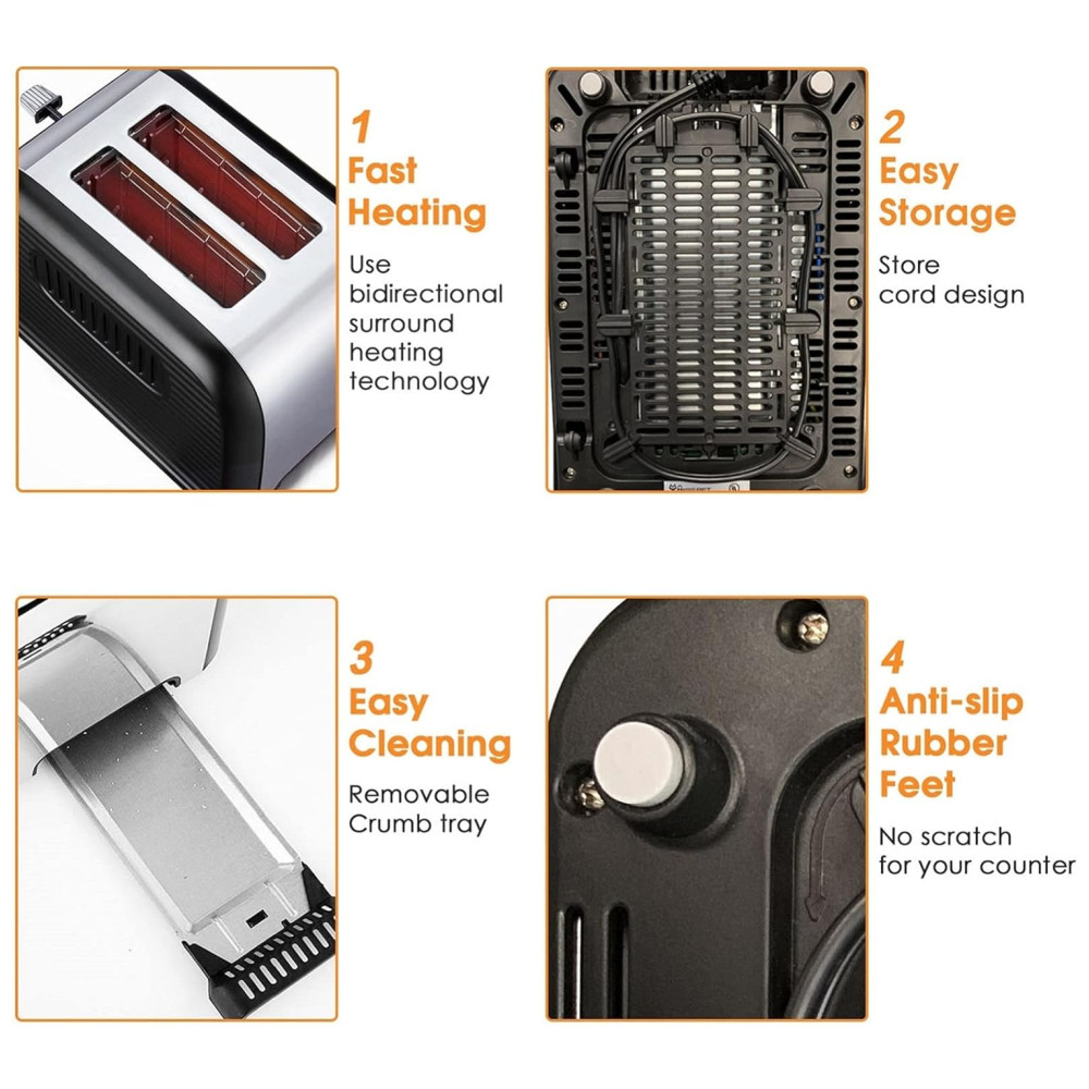 A torradeira de 2 fatias ALES usa material retardador de fogo, anti escaldante, não tóxico e livre de bpa para contato com alimentos, permitindo que você desfrute de deliciosas torradas sem se preocupar.