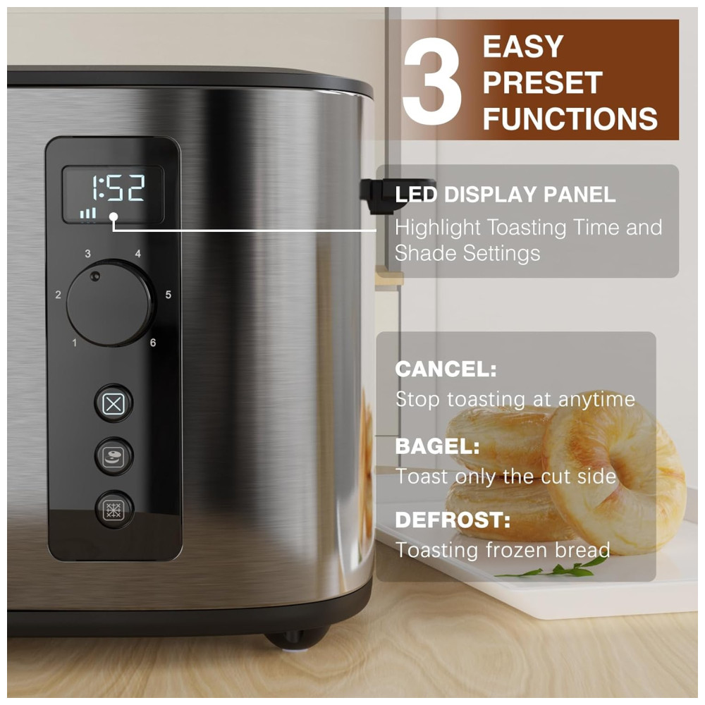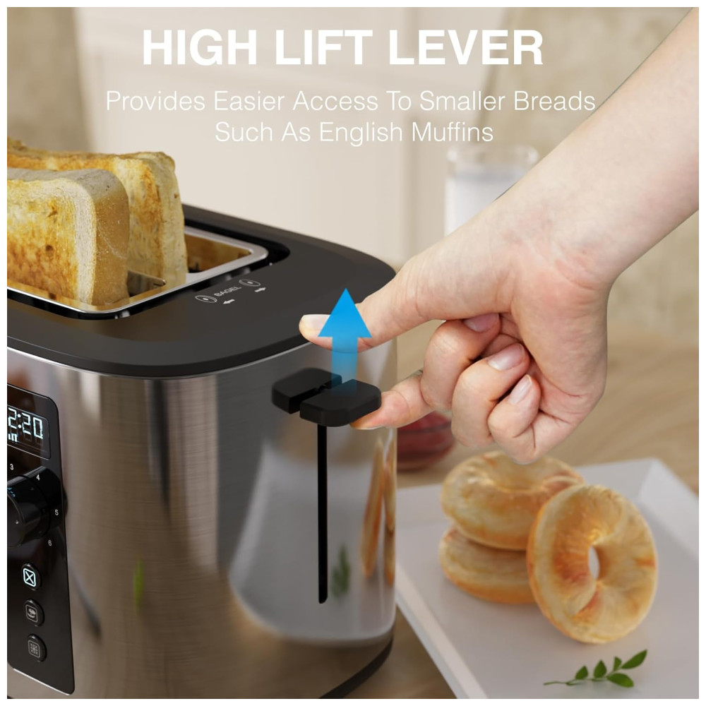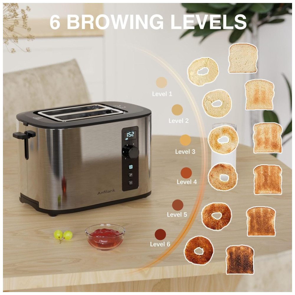 Torradeira 2 Fatias com Contagem Regressiva 6 Níveis de Tostagem Funções de Cancelamento Bagel e Descongelamento 110V 900W Anfilank KY-872BS Prata