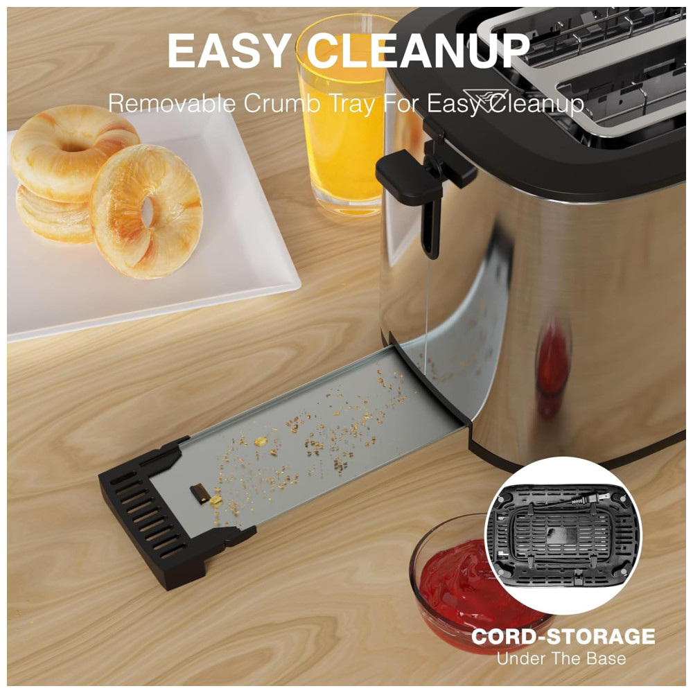 Para manter sua cozinha limpa, a torradeira vem com uma bandeja removível para migalhas, que coleta as migalhas e evita sujeira. Os cabos também podem ser guardados em compartimentos especiais na parte inferior, garantindo um armazenamento organizado e livre de bagunça.