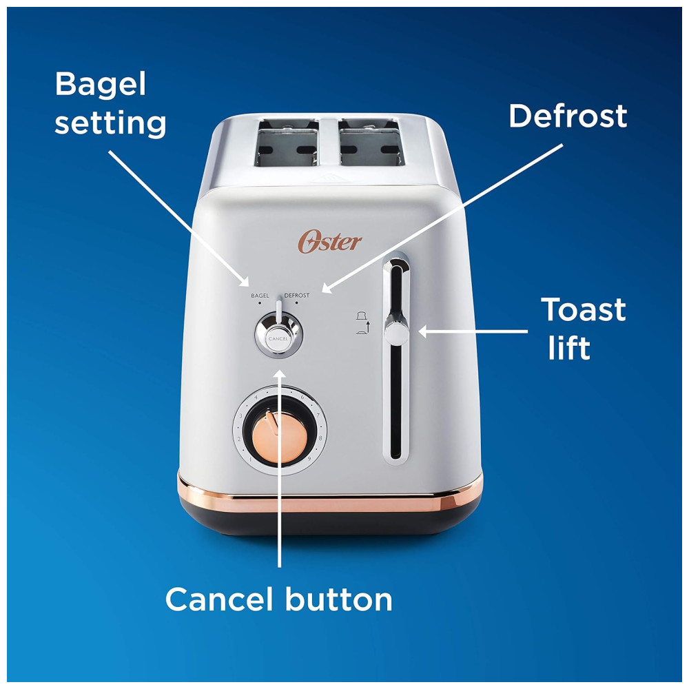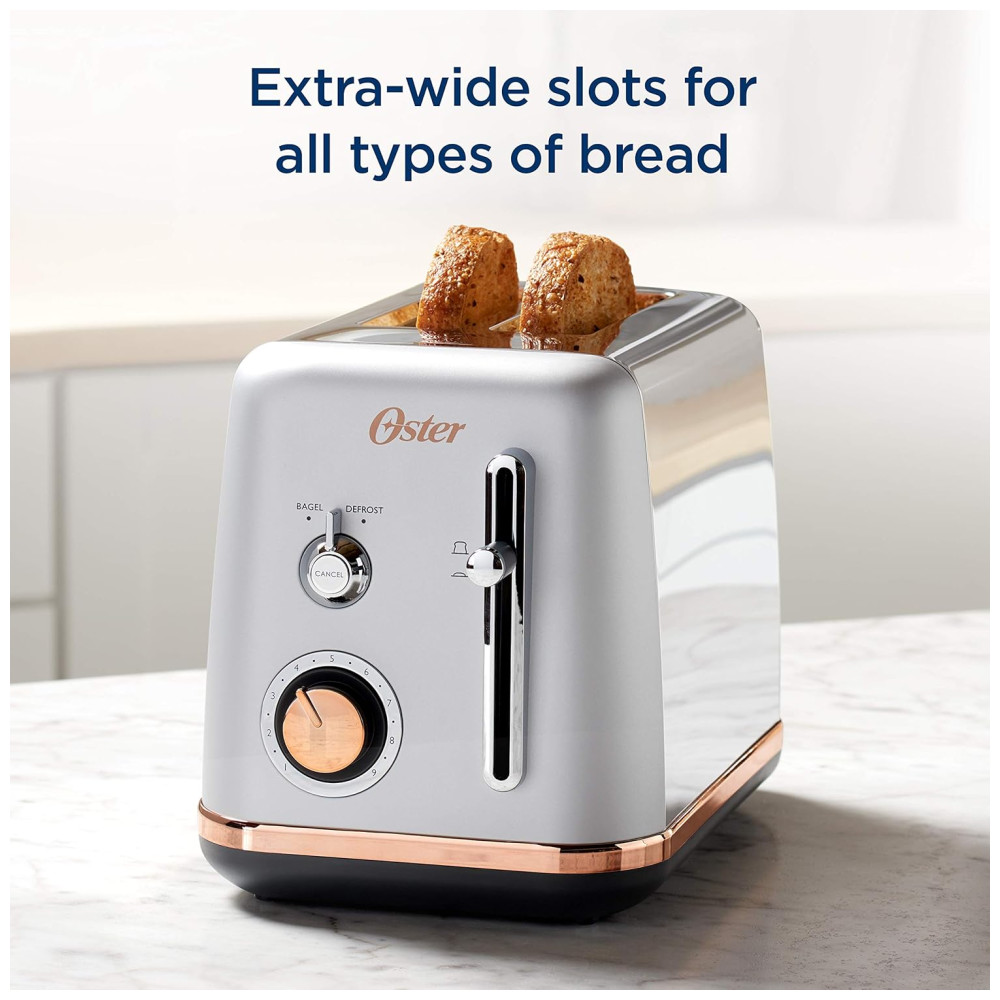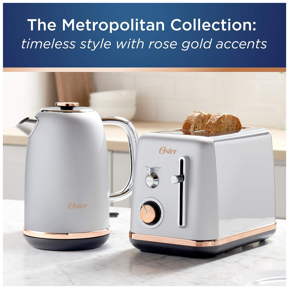 Esta torradeira Oster 2 Fatias da coleção metropolitana elegante irá melhorar qualquer decoração de cozinha com seus elegantes detalhes em ouro rosa