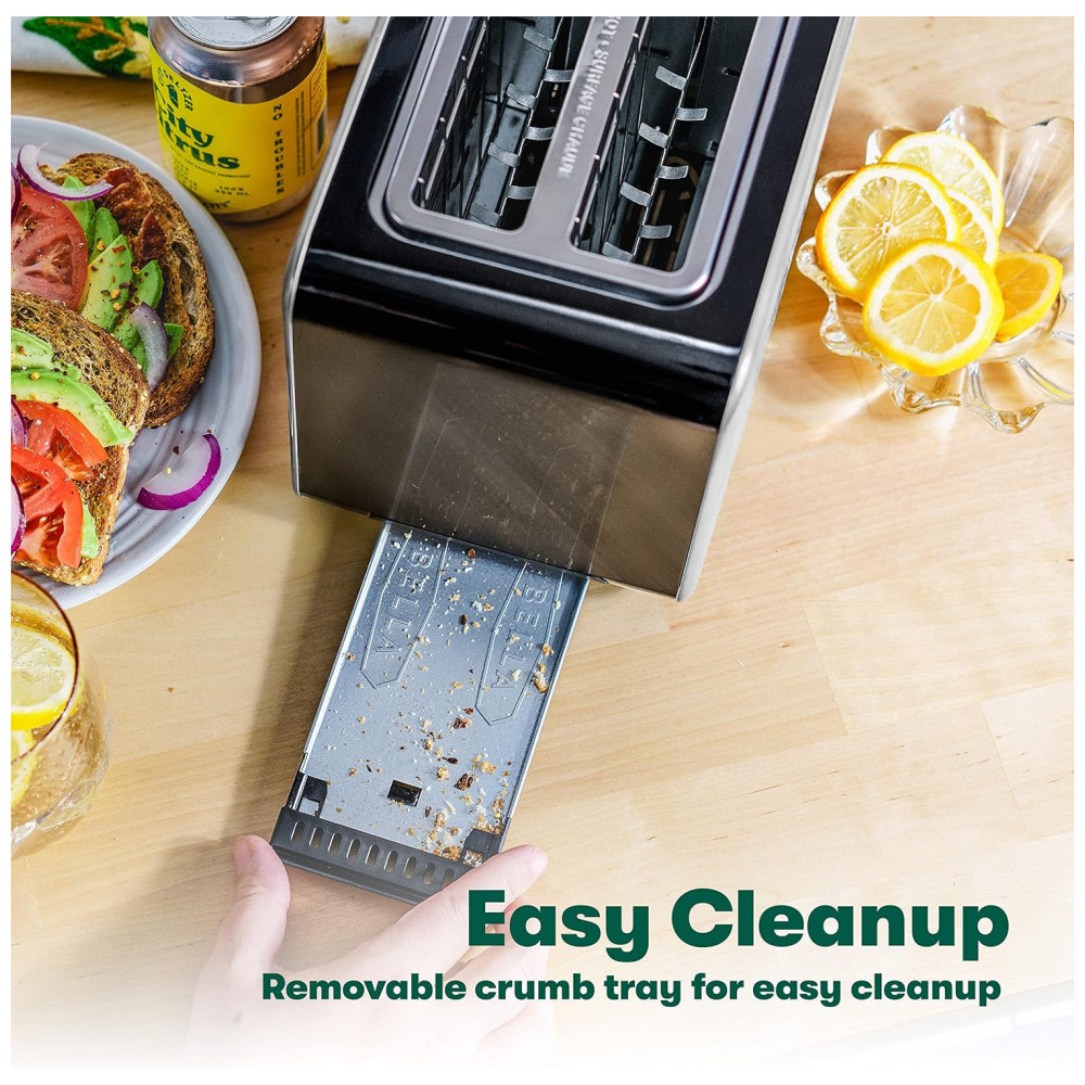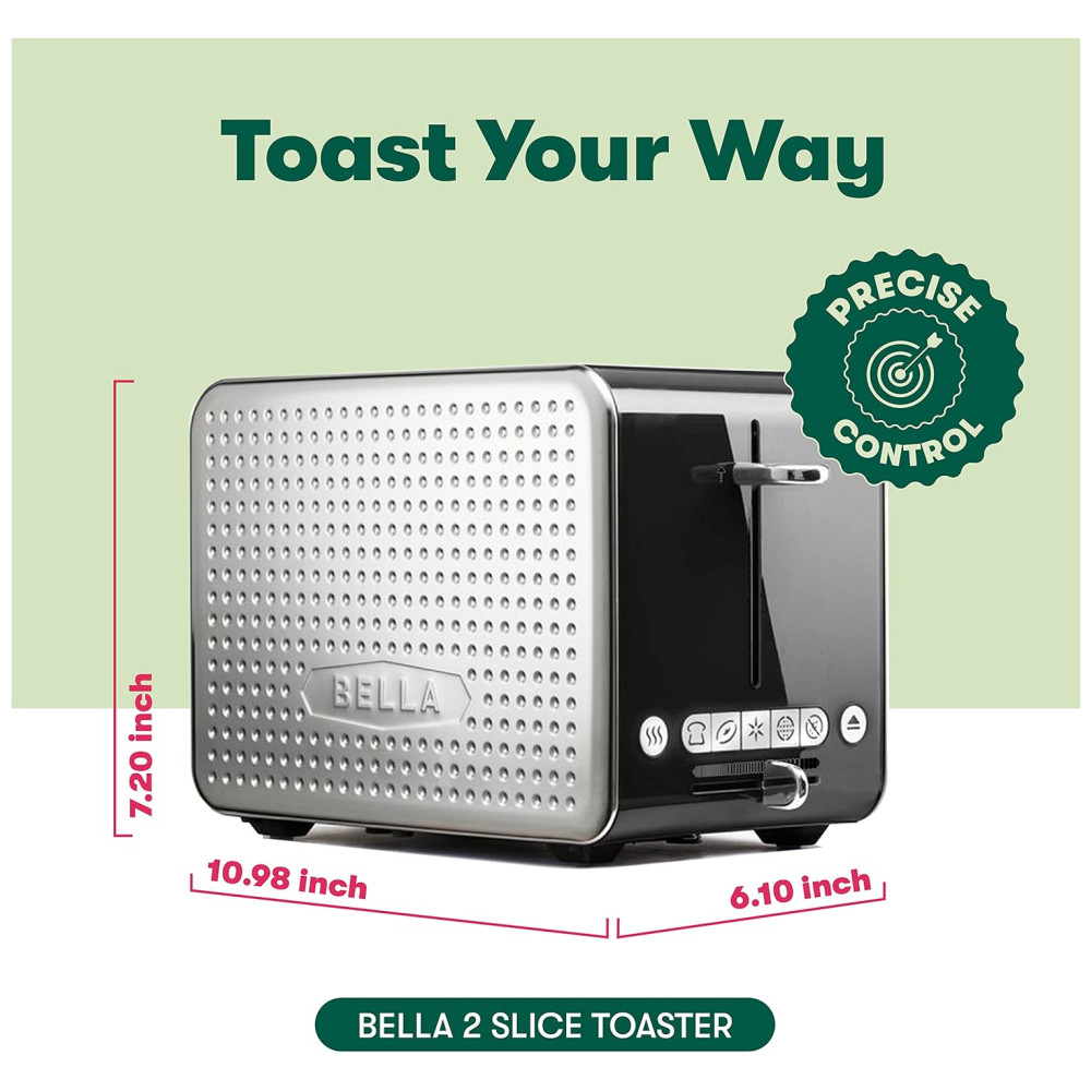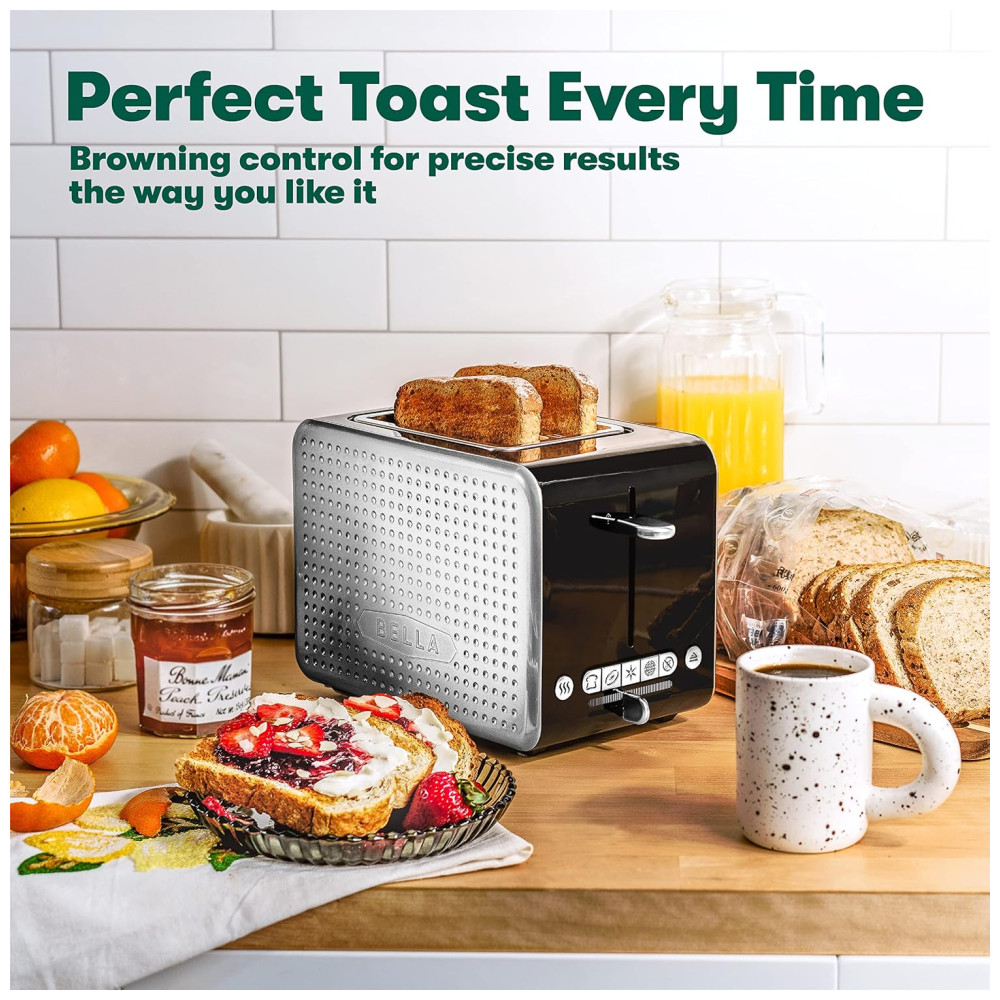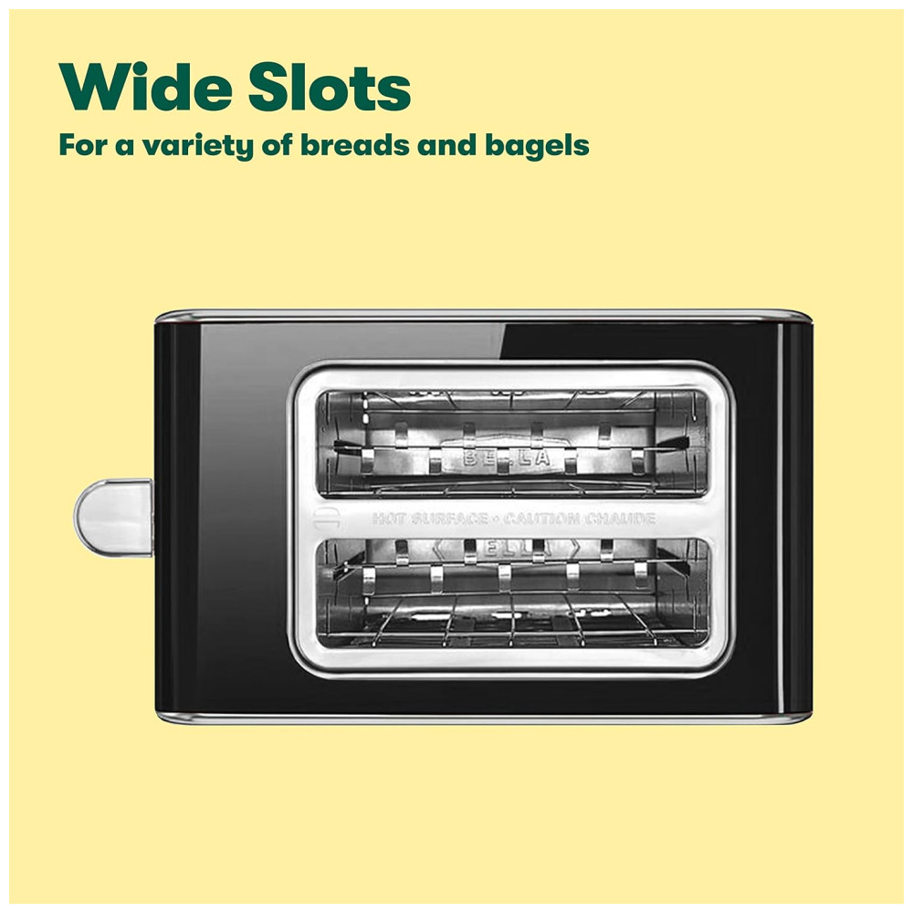 Desfrute de torradas uniformes sempre com guias de centralização automática e escolha seu nível preferido de escurecimento com controle de tonalidade. Com recursos antijam e desligamento automático, esta torradeira de pão oferece segurança extra para você e sua família. Nossa torradeira Bella que economiza espaço é uma virada de jogo! Ele cabe perfeitamente em qualquer cozinha sem ocupar muito espaço, e o armazenamento do cordão mantém as bancadas limpas. Além disso, a limpeza é muito fácil graças à bandeja de migalhas removível.
