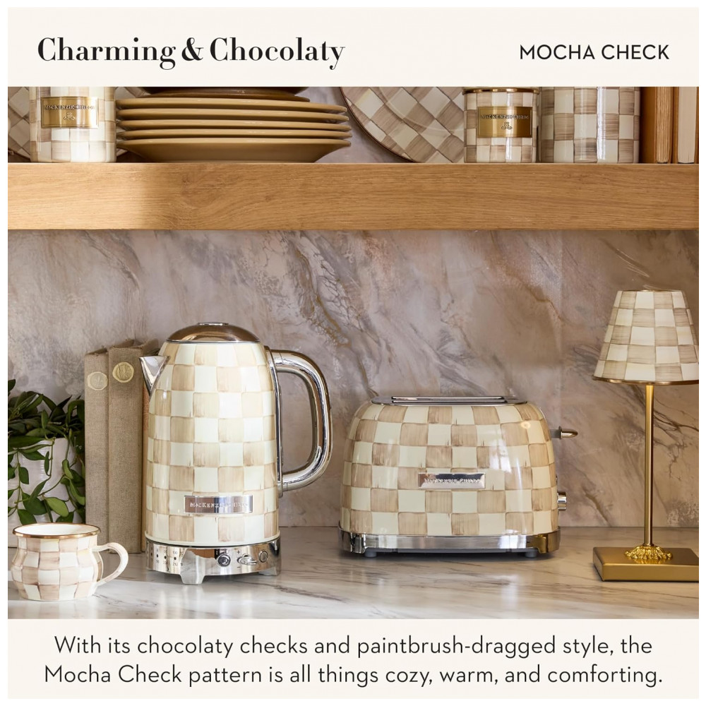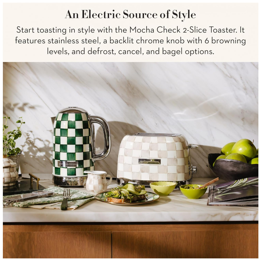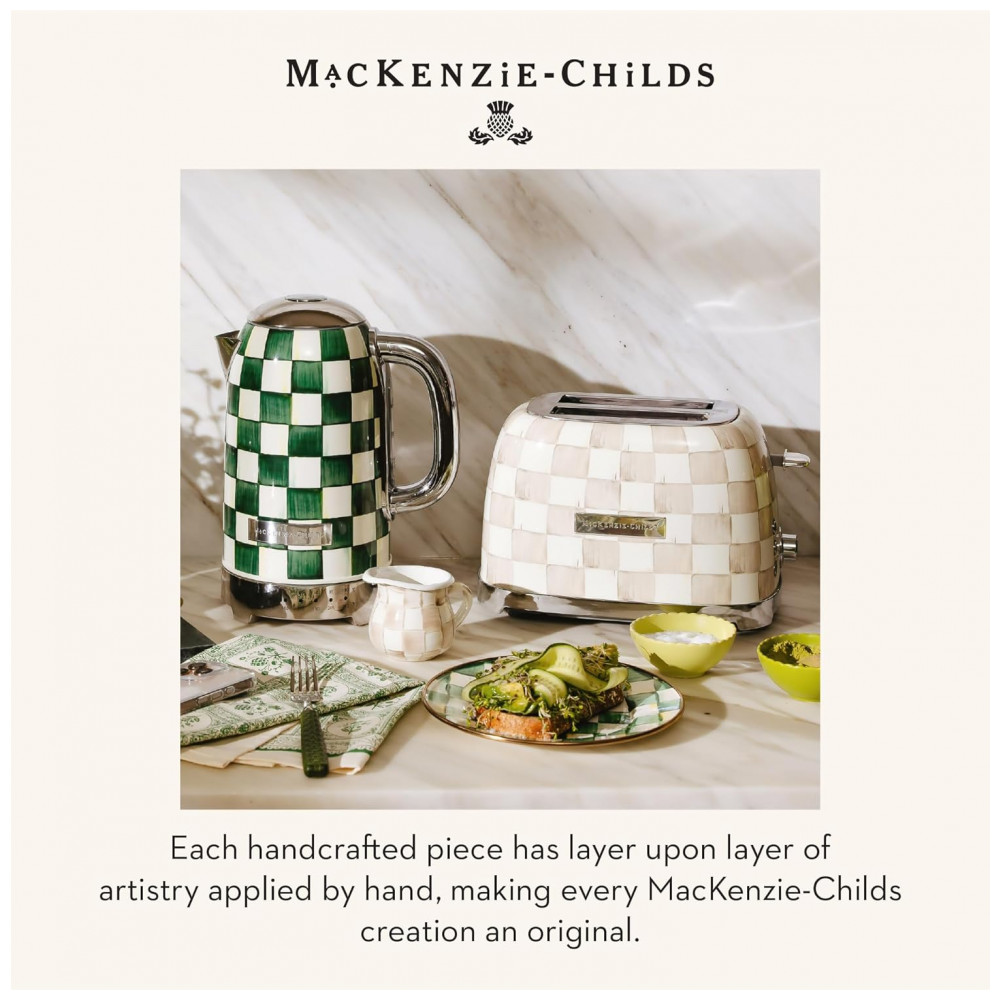 A torradeira MacKenzie-Childs Cherry Check de 2 fatias é um aparelho elétrico doméstico desenvolvido para torrar pães, bagels e muffins com controle de douramento em seis níveis. O corpo em aço inoxidável com acabamentos em materiais plásticos técnicos e polipropileno recebe estampa xadrez bege e branca, permitindo uso funcional em bancada com apelo decorativo. As ranhuras possuem sistema autocentrante que posiciona as fatias no centro da resistência, favorecendo aquecimento mais uniforme nas duas faces.
