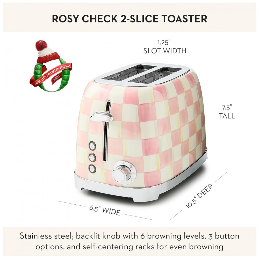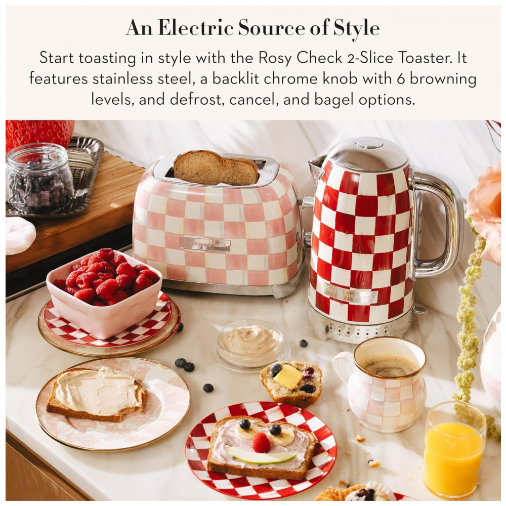 A torradeira MacKenzie-Childs Cherry Check de 2 fatias é um aparelho elétrico doméstico desenvolvido para torrar pães, bagels e muffins com controle de douramento em seis níveis. O corpo em aço inoxidável com acabamentos em materiais plásticos técnicos e polipropileno recebe estampa xadrez rosa e branca, permitindo uso funcional em bancada com apelo decorativo. As ranhuras possuem sistema autocentrante que posiciona as fatias no centro da resistência, favorecendo aquecimento mais uniforme nas duas faces.