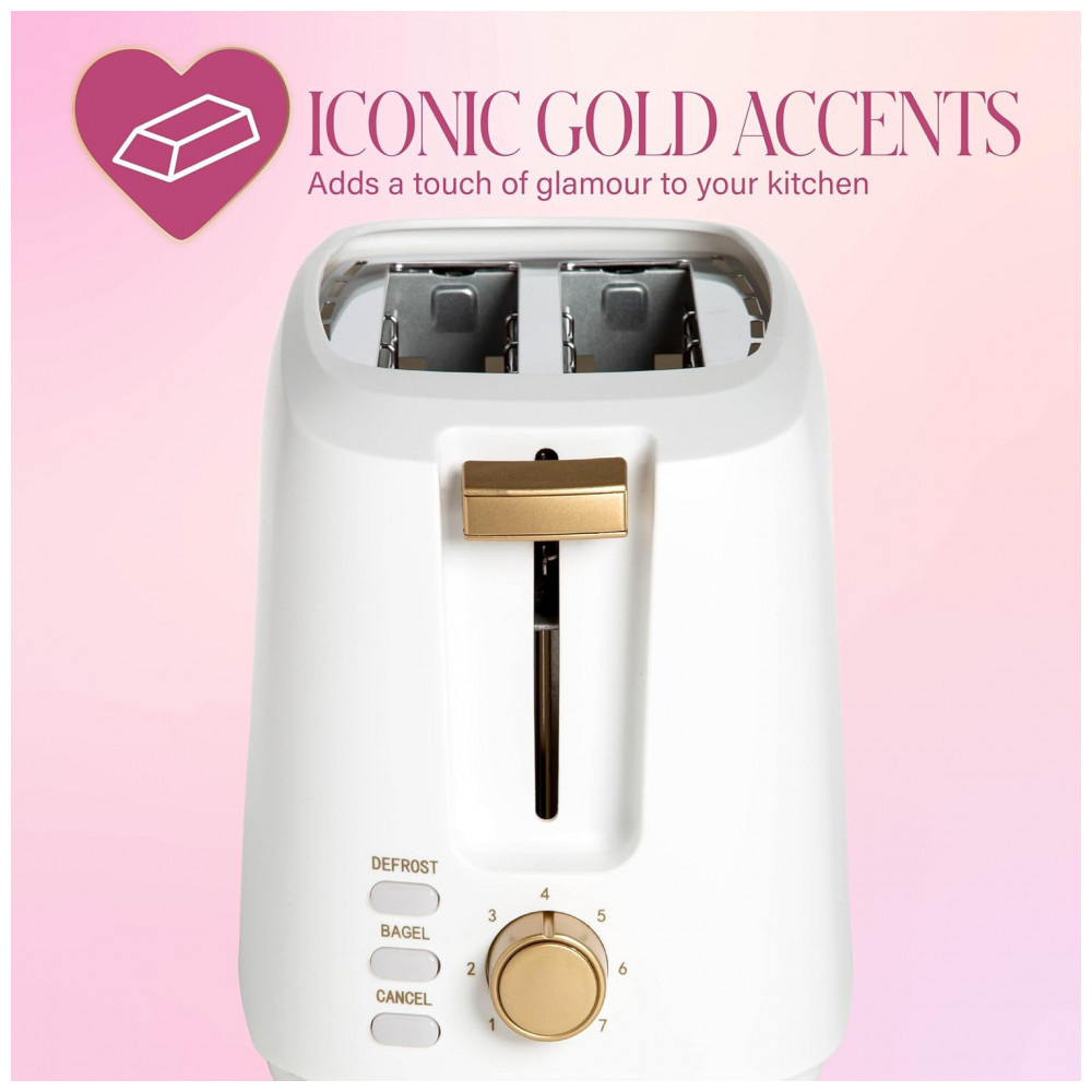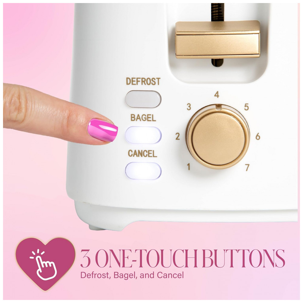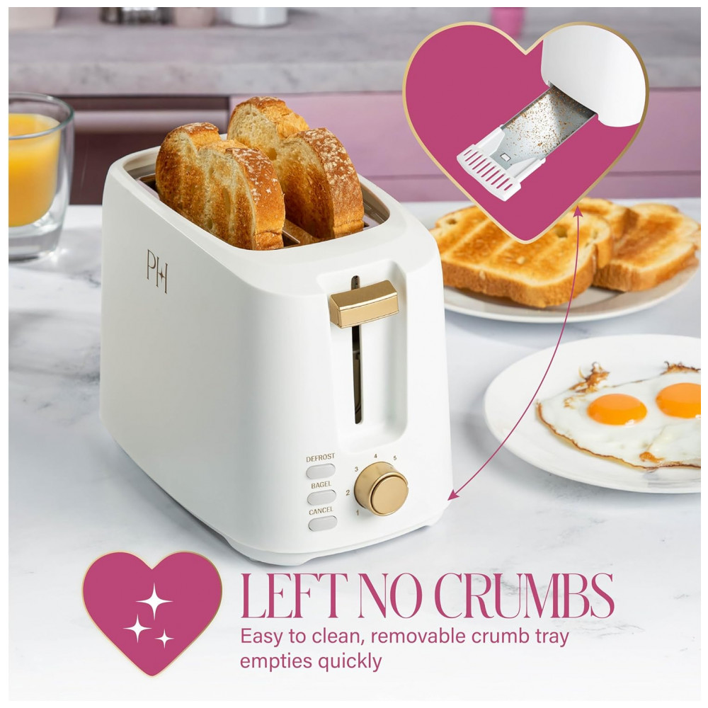 A torradeira Paris Hilton PH13386-1 é um modelo de 2 fatias com acabamento branco e detalhes metálicos, projetado para uso diário em preparo de pães e bagels em diferentes níveis de tostagem. As ranhuras extra largas acomodam fatias espessas de pães e bagels sem deformar o alimento, facilitando o uso com variados tipos de produtos de panificação. O seletor com 7 níveis de douramento permite ajustar desde uma tostagem mais clara até um resultado mais crocante, adequando o ponto ao gosto do usuário.