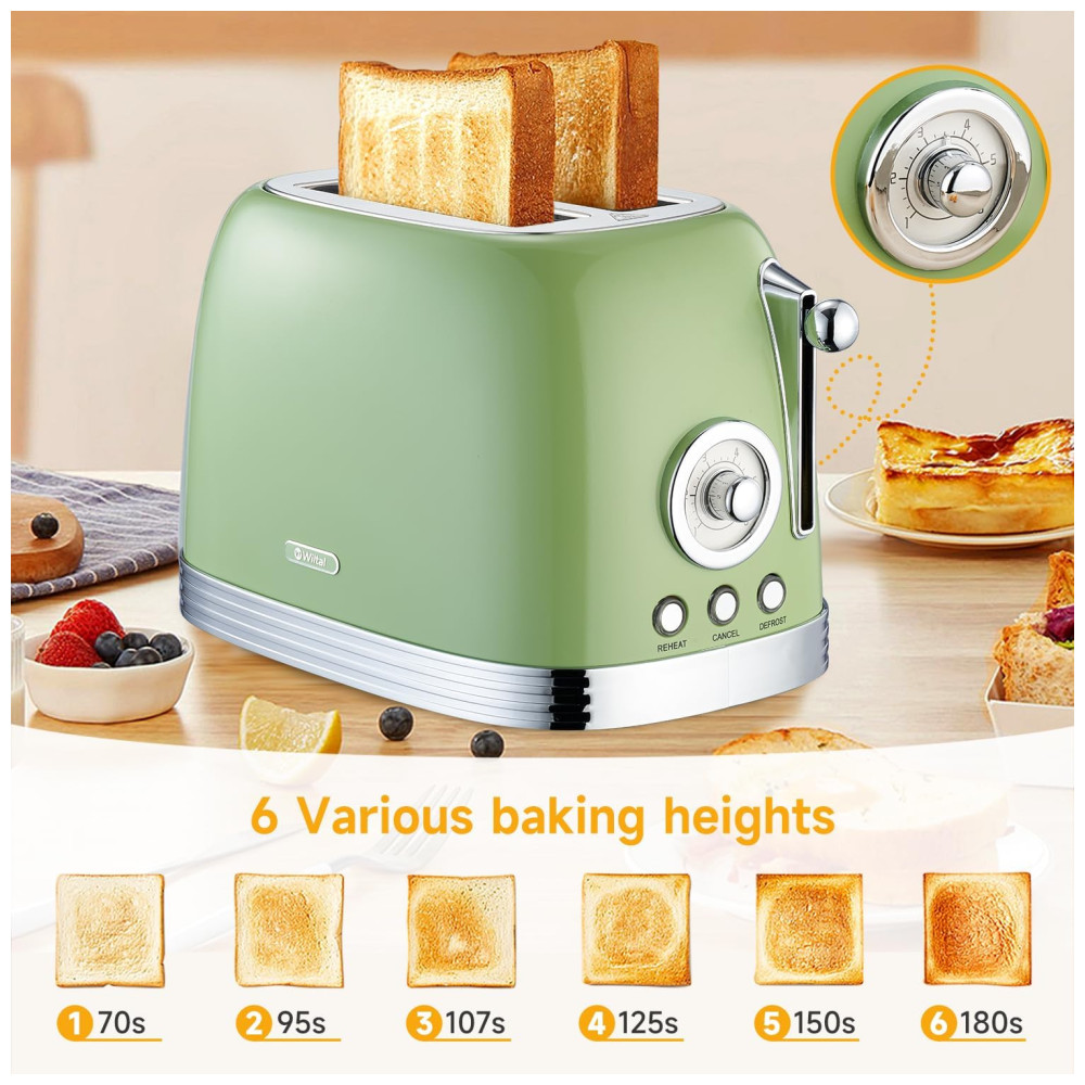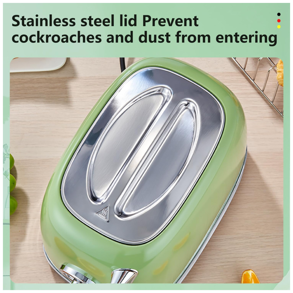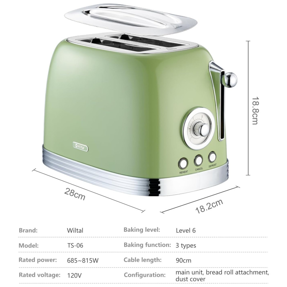 Torradeira 2 Fatias Vintage com Tampa de Aço Inoxidável Acessório para Pão 6 Níveis de Tostagem e Funções de Pré-aquecimento 110V 815W Wiltal TS06 Verde