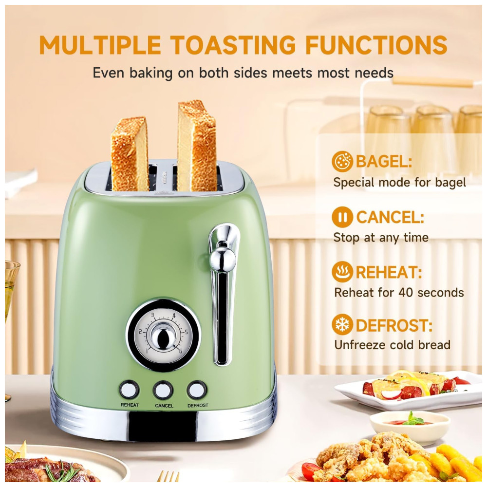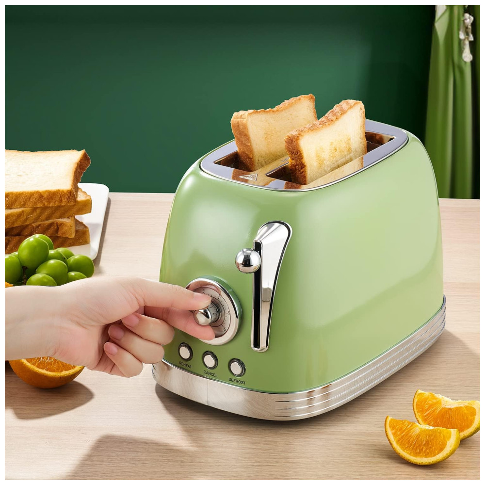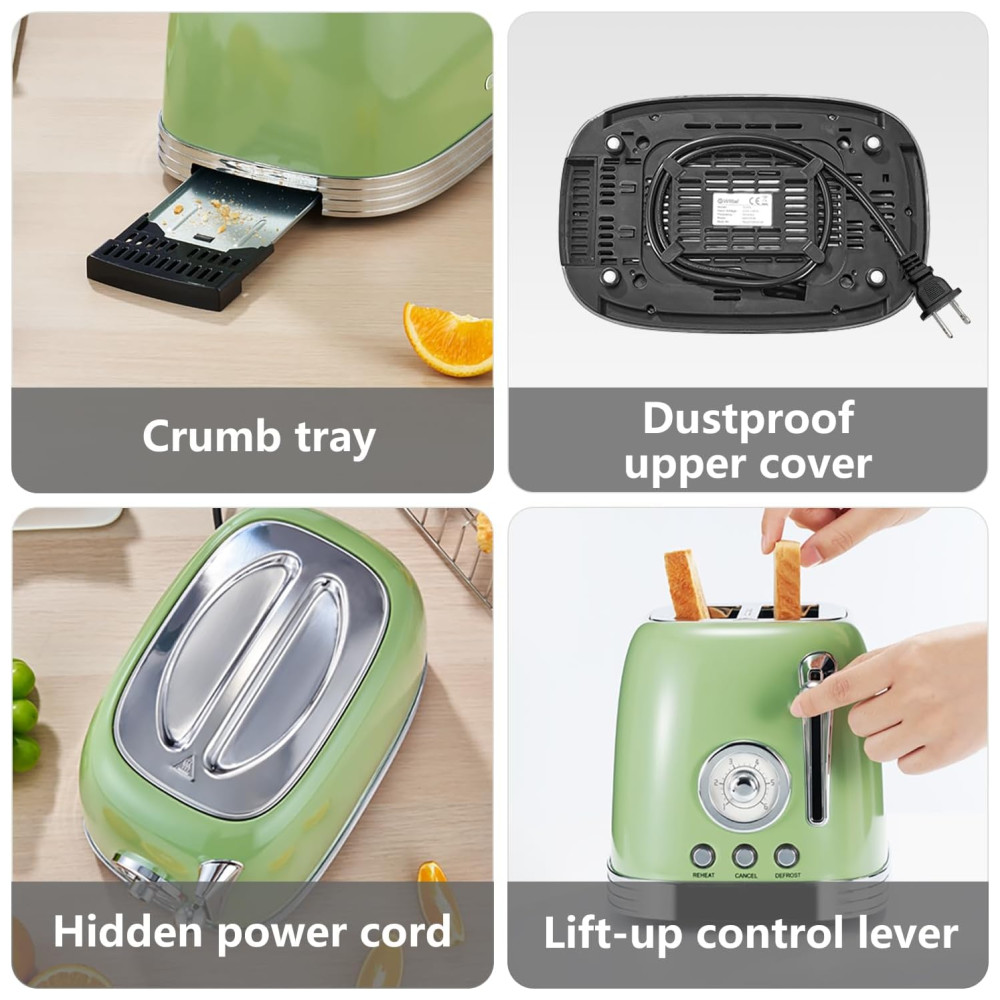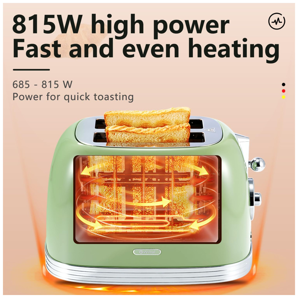 Torradeira 2 Fatias Vintage com Tampa de Aço Inoxidável Acessório para Pão 6 Níveis de Tostagem e Funções de Pré-aquecimento 110V 815W Wiltal TS06 Verde