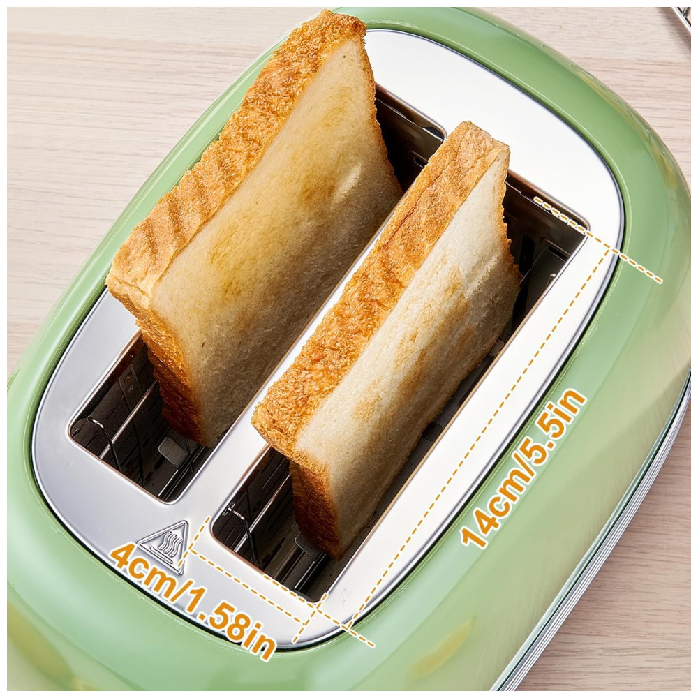 Esta torradeira retrô de 2 fatias possui 2 ranhuras de torragem alargadas de 4 cm x 14 cm x 13 cm, permitindo a torra de uma variedade de pães finos e grossos. É ideal para desfrutar de um delicioso café da manhã em casa, com torradas, pão fatiado, fatias de sanduíche, bagel e muito mais. Além disso, a torradeira vem com um acessório para torrar croissants e pãezinhos. A tampa é de aço inoxidável à prova de poeira e a bandeja para migalhas é removível para facilitar a limpeza.
