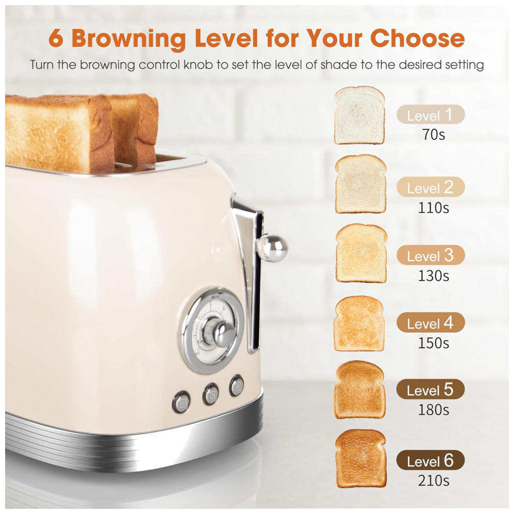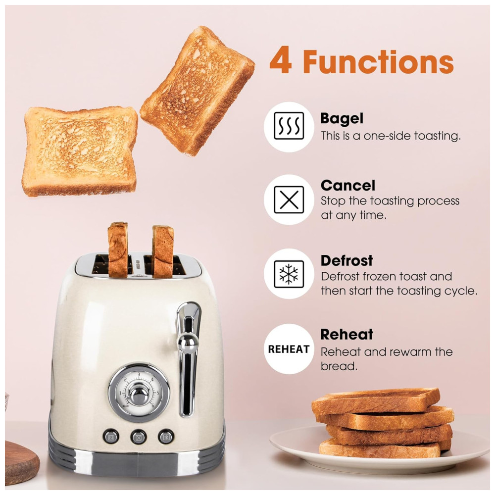 AJUSTE DE REAQUECIMENTO E 6 TOMADAS Há um recurso de reaquecimento e uma configuração de tostagem de 6 níveis de 1 a 6 para você escolher. A configuração do tempo é de 30 segundos a 210 segundos. Ajuste de acordo com seu tempo e sombra preferidos. Você poderá fazer a torrada perfeita sem esforço.