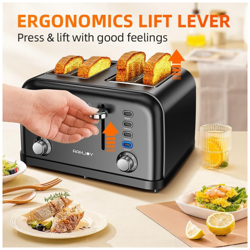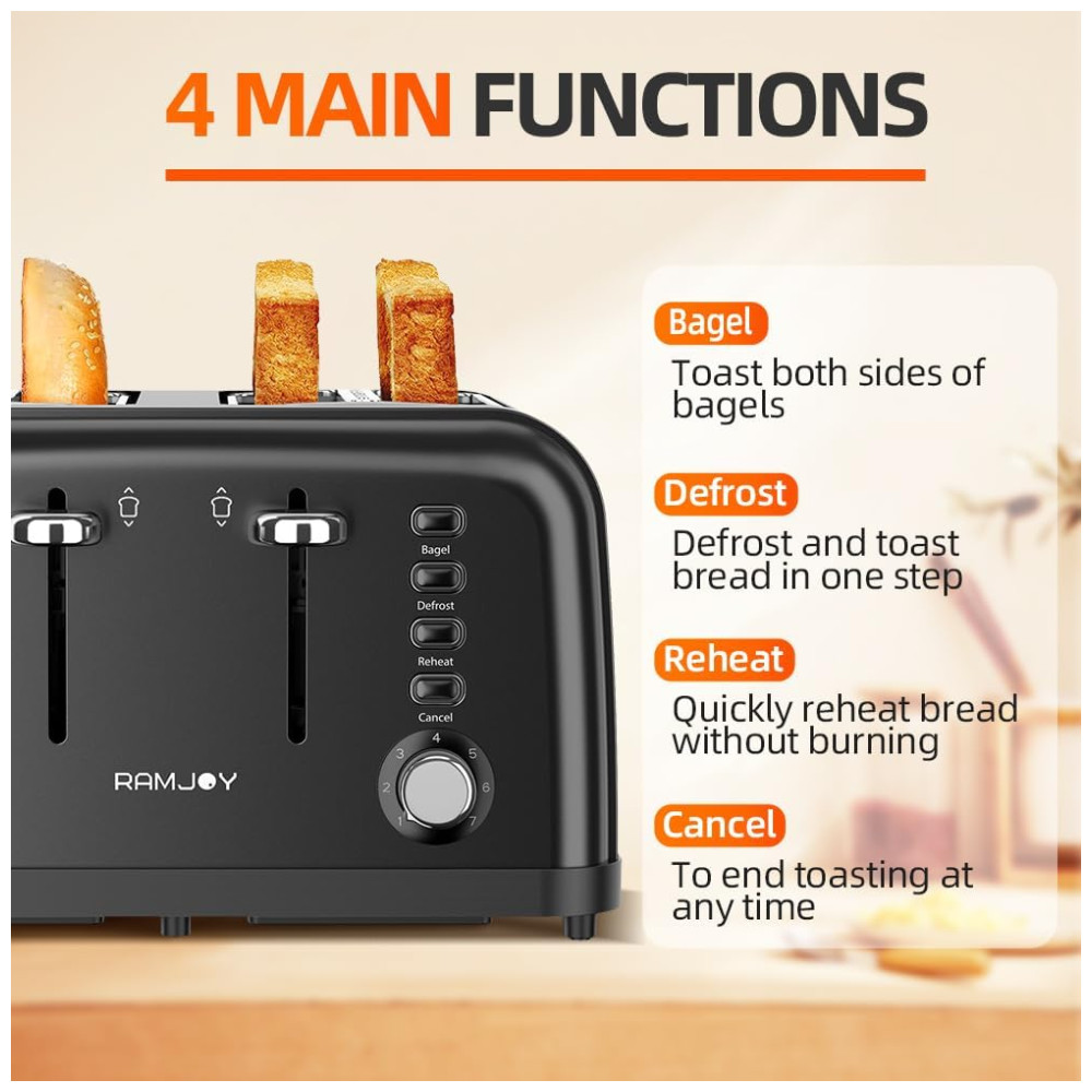 Torradeira 4 Fatias Preta Controles Individuais Espaço Extra Largo 7 Níveis de Tostagem 4 Funções Ideal para Pães Bagels e WafflesRAMJOY