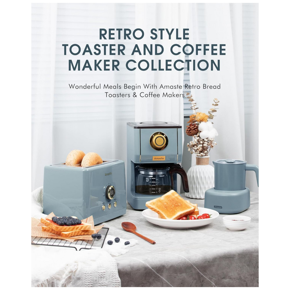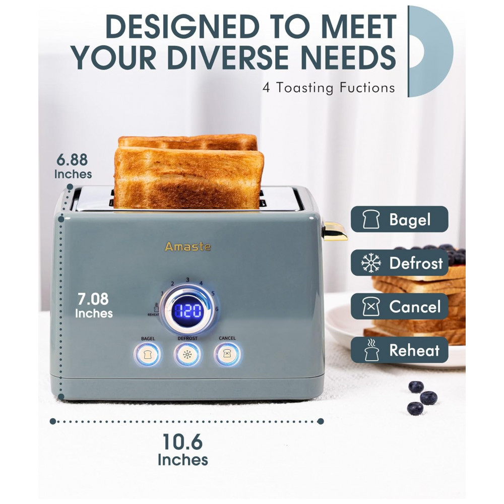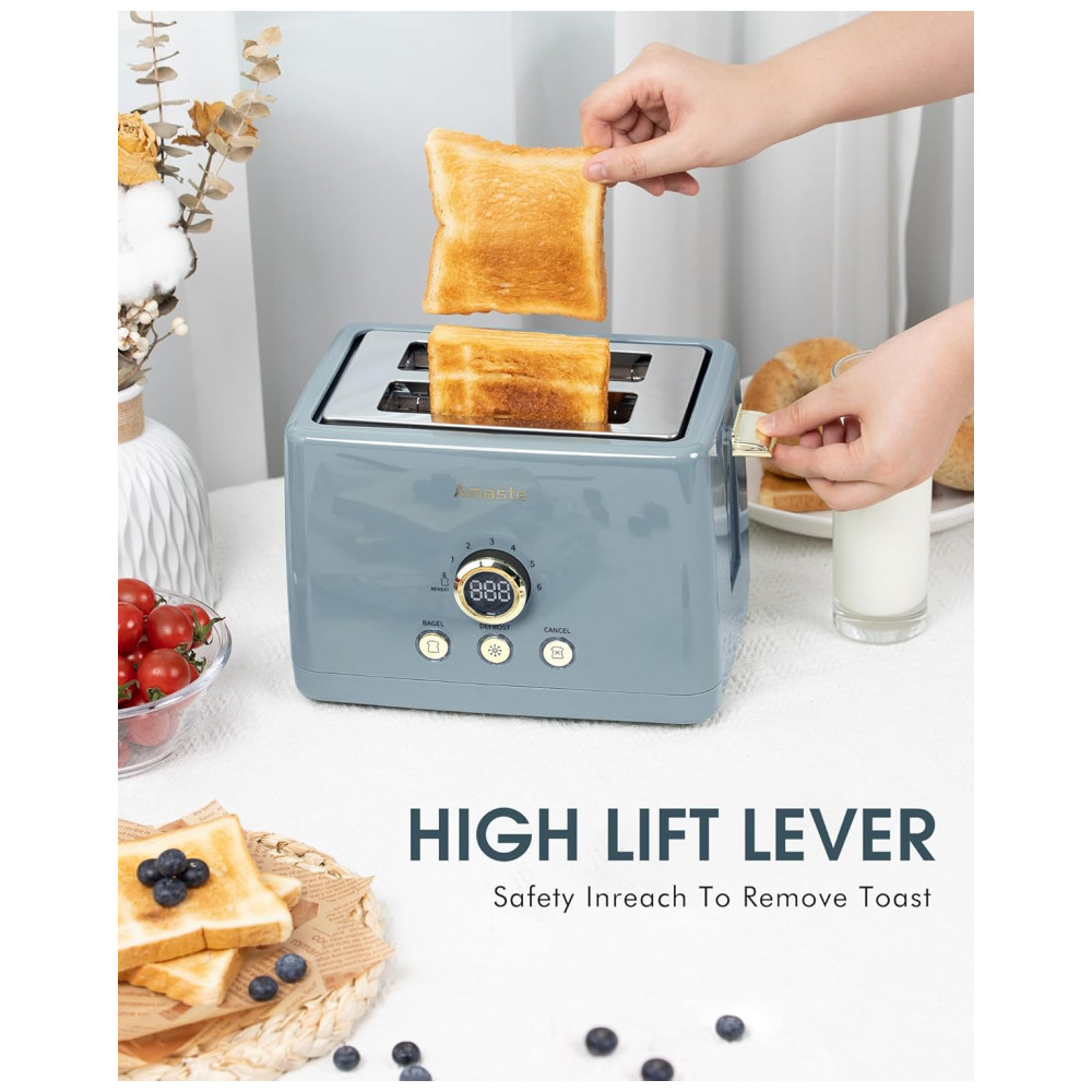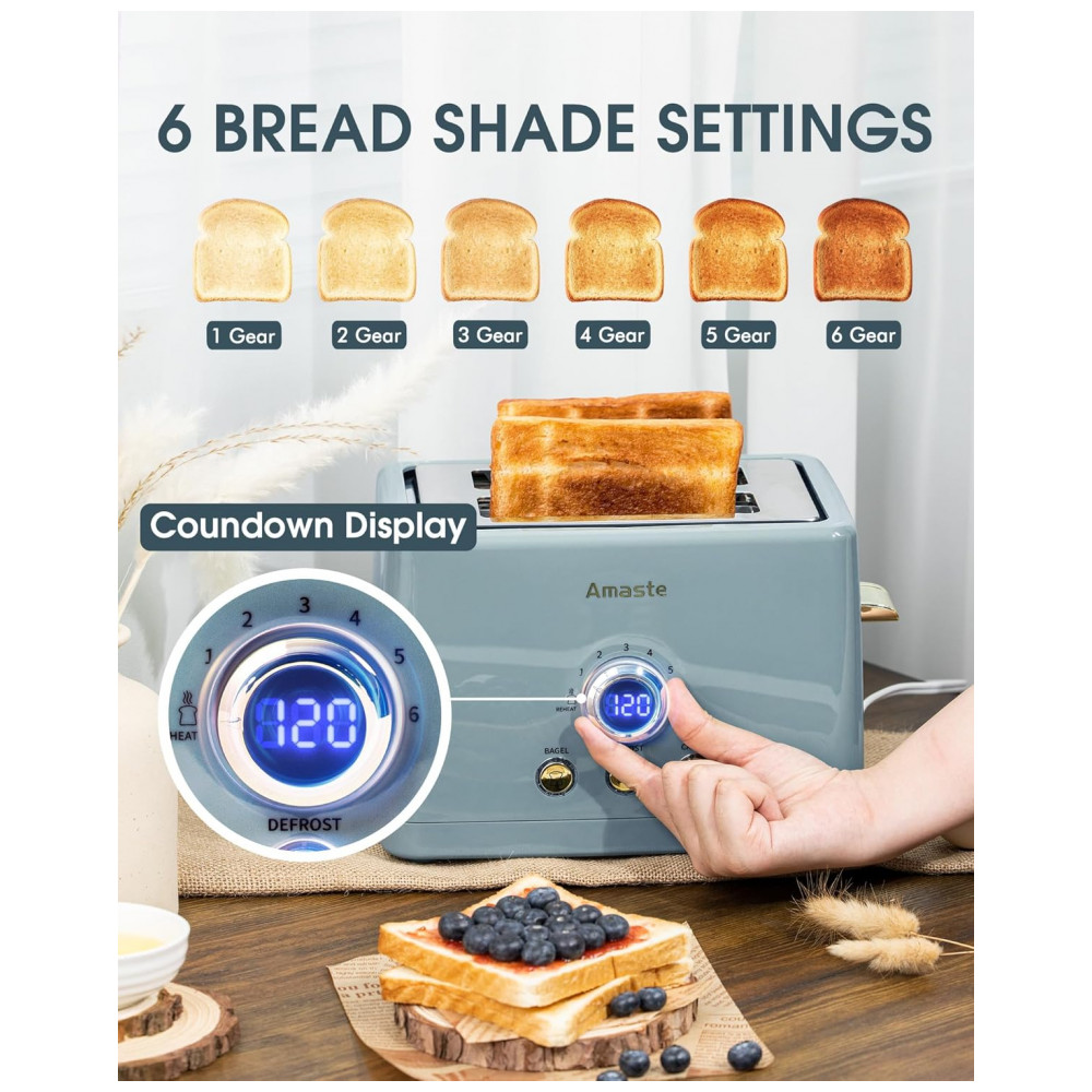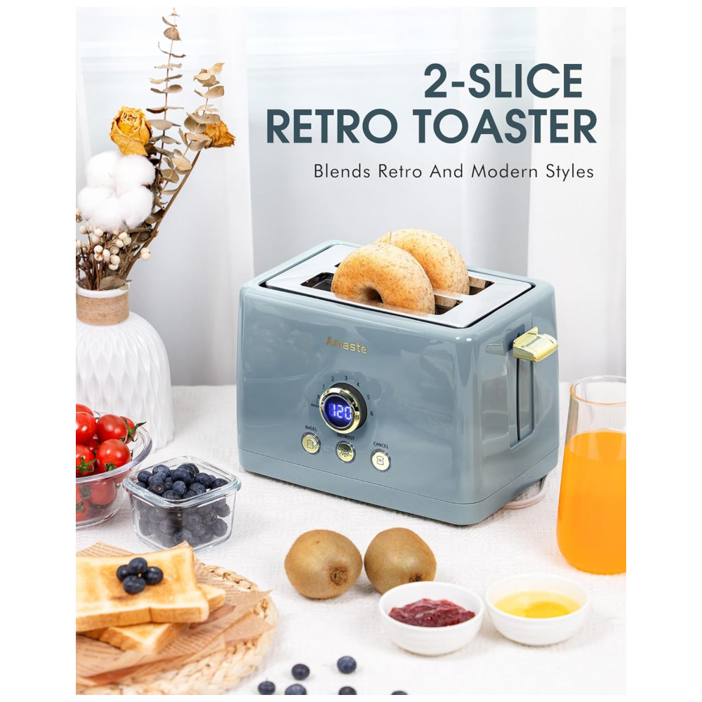Torradeira Amaste 2 Fatias Retro Azul Acinzentado Timer Digital LED 6 Níveis Bagel Descongelar Bandeja Removível MT-01 850W 110V