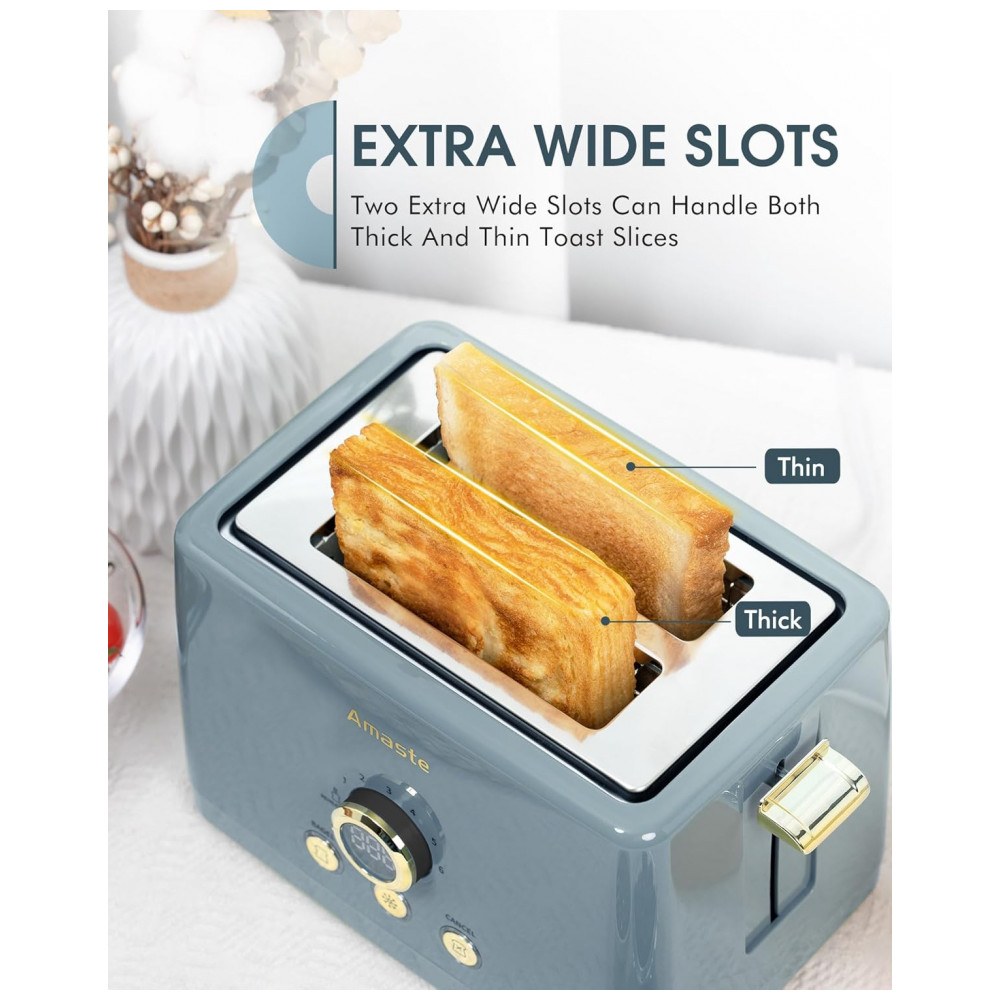 A Torradeira Amaste MT-01 combina estilo retrô com tecnologia moderna, apresentando acabamento em azul Ash e timer digital LED para controle preciso do preparo. Possui dois slots extra largos (3,8 cm) com guias centralizadoras automáticas, ideais para diferentes tipos e espessuras de pães, bagels e muffins. Conta com 6 níveis ajustáveis de tostagem, funções específicas para bagel, descongelar, reaquecimento e botão cancelar. Saída elevada facilita a remoção dos alimentos sem contato direto com o aquecimento. O sistema de 850W otimiza a eficiência energética e garante tostagem uniforme e rápida. A bandeja coletora removível simplifica a limpeza e os pés antiderrapantes proporcionam maior estabilidade durante o uso. Produto desenvolvido para ambientes residenciais, compatível com voltagem 110V.