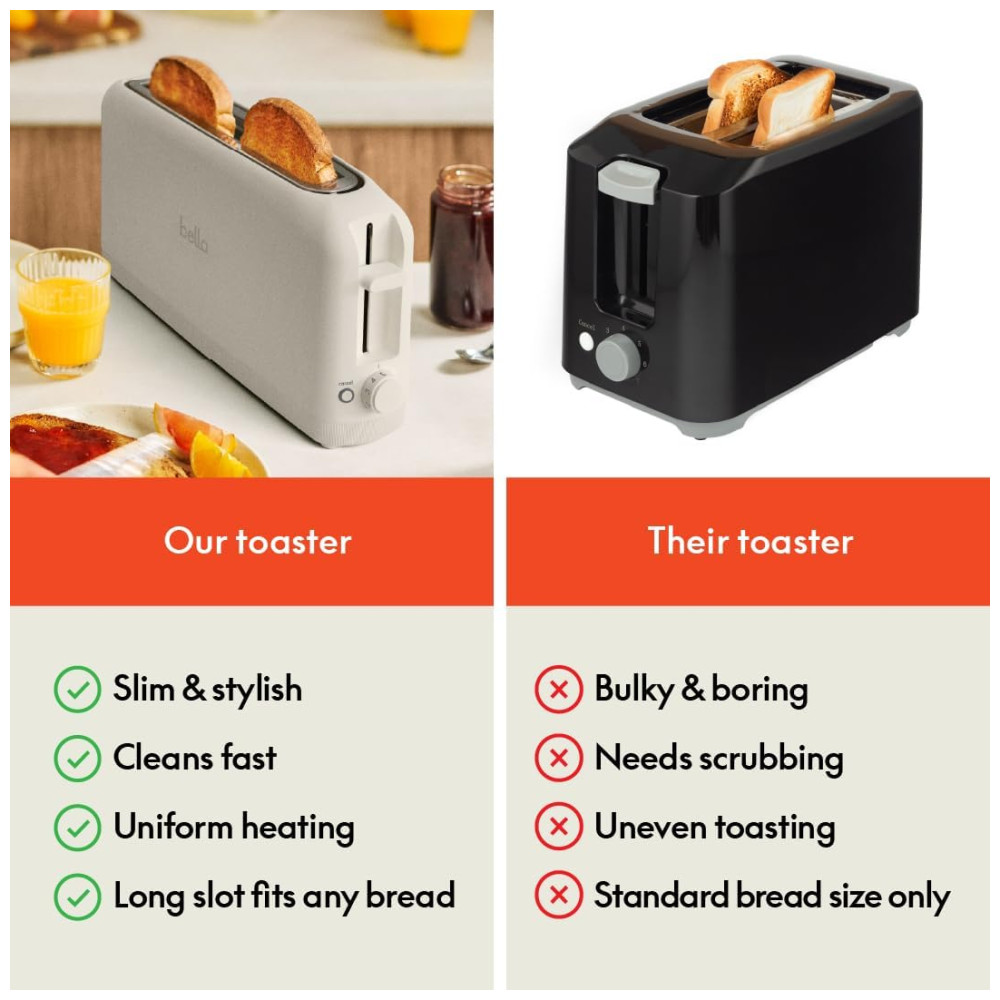 Design Slim, Grande Impacto: Com um perfil elegante de 9,1 cm de altura, a Torradeira Bella 2 Fatias Slim se ajusta confortavelmente em qualquer bancada, ocupando pouco espaço. Parte da nossa coleção Fits-anywhere de utensílios de cozinha, ela é a combinação perfeita de estilo e praticidade.