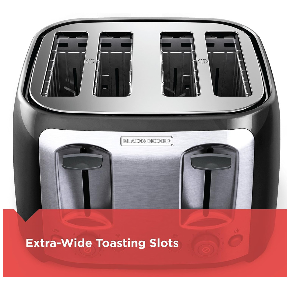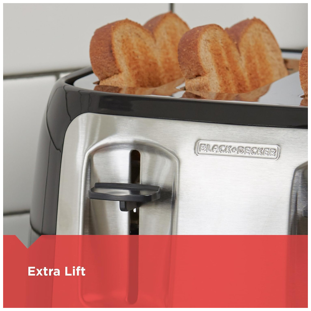 Prepare um café da manhã para toda a família com facilidade usando a Torradeira BLACK+DECKER de 4 Fatias. Esta torradeira preta e prateada oferece slots extra largos com guias auto ajustáveis que podem lidar com bagels grossos e pães artesanais, e a alavanca de elevação coloca tudo facilmente ao alcance. As opções de bagel e congelados controlam o tempo de tostagem para resultados ideais, e um botão de cancelamento permite que você interrompa rapidamente o processo. Além disso, a bandeja removível de migalhas facilita a limpeza e o enrolador de cabo integrado simplifica o armazenamento. O momento do café da manhã em família é mais tranquilo com a Torradeira BLACK+DECKER de 4 Fatias. SLOTS DE TOSTAGEM EXTRA LARGOS. Adicione uma crocância deliciosa a bagels, pães grossos e muito mais. Os slots extra largos acomodam todos os tipos de petiscos torrados. FUNÇÃO DE BAGEL Deixe seu bagel da manhã perfeitamente crocante usando a função de bagel. Também controla itens congelados e o término da tostagem. ELEVADOR EXTRA A alavanca eleva a torrada para que esteja segura ao alcance. BANDEJA REMOVÍVEL DE MIGALHAS Mantenha o balcão limpo e a cozinha cheirosa. A bandeja de migalhas permite que você as remova antes de queimarem ou sujarem sua cozinha. SELETOR DE TONALIDADE Encontre a tonalidade certa para o gosto de todos. O botão seletor de tempo varia de 17 a 7.