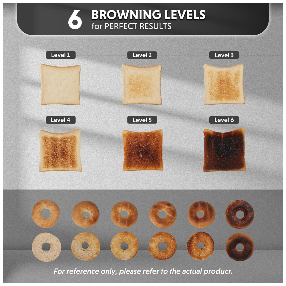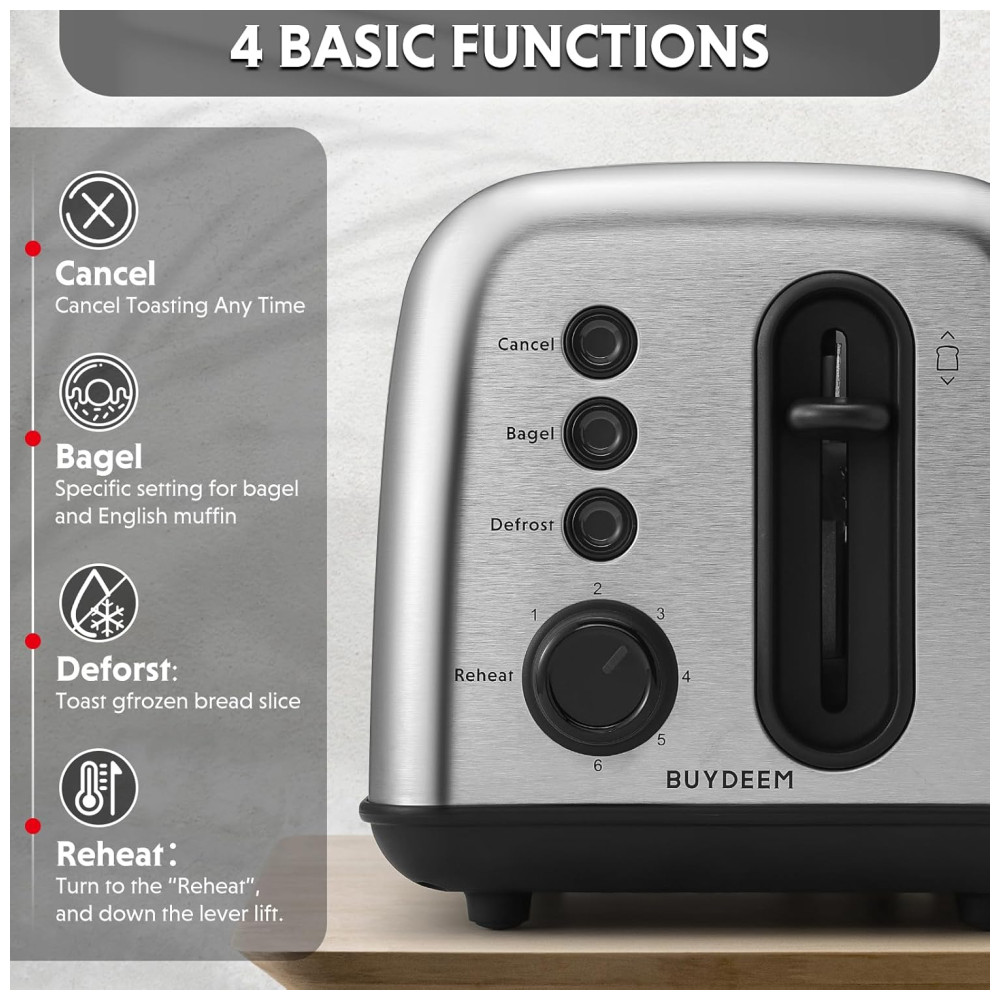 A mais recente torradeira BUYDEEM DT420 de 2 fatias combina funcionalidade e estilo em um design compacto.Equipada com 2 slots largos, guias auto-centralizadoras e alavanca de elevação alta, é perfeita para torrar diferentes tipos de pães. Com 6 ajustes de tostagem, incluindo bagels, muffins e função de descongelamento, esta torradeira de aço inoxidável prateado atende perfeitamente às suas necessidades diárias de torradas. Além disso, possui funções de reaquecimento, cancelamento e descongelamento, sendo simples de usar e garantindo resultados perfeitos toda vez que for utilizada.