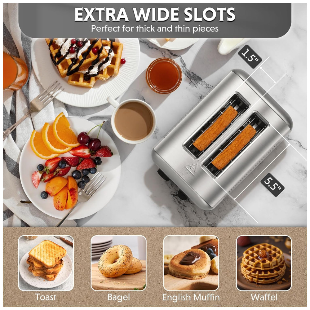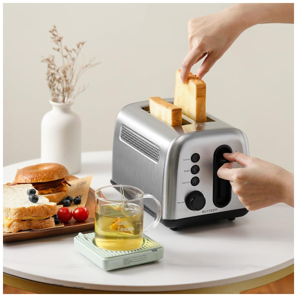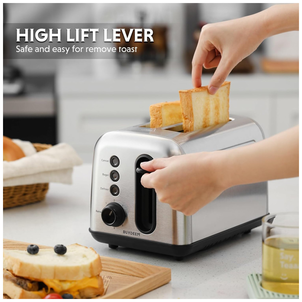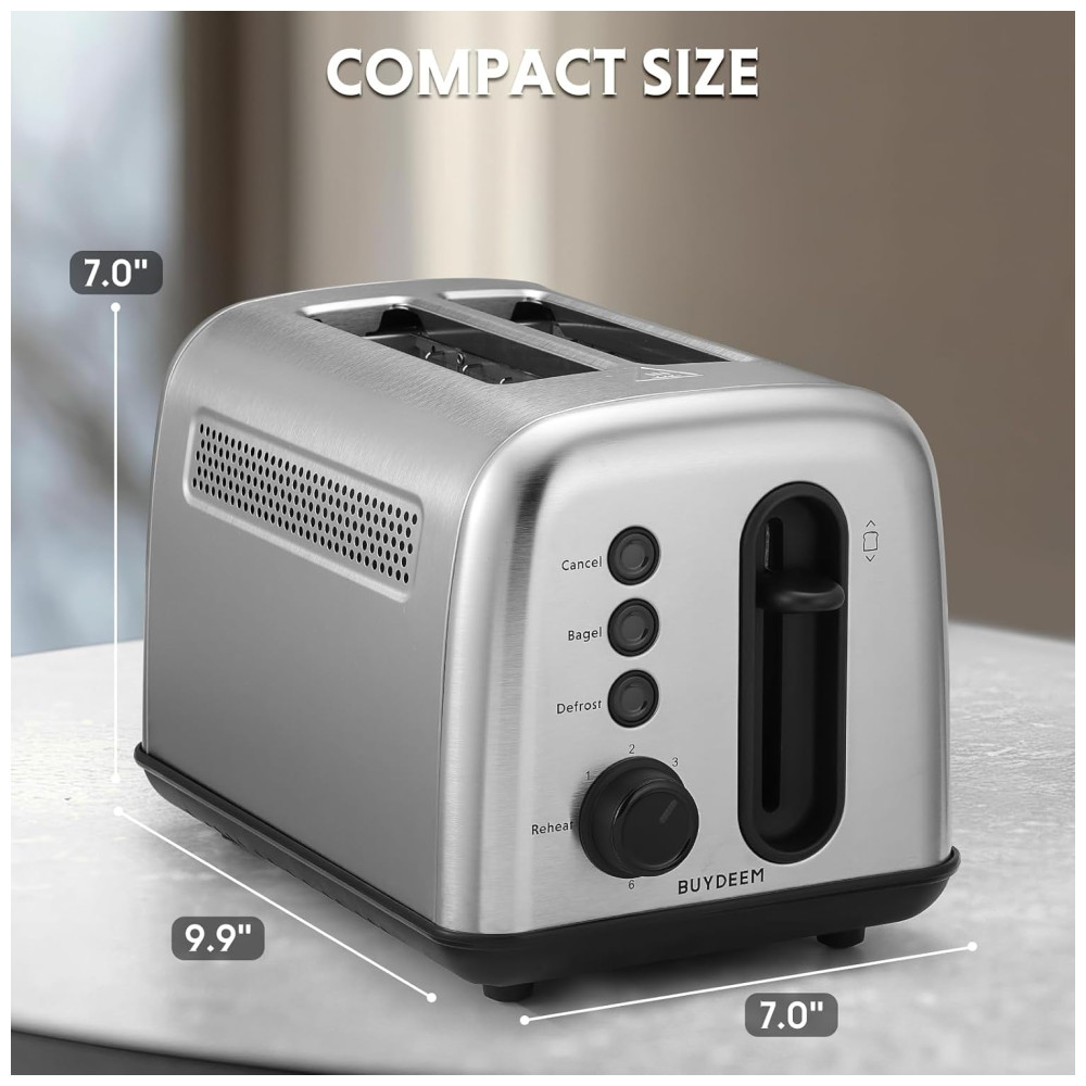 Torradeira BUYDEEM DT420 2 Fatias em Aço Inoxidável com Slots Extra Largos 6 Configurações de Tostagem Design Compacto Retro Prateado