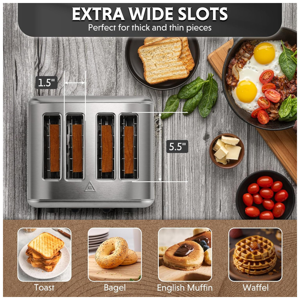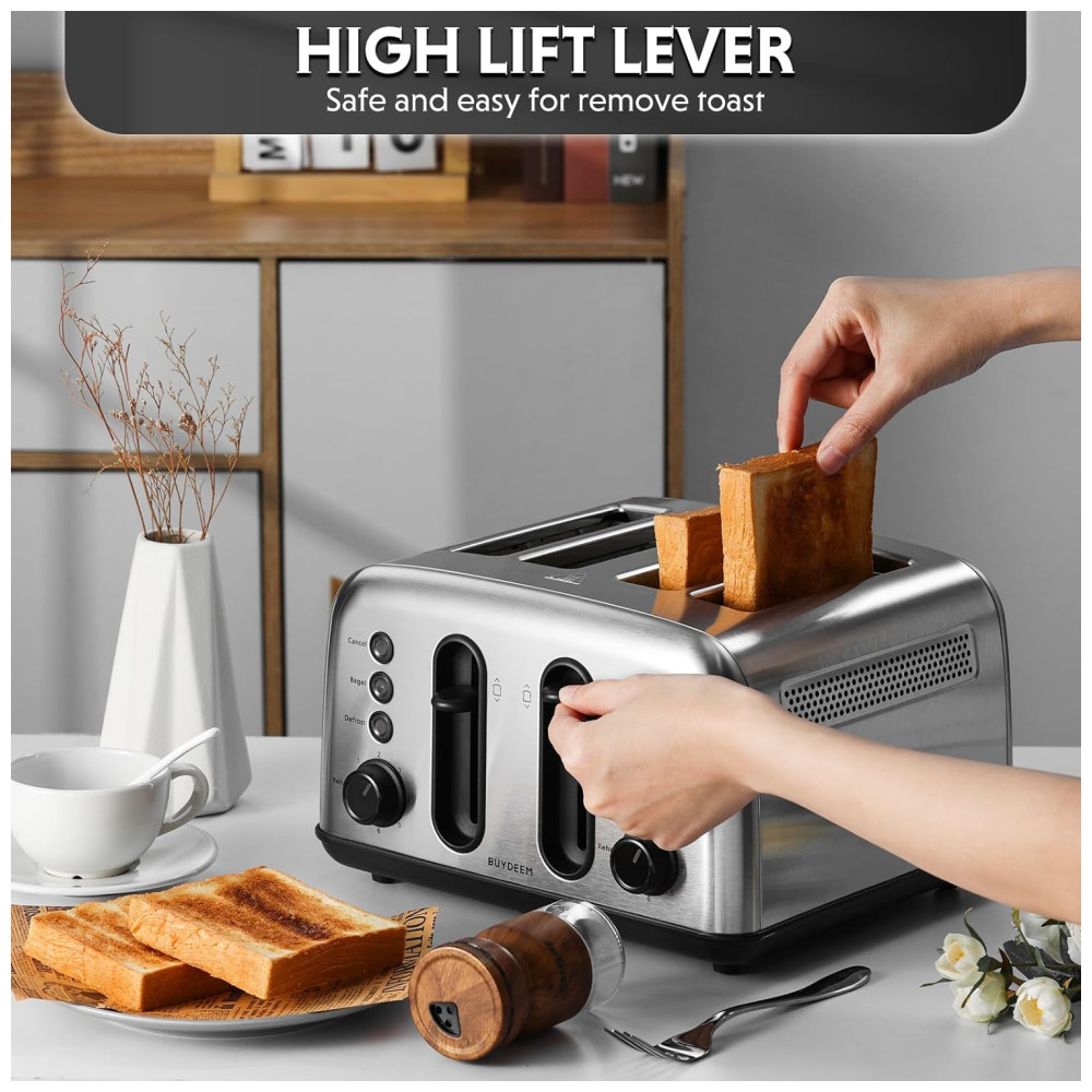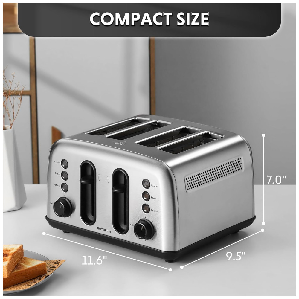 Torradeira BUYDEEM DT440 4 Fatias em Aço Inoxidável com Slots Extra Largos para Bagels e Muffins Controle de Tostagem Design Retro Prateado