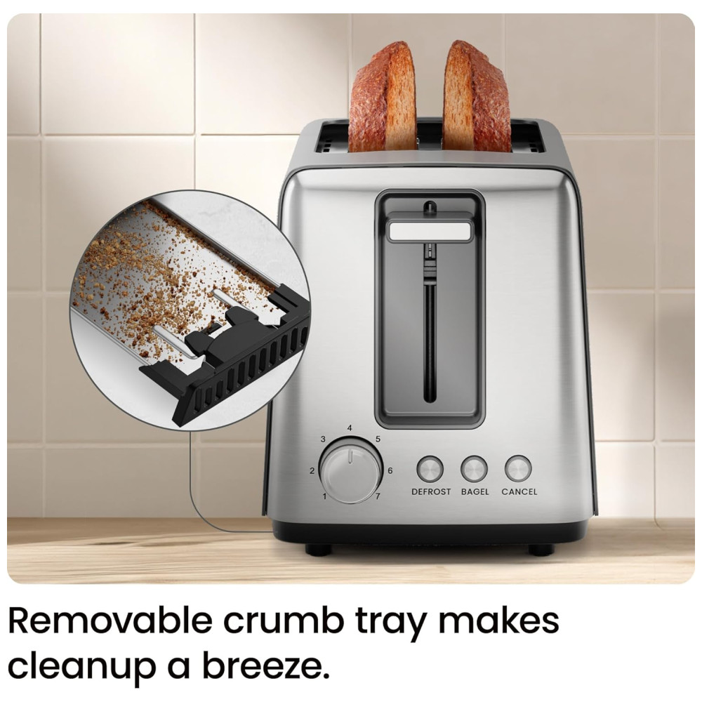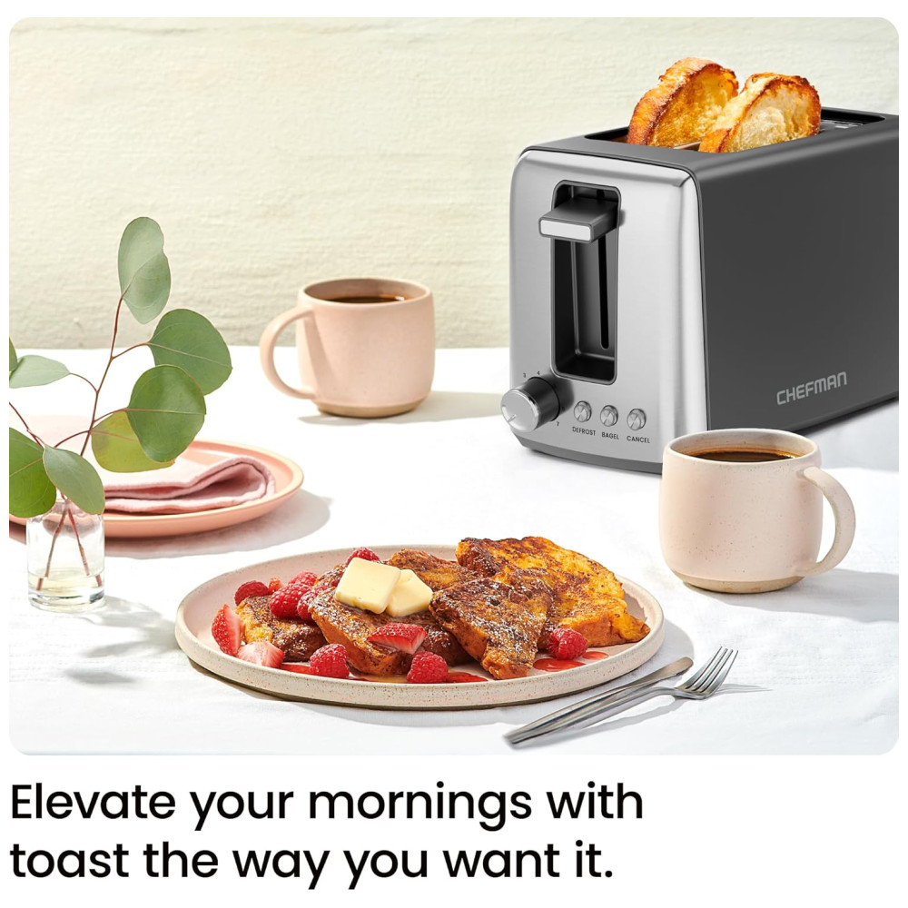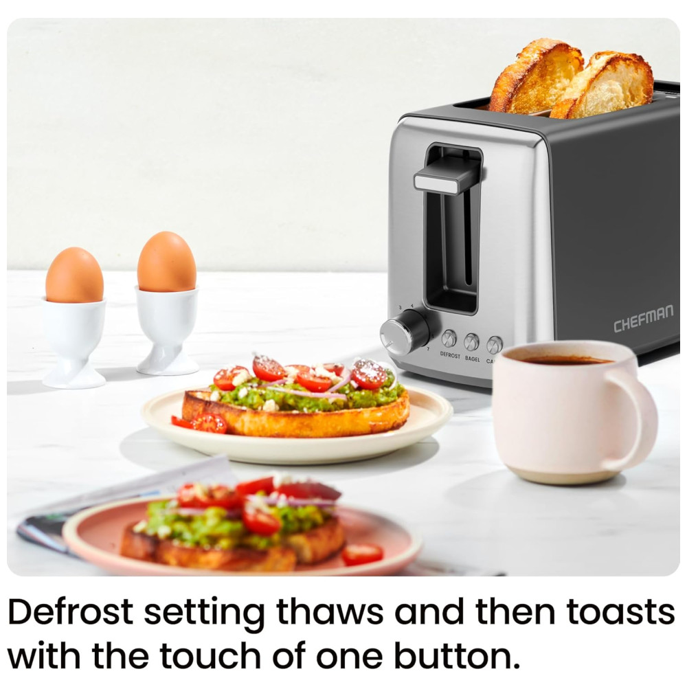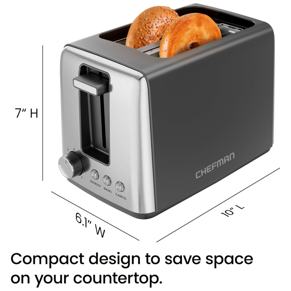 Desfrute de torradas perfeitamente douradas com a torradeira Chefman de 2 fatias. Escolha entre 7 configurações de tostagem para obter o nível ideal de crocância. Com 3 modos de cozimento, incluindo bagel e descongelamento, você terá torradas crocantes e waffles tostados na medida certa. A função bagel tosta o lado cortado do seu bagel e aquece a crosta externa, perfeito para muffins ingleses. Com indicadores LED, limpeza fácil com bandeja de migalhas removível e tecnologia antitravamento para uma torrada mais segura. Esta torradeira de alta qualidade em aço inoxidável possui 750 watts de potência e 7 configurações de tostagem. Moderna e durável, é a combinação perfeita de funcionalidade e estilo para sua cozinha.