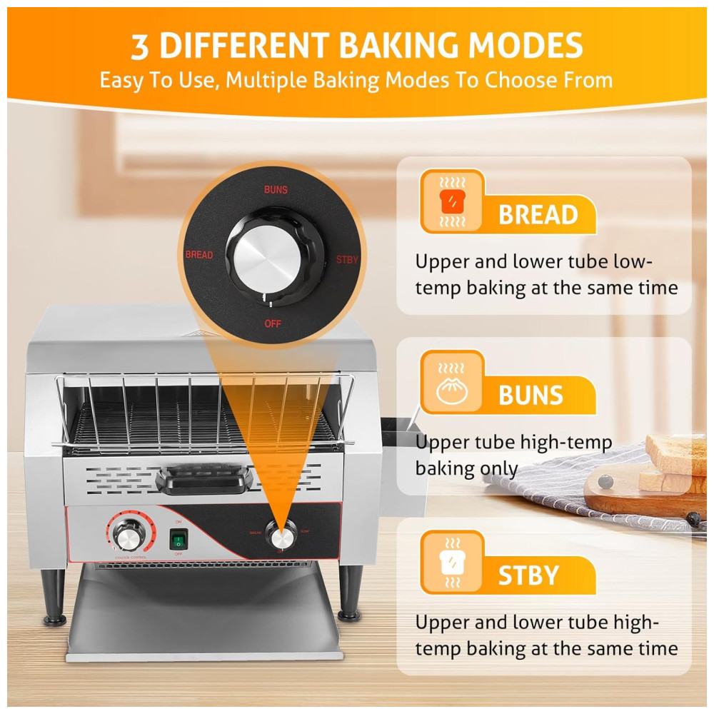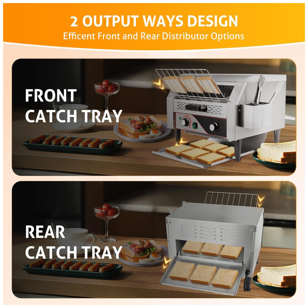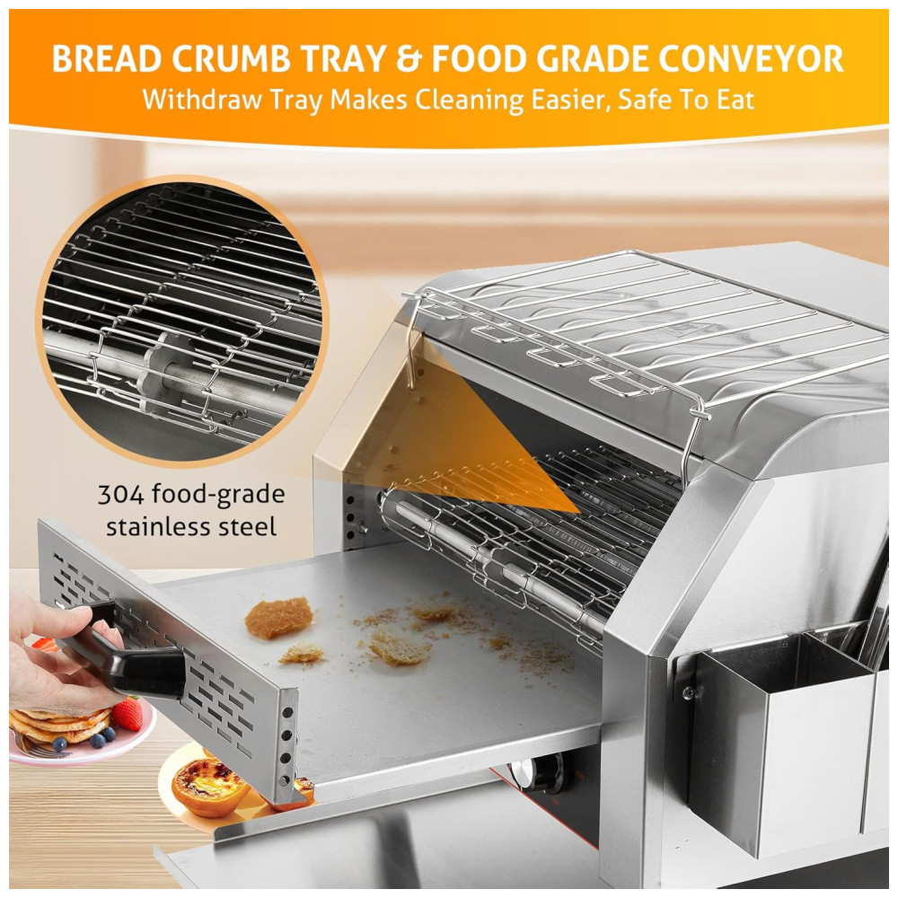 Construída em aço inoxidável de qualidade comercial, a torradeira possui uma corrente de transporte automática de aço inoxidável grau alimentício, que assegura a manipulação segura e homogênea dos produtos, aumentando a produtividade e mantendo a segurança alimentar. O design inclui saídas duplas frontais e traseiras para melhorar o fluxo de trabalho, adaptando-se a diferentes layouts de cozinha.