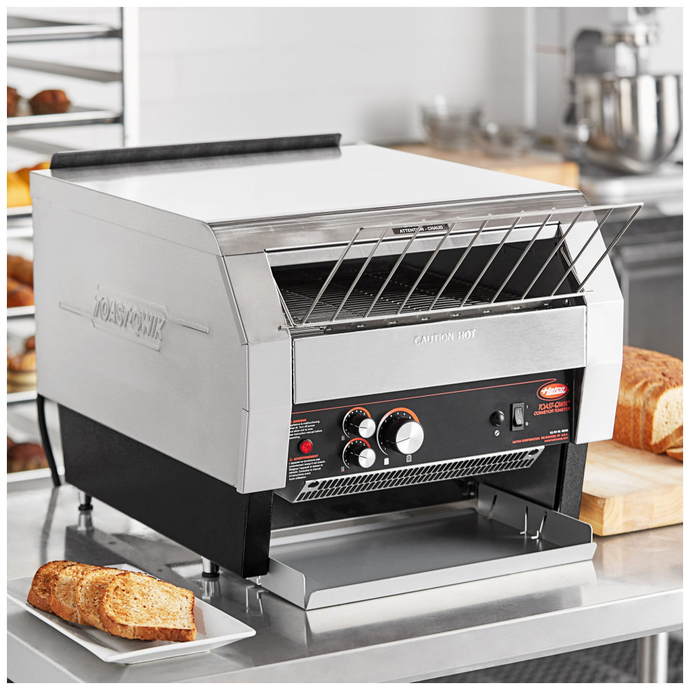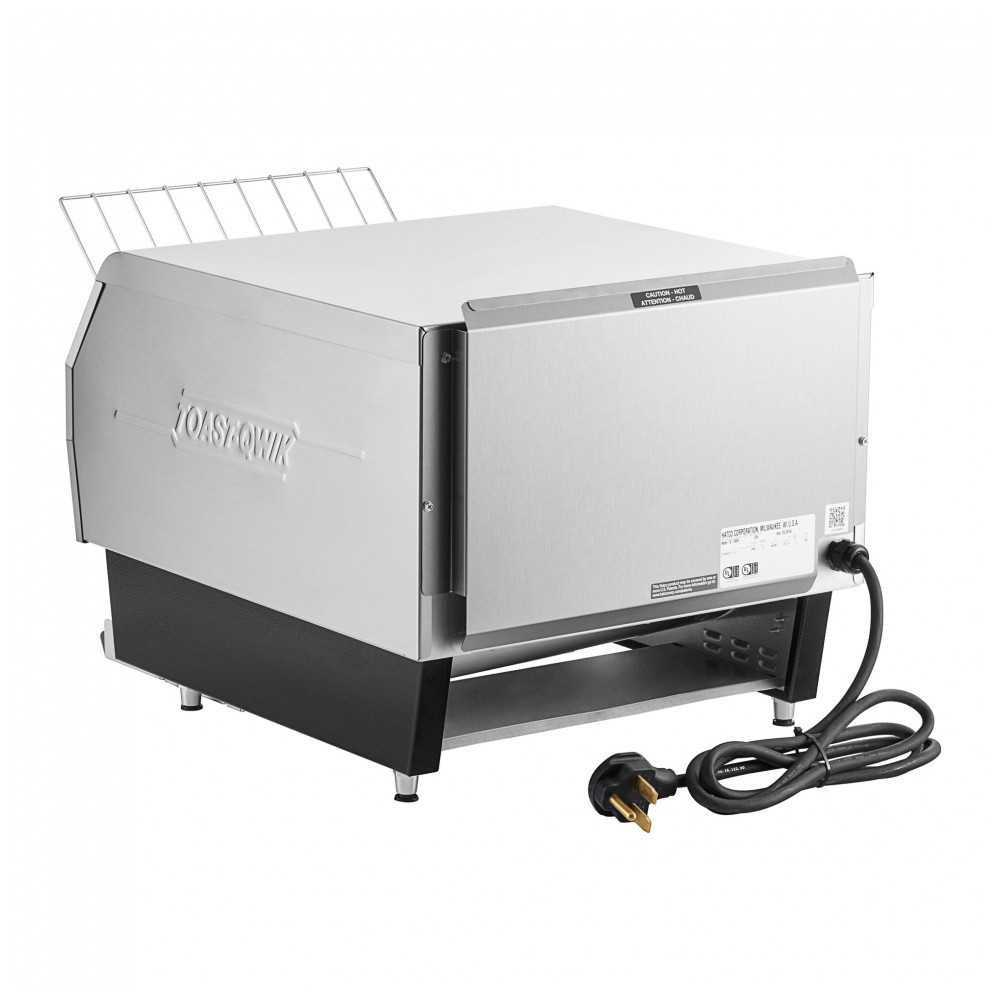 A Hatco TQ-1800H Toast Qwik é uma torradeira conveyor horizontal para bancada, indicada para alto volume em buffets de café da manhã e cozinhas comerciais, com capacidade de até 1200 fatias de pão por hora. Equipada com abertura de 7,6 cm para pães grossos como texas toast, bagels e muffins ingleses, utiliza sistema ColorGuard que monitora temperatura da câmara via sonda e ajusta automaticamente a velocidade da cinta para manter consistência na torra.